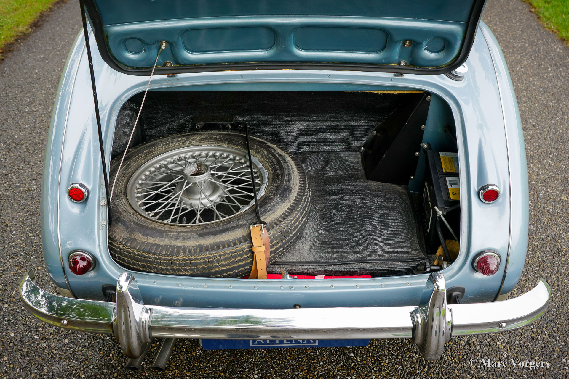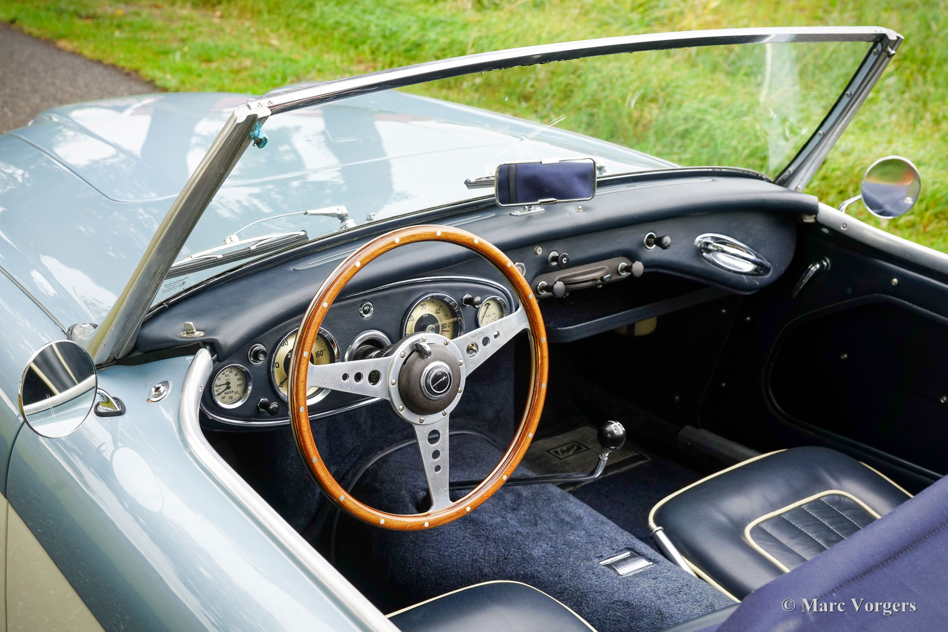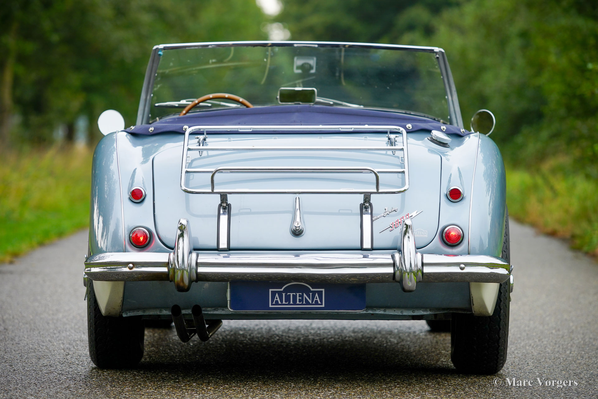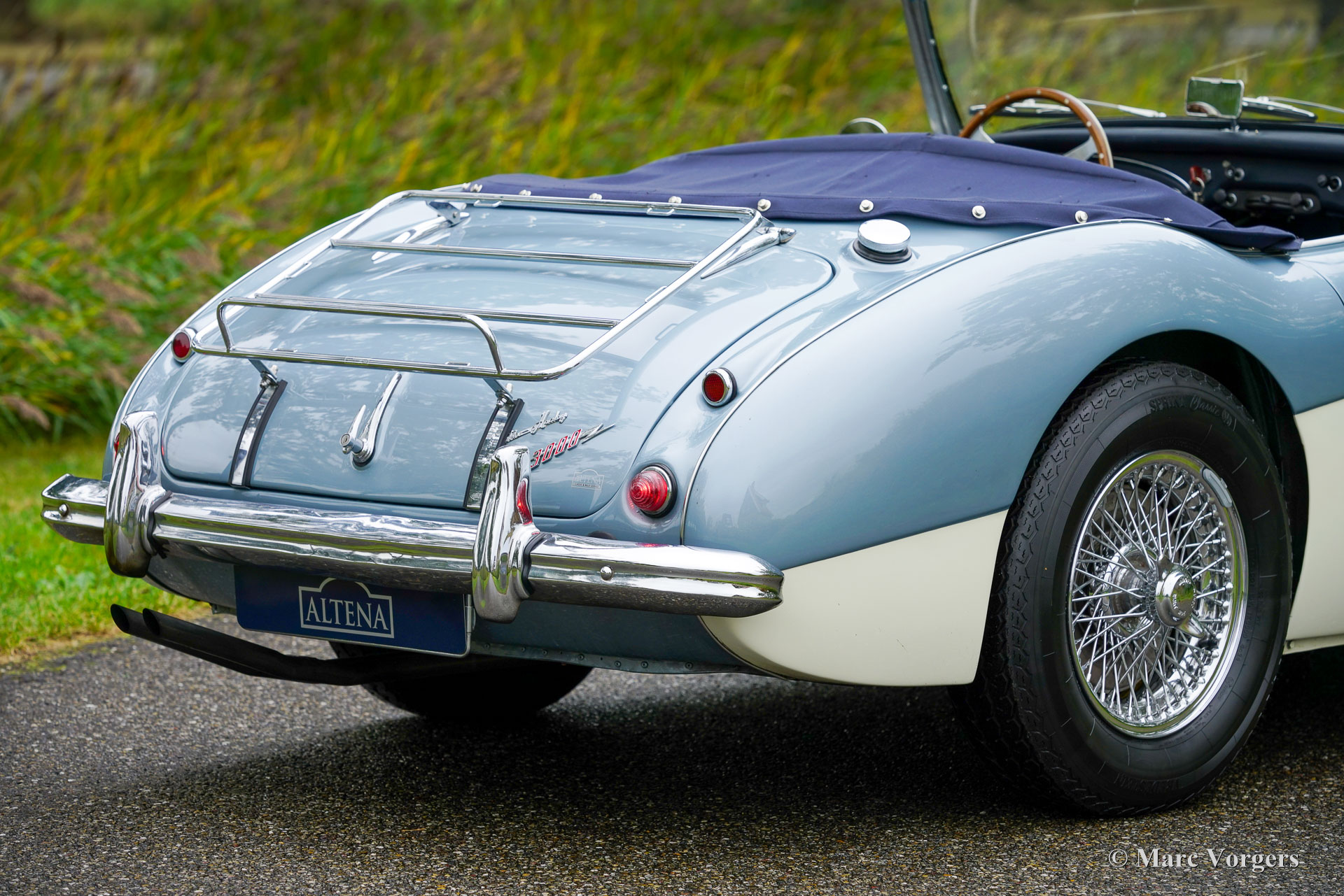 Austin Healey 3000 MK II, Jahr 1961. Fahrgestellnummer HBT7L15775, Motornummer 29E/RU/H1991. Dies ist ein seltenes Austin Healey 3000 Mk II 3-Vergaser-Modell, von dem nur 5096 Exemplare gebaut wurden. Die Karosserie ist in Eisblau-Metallic über cremeweiß gehalten, kombiniert mit einer blauen Innenausstattung mit blauen Ledersitzen mit weißen Paspeln, einem blauen Armaturenbrett und Türverkleidungen aus Kunstleder sowie einem blauen Teppich. Das blaue Stoffverdeck und die Persenning sind aus blauem Mohair, und ein Paar Aluminium-Seitenscheiben mit Plexiglasfenstern vervollständigen die Wetterausrüstung. Dieser wunderschöne „Big Healey“ wurde neu in den USA verkauft und das Auto wurde 2005 von Louisiana in die Niederlande verschifft. In den Jahren 2005 bis 2007 wurde das Auto umfassend und bis zur Perfektion restauriert. Ein Restaurierungslogbuch und ein Fotobericht sind vorhanden. Die Restaurierung wurde von drei renommierten Spezialisten durchgeführt: Der Motor wurde von der Firma van Giersbergen überholt, die Karosserie von der Firma van Emst restauriert. Die übrigen mechanischen Komponenten wurden von Altena Classic Service überholt und restauriert. Wir haben dem Besitzer bei der Fertigstellung dieses herrlichen Austin Healey geholfen. Nachdem er das Auto zwanzig Jahre lang sehr genossen hatte, bat er uns, ein gutes neues Zuhause dafür zu finden. Das Auto weist leichte Gebrauchsspuren auf und ist in einem sehr guten Zustand! Der Motor klingt und läuft wunderbar, und das Auto fährt perfekt. Der Healey ist ausgestattet mit Chromspeichenrädern mit Vredestein Sprint Classic-Reifen, verchromten „Knock-on“-Radmuttern, einem Chromgepäckträger, zwei verchromten, an den Türen montierten Rückspiegeln, einem MotoLita-Lenkrad mit Holzkranz, Scheibenbremsen vorne und einem Edelstahlauspuff. Dies ist ein großartiger „Big Healey“ in einem sehr guten, restaurierten Zustand und in den beliebtesten Farben. Ein fantastischer Oldtimer, der Ihnen großartige Momente intensiven Fahrspaßes mit offenem Verdeck bescheren wird!