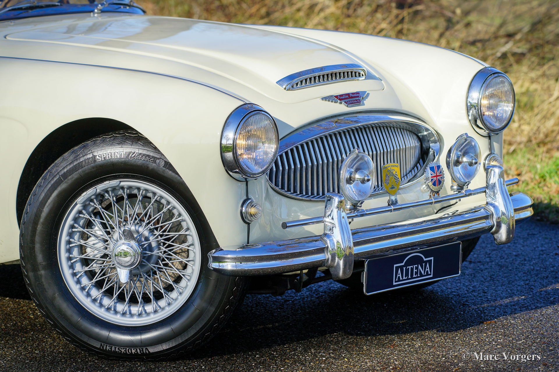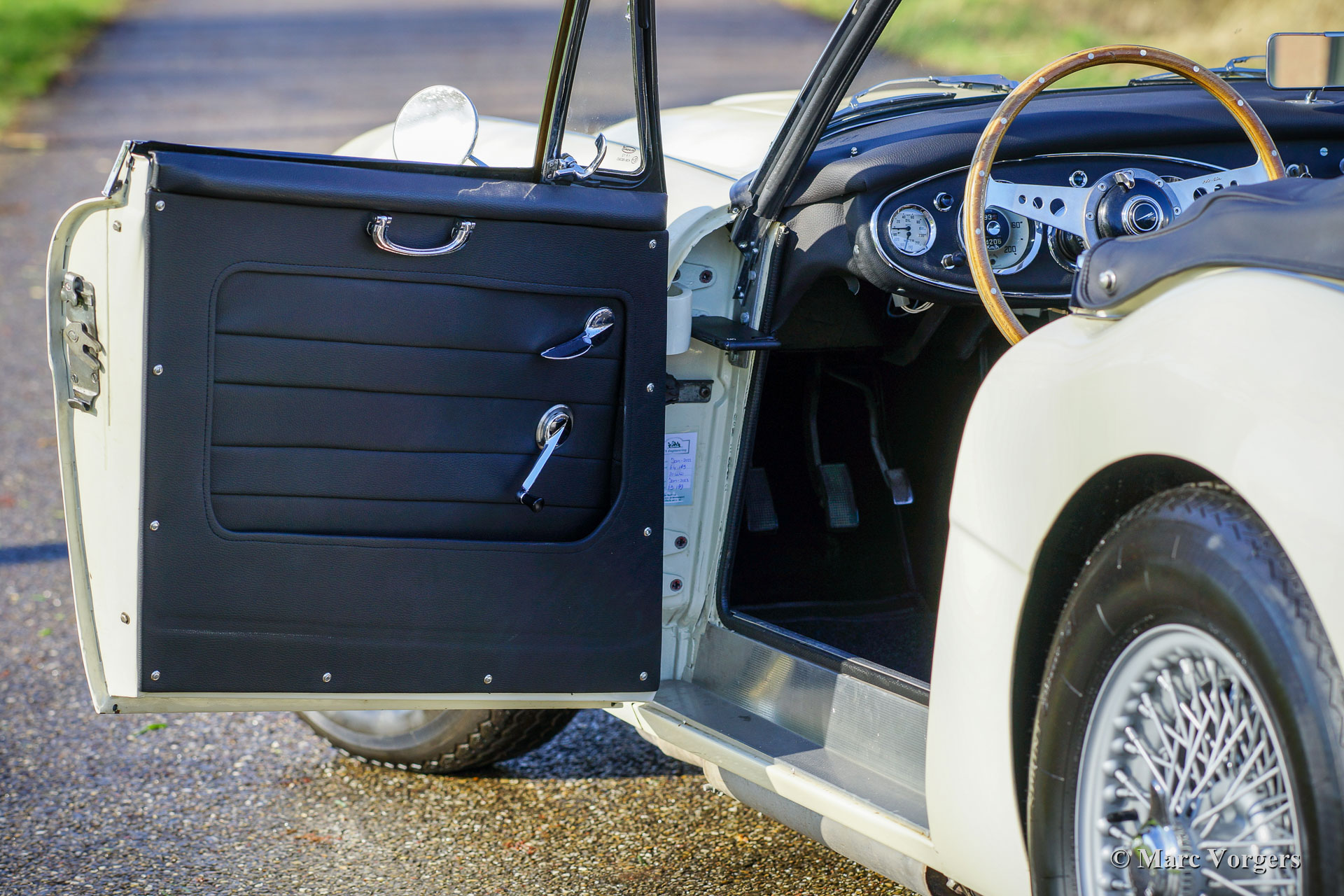 Austin Healey 3000 Mk IIa „Convertible“, Jahr 1962. Farbe weiss (Old English White) kombiniert mit einer schwarzen Lederausstattung mit weißen Paspeln und schwarzem Teppich. Verdeck, Verdeckabdeckung und Persenning aus schwarzem Vinyl. Dieser wunderschöne Austin Healey wurde in der Vergangenheit umfassend restauriert, das Auto ist in einem sehr guten bis exzellenten Zustand und das Auto fährt perfekt. Wir haben diesen „Big Healey“ in der Vergangenheit an den jetzigen begeisterten Besitzer verkauft, dieses feine Automobil wird seit vielen Jahren in unserer Werkstatt gewartet. Alle Servicerechnungen sind vorhanden. Das Auto ist ausgestattet mit Overdrive, silber lackierten Speichenrädern, Vredestein Sprint Classic-Reifen, einer verchromten „Badge Bar“ mit wunderschönen Vintage-Emblemen, einem Paar Lucas SLR 576-Scheinwerfern, und einer Wechselstrom-Lichtmaschine, die in das originale Dynamogehäuse eingebaut ist. Dieser wunderschöne Austin Healey stammt aus der begehrten Mk 2 „A“-Serie, die den Namen „Convertible“ erhielt. Dieses Modell war der erste Austin Healey mit in der Türen absenkbare Fenstern und dem einfach zu bedienenden Softtop! Das Auto wird komplett mit der originalen Bedienungsanleitung geliefert und das Auto kann in jedes Land Weltweit exportiert / importiert werden. Ein sehr begehrter ‘Big Healey’ in einem sehr gutem bis ausgezeichnetem Zustand!
