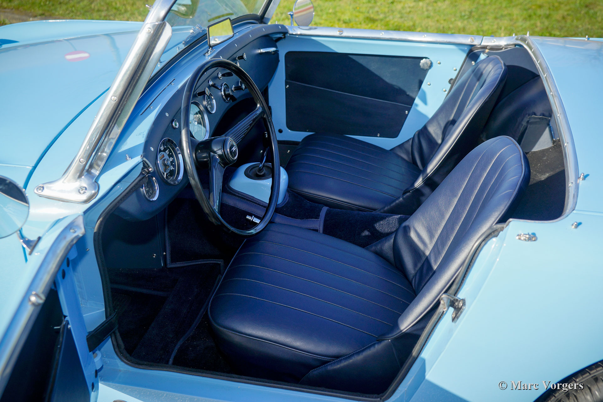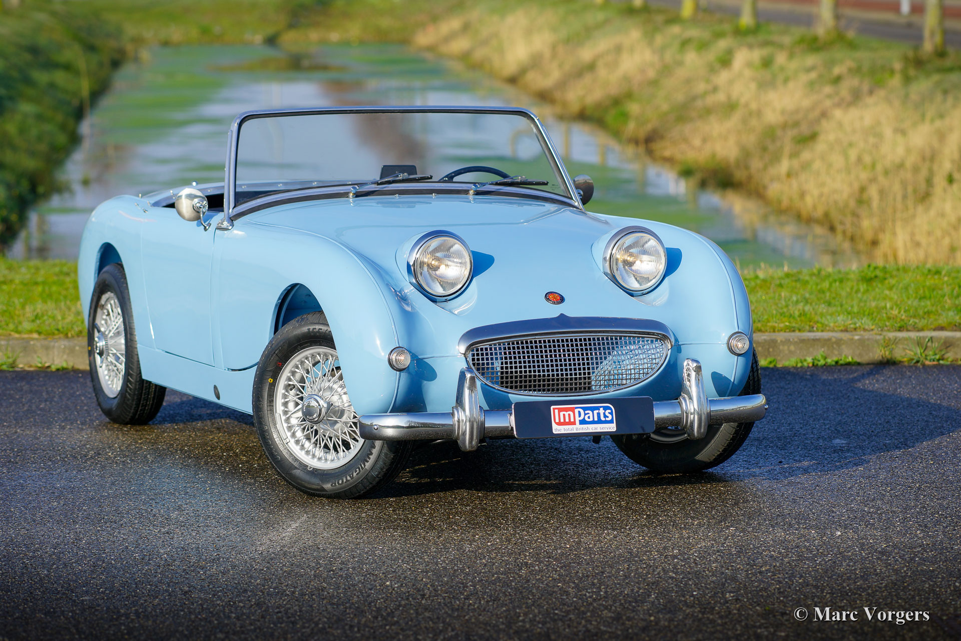 Austin Healey Sprite MK I ‘frog-eye‘, Jahr 1960. Farbe Irisch blau kombiniert mit einem dunkelblauen Interieur und einem dunkelblauen Teppich. Dunkelblaues Vinyl-Verdeck und Seitenfenster-Rahmen aus Aluminium. Dieses wunderschöne Healey Sprite wurde umfassend restauriert und es befindet sich in einem hervorragenden TOP-Zustand (concours)! Während der Wiederherstellung wurden Scheibenbremsen an den Vorderrädern montiert. Der Sprite MK I wurde in Großbritannien als ‘Frog-Eye‘ und in den USA als ‘Bug-Eye‘ bezeichnet. Dieser fantastische Austin Healey Sprite ist immer noch versehen von dem originalen Vierzylindermotor mit 948 ccm (Austin A-Serie) und seinem manuell betätigten 4-Gang-Getriebe. Dieses sehr schöne Beispiel verfügt über silber lackierte Speichenräder und es zeigt alle Originaldetails wie das seltene Originallenkrad! Ein sehr begehrenswertes Healey-‘Froschauge‘ in einem hervorragenden restaurierten Zustand!