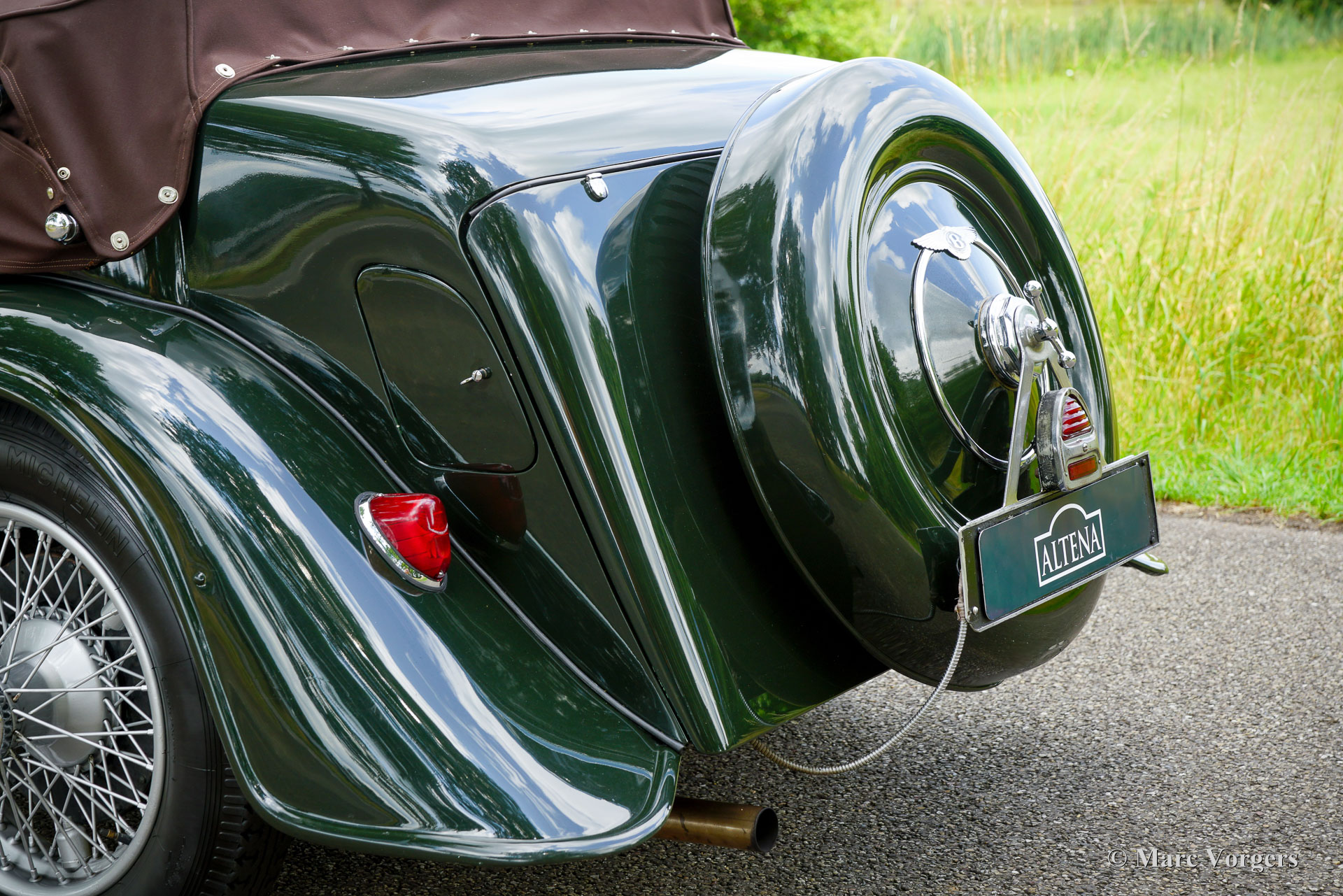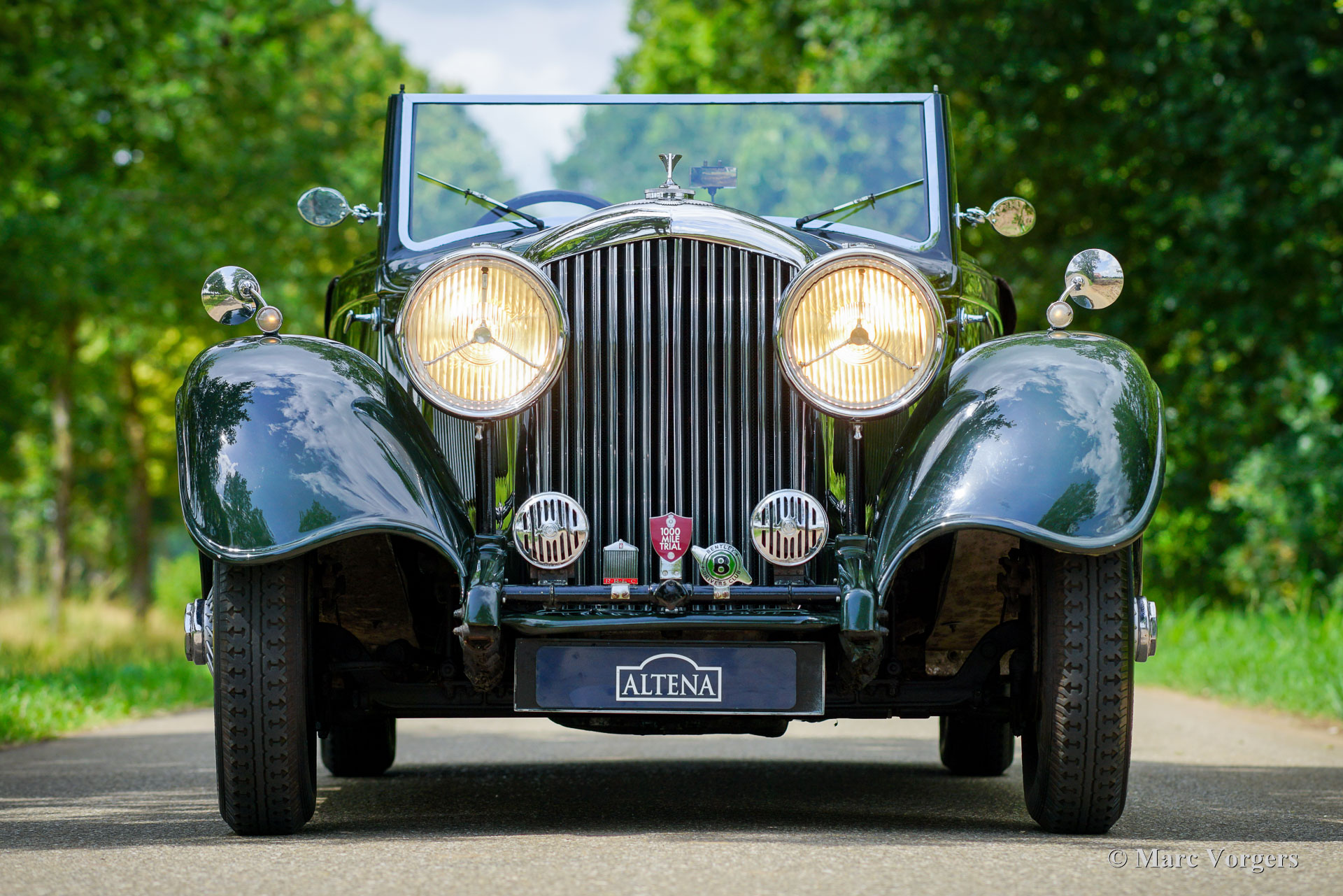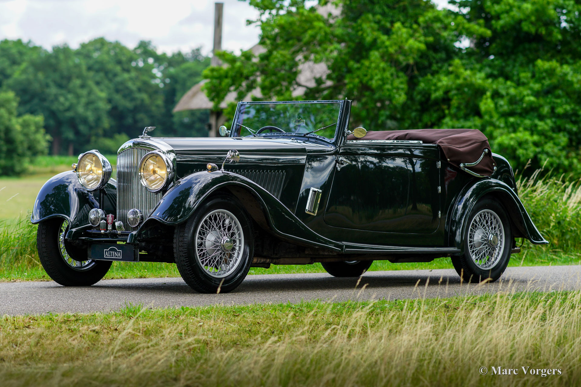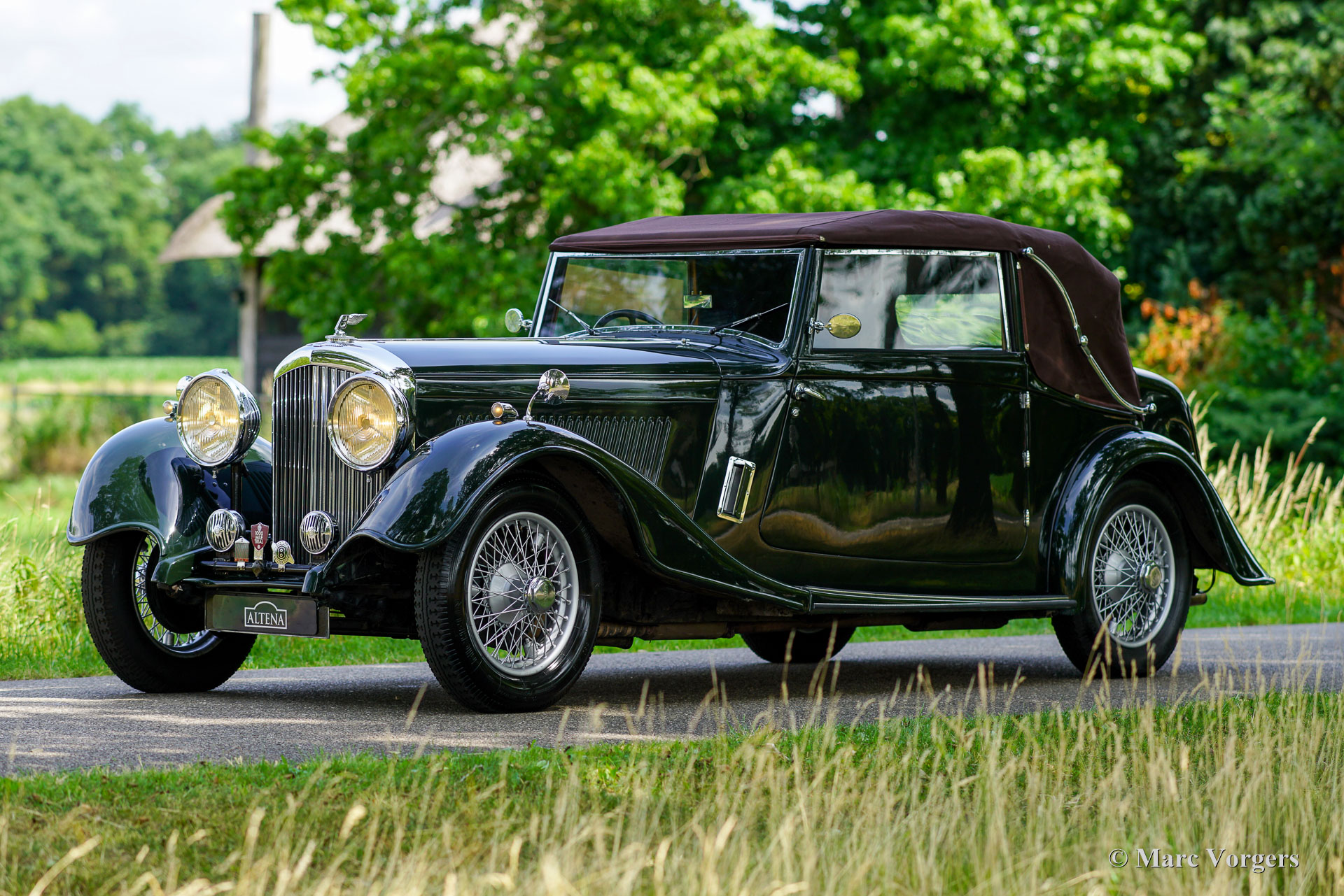 „Derby“ Bentley 3 ½ Liter „Park Ward“, Jahr 1934. Farbe dunkles British Racing Green kombiniert mit dunkelroter Lederausstattung und grauem Teppich. Dunkelbraunes Verdeck und Verdeck-Abdeckung. Dieser prächtige „Derby“ Bentley 3 ½ Liter wurde in Großbritannien neu verkauft. Das Auto ist in einem atemberaubenden Originalzustand und hat die originale „Park Ward“ offene Tourer-Karosserie mit 3-Positionen-Verdeck. Dieser fast 90 Jahre alte Bentley ist eine prächtige Zeitkapsel mit allen originalen Details und einer wunderbaren Patina. Der Bentley ist mechanisch und technbisch auf dem neuesten Stand und das Auto ist bereit, von einem neuen Besitzer genossen zu werden, der die Bedeutung dieses Originalstücks des Bentley-Erbes zu schätzen weiß. Die Historie kennt man vom ersten Tag an, ebenso die Namen aller Vorbesitzer. Altena Classic Service hat das Auto vor kurzem aus Großbritannien in seine niederländischen Ausstellungsräume gebracht. Das Auto ist noch in Großbritannien zugelassen. Dieser super originale Bentley 3 ½ Liter wurde wunderschön gewartet und gepflegt. In den letzten Jahren wurden das Getriebe und die Vergaser überholt, der Overdrive wurde von Tim Payn neu aufgebaut. 2017 wurde die Karosserie in Originalfarbe neu lackiert. Dieser „Grand Tourer“ hat an mehreren wichtigen Veranstaltungen wie dem Flying Scotsman und dem Shamrock 1000 Mile Trial teilgenommen. Dieser Oldtimer-Bentley ist ein entzückendes Fahrerauto in einem wunderbaren Originalzustand! Das Auto kommt komplett mit der originalen Bedienungsanleitung und den Originalwerkzeugen im Kofferraum. Dies ist eine Gelegenheit, einen super originalen Vintage-Bentley zu erwerben das technisch und mechanisch bereit ist für viele schöne Fahrerlebnisse!