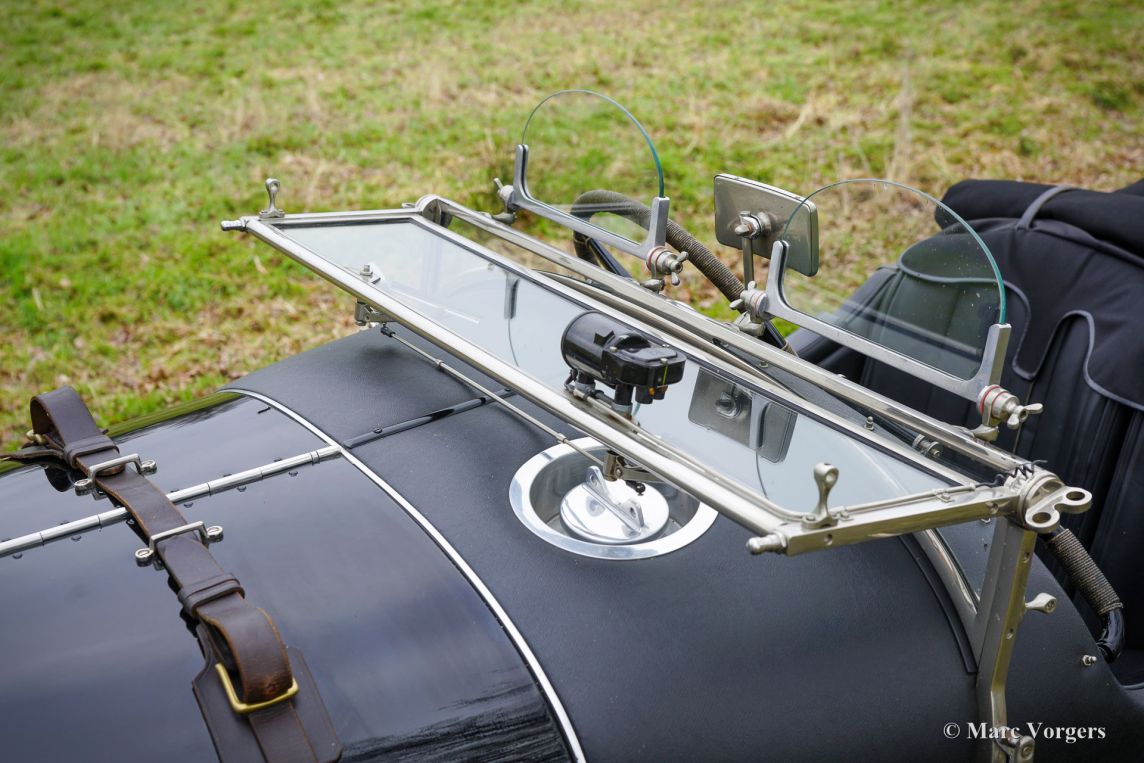 Bodywork: Ash framed. Aluminium panelled and covered with wadding and rexine. Double duck retractable hood and full tonneau cover. Folding windscreen fitted with laminated safety glass. Solid nickel radiator shell, all other bright work nickel-plated. Interior leather upholstered, with driver and passenger bucket seats. High quality close woven carpets.