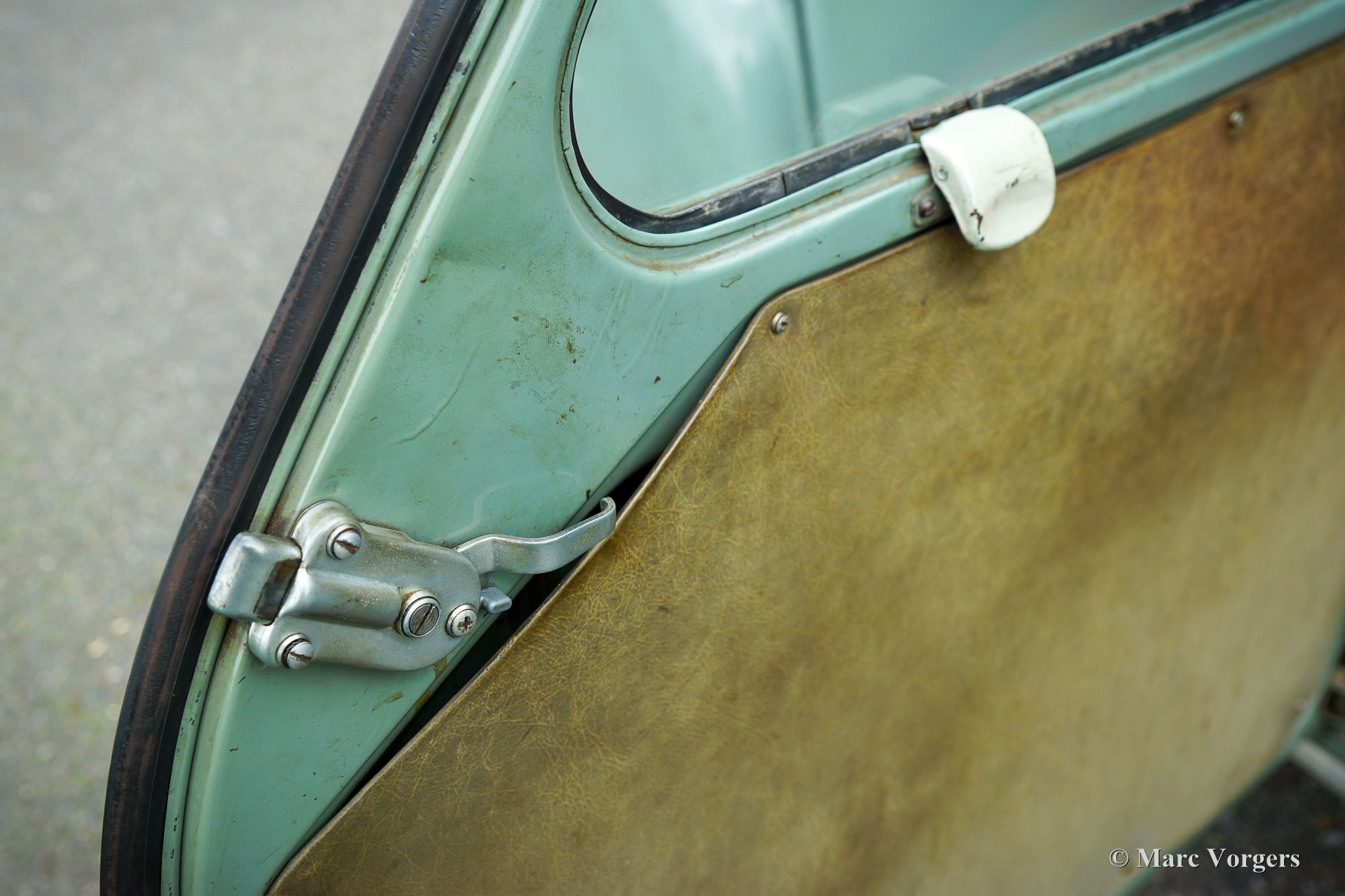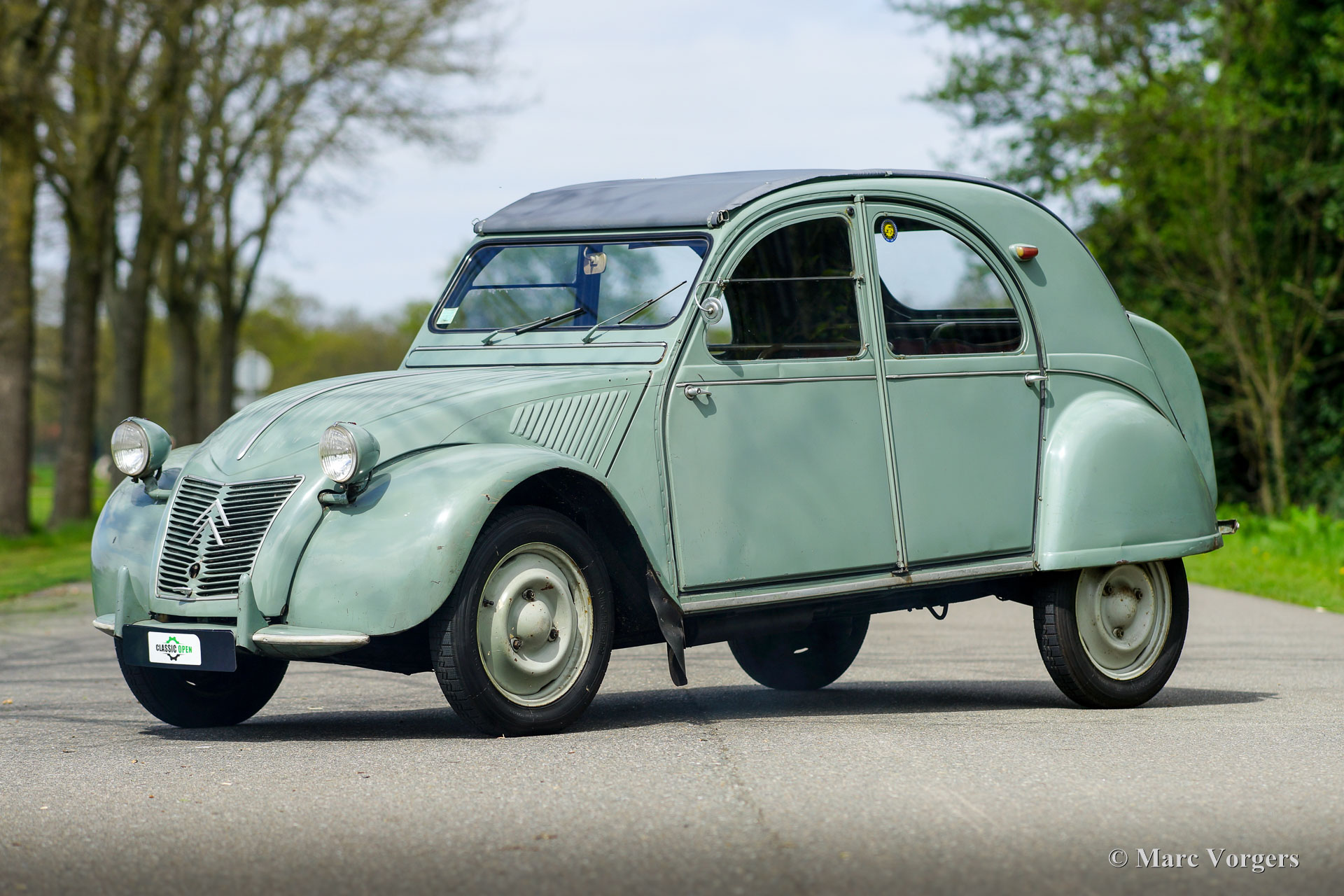 Citroën 2CV AZ „Ente“, Jahr 1957. Farbe blassblau kombiniert mit einer roten Innenausstattung. Der Citroën 2CV ist eine automobile Ikone des Kalibers VW Käfer, Morris Mini und Fiat 500. Der 2CV wurde entwickelt, um französischen Landarbeitern ein Einfaches, aber zuverlässiges (und billiges) Auto für alle täglichen Aufgaben unter allen möglichen (Straßen-)Bedingungen zu geben. Das Design des 2CV wurde vom italienischen Designer Flaminio Bertoni entworfen, der auch für den wunderschönen Citroën ID/DS verantwortlich war. Dieser 2CV wurde 1997 aus Montpellier in Frankreich in die Niederlande importiert. Der 2CV ist in einem sehr guten und super originalen Zustand und der Wagen hat von neuem nur 45.300 Kilometer gefahren. Seit 1997 kennt der Wagen nur einen Besitzer. Wie der VW-Käfer ist der 2CV in europäischen Ländern allgemein unter seinem Spitznamen bekannt. In Deutschland heißt das Auto „Ente“, in den Niederlanden „Lelijke Eend“ oder einfach „Eend“ (hässliche Ente und Ente), in Belgien „Wippertje“ (Türsteher) und „Geit“, in Frankreich „La Deuce“ und „Tin Snail“ im Vereinigten Königreich. Von 1949 bis 1990 wurden etwa 5 Millionen Citroën 2CV Autos produziert. Das Auto wird von einem luftgekühlten 424-cm³-Zweizylinder-Boxermotor angetrieben, der die Vorderräder über ein manuell betätigtes 4-Gang-Getriebe antreibt. Dieser super originale und wunderbar erhaltene 2CV wird mit der originalen Bedienungsanleitung und einem besonderen Kofferraumzubehör geliefert. Das Auto ist mit den richtigen Michelin-Reifen ausgestattet. Dieser 2CV ist eine fantastische Zeitkapsel!