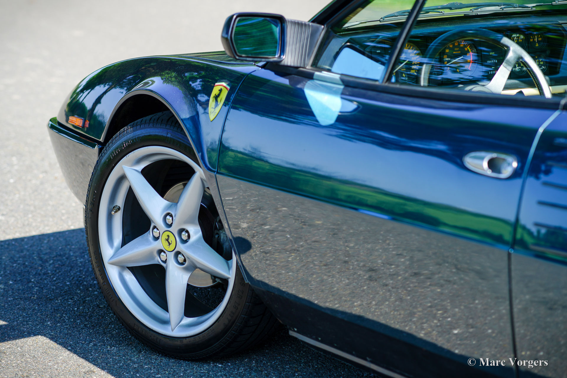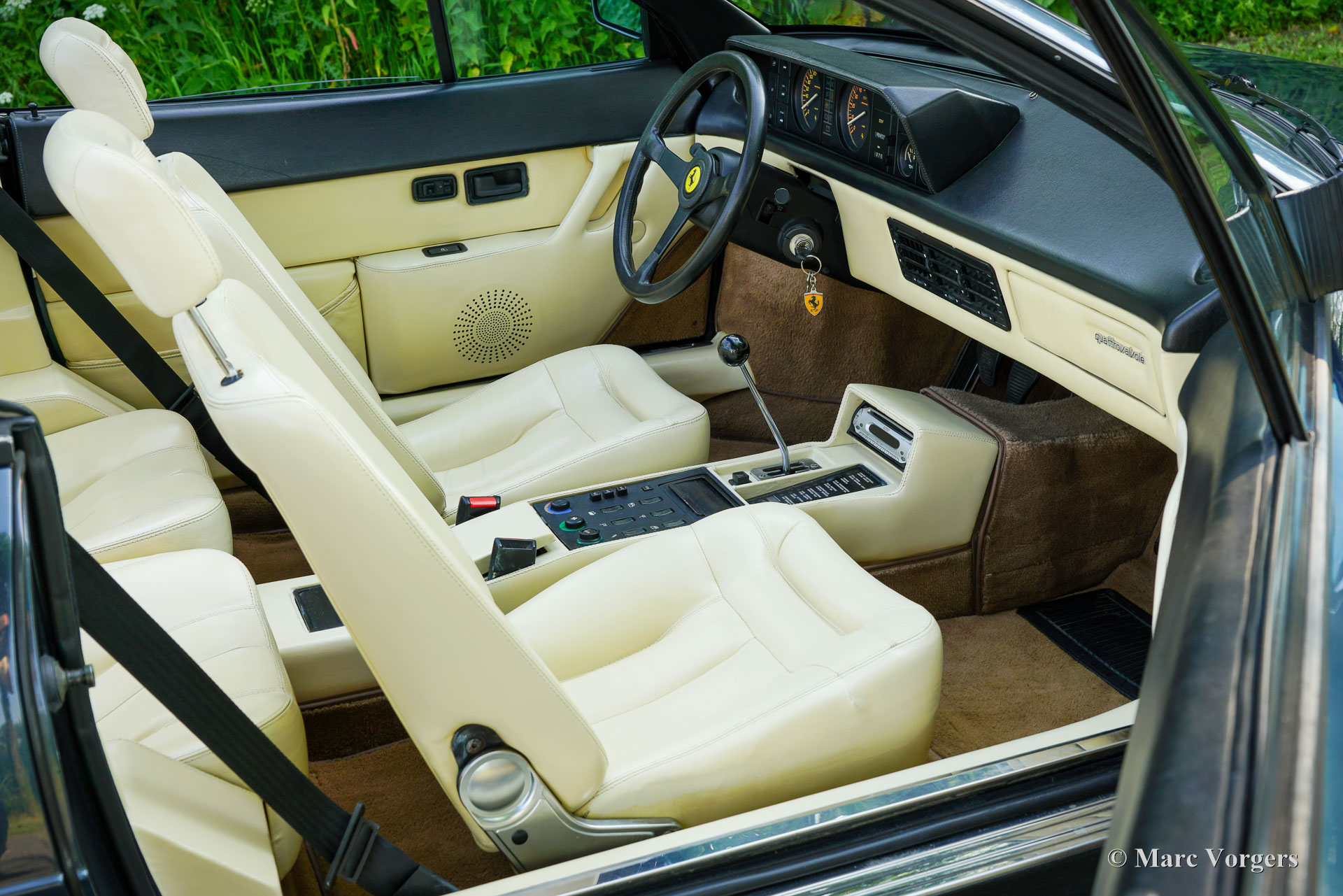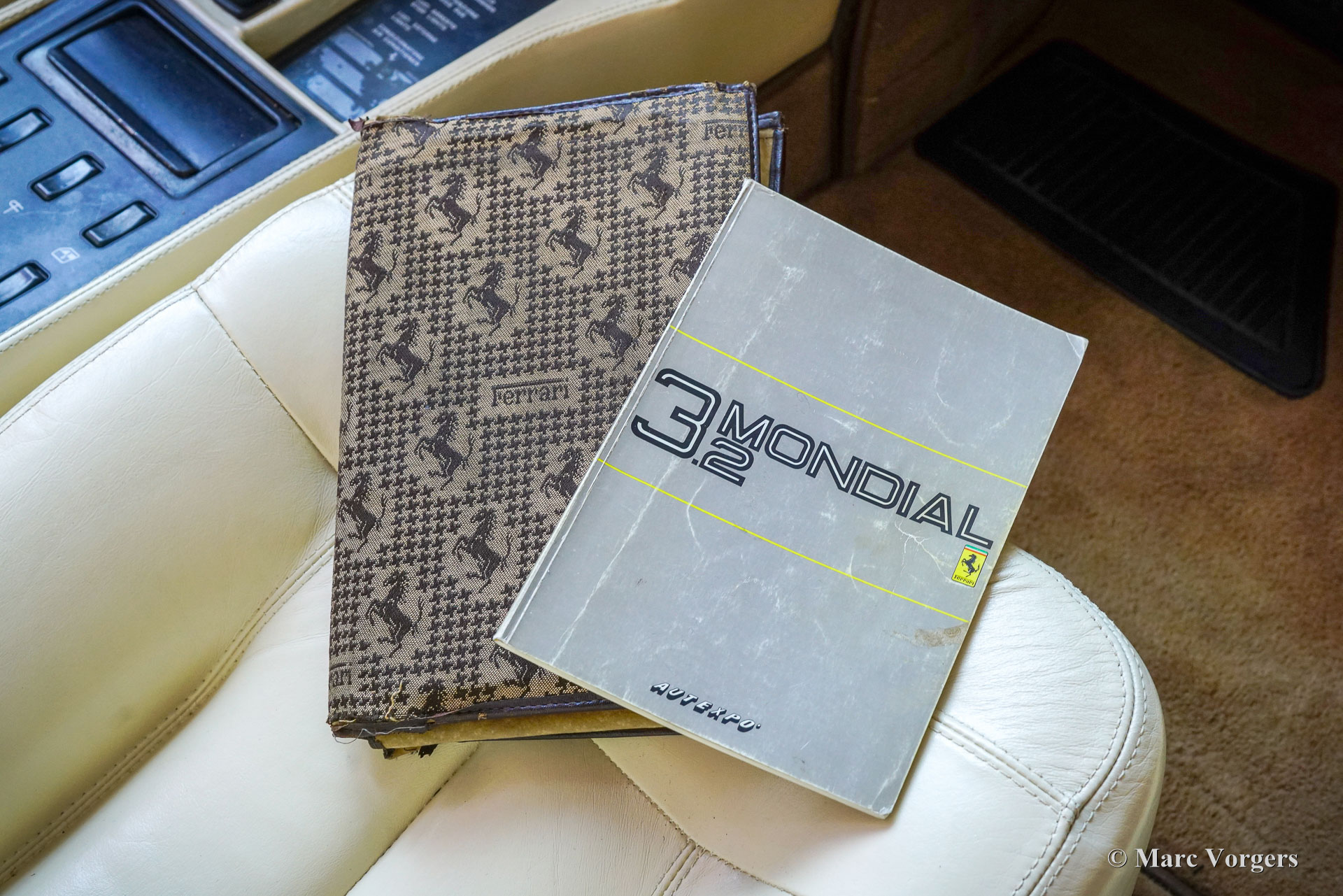 Ferrari Mondial 3.2 QV Cabriolet, Jahr 1986. Farbe Dunkelblau-Metallic (Blu-Chiaro), kombiniert mit einer hellbeigen Lederausstattung mit hellbraunem Teppich. Schwarzes Verdeck und Verdeck Abdeckung. Dieses fantastische Ferrari Mondial 3.2 QV-Cabriolet wurde in Deutschland neu verkauft. Im Jahr 2014 wurde das Auto nach Belgien exportiert, jetzt ist der Ferrari in den Niederlanden zugelassen. Der Ferrari Mondial ist ein Mitglied der Ferrari F108-Modellfamilie von Sportwagen, die mit einem quer eingebauten 90-Grad-V8-Motor ausgestattet sind. Der von Pininfarina entworfene Mondial verkörpert mit den ausklappbaren Scheinwerfern, dem horizontalen Kühlergrilldesign und den vier runden Rückleuchten den eleganten Ferrari-Stil der 1980er-Jahre. Dieser Ferrari Mondial hat von neuem eine Laufleistung von 94.580 Kilometern. Das Auto ist in einem guten Originalzustand und weist alle Originaldetails auf. Der letzte umfangreiche Service wurde bei 82.500 Kilometern in Belgien durchgeführt. Wir liefern das Auto mit einem neuen Zahnriemen aus. Dieser Ferrari Mondial fährt und handhabt sich wunderbar, und das Fahrerlebnis mit offenem Verdeck ist einfach fantastisch! Die Farbkombination ist hervorragend, die hellbeige Lederausstattung kontrastiert wunderbar mit der lebhaften blauen Metallic-Lackierung. Das Aussehen wird durch die wunderschönen Ferrari 360-Leichtmetallfelgen noch verbessert. Der zuverlässige 3,2-Liter-V8-DOHC-Motor mit 32 Ventilen leistet satte 271 PS bei 7000 U/min. Der Auspuffsound ist dank einer speziellen Abgasanlage großartig! Von diesem Ferrari Mondial 3.2 QV-Cabriolet-Modell wurden nur 810 Exemplare gebaut. Ein begehrenswerter offener Ferrari V8!