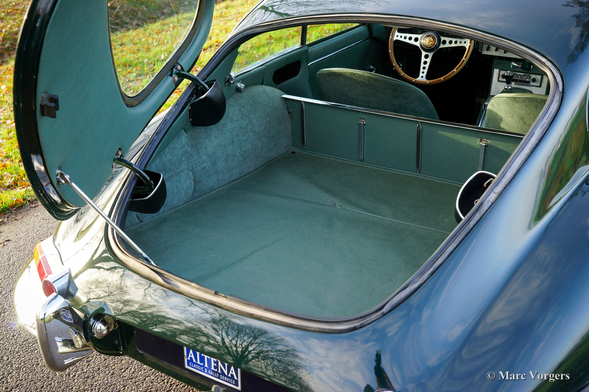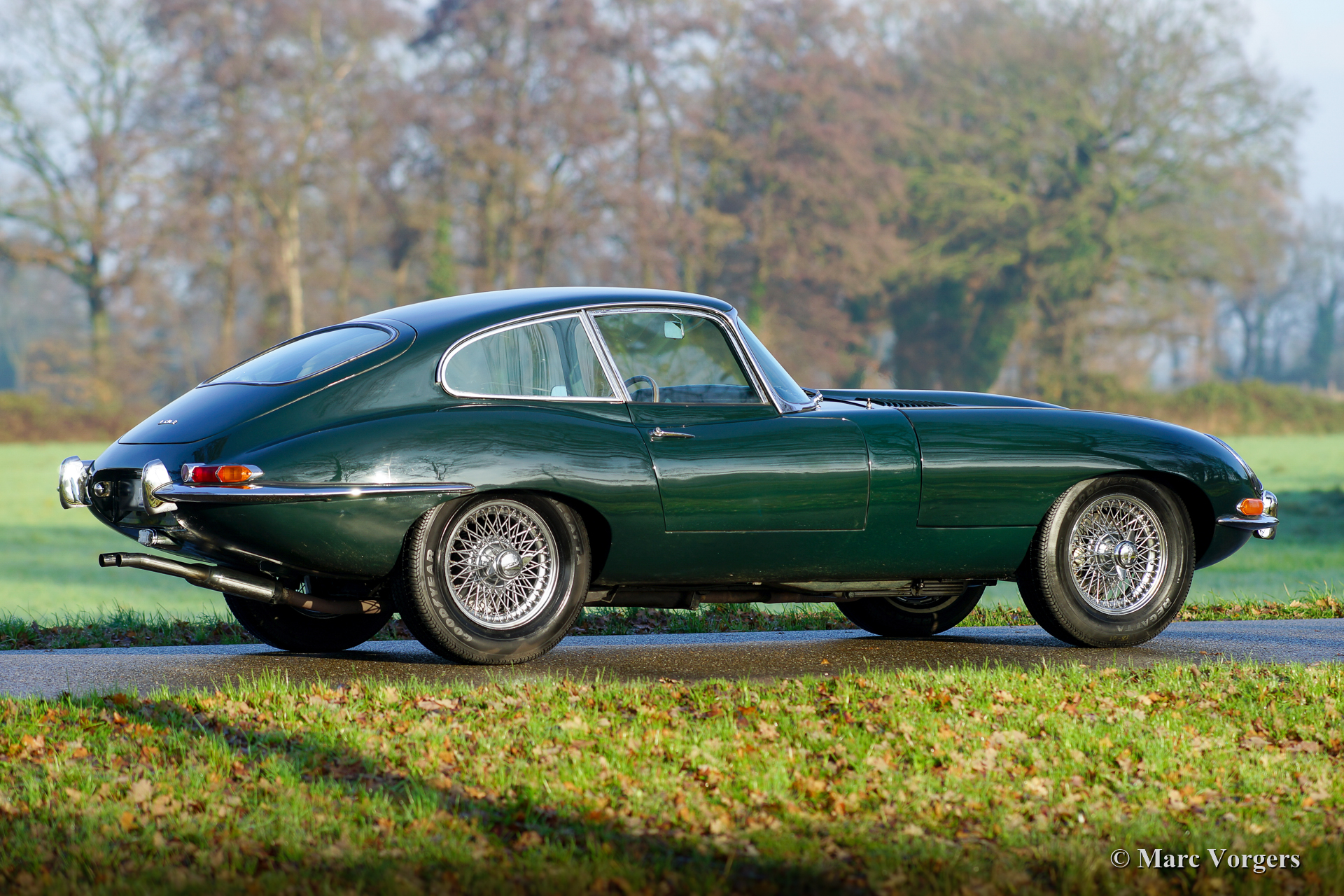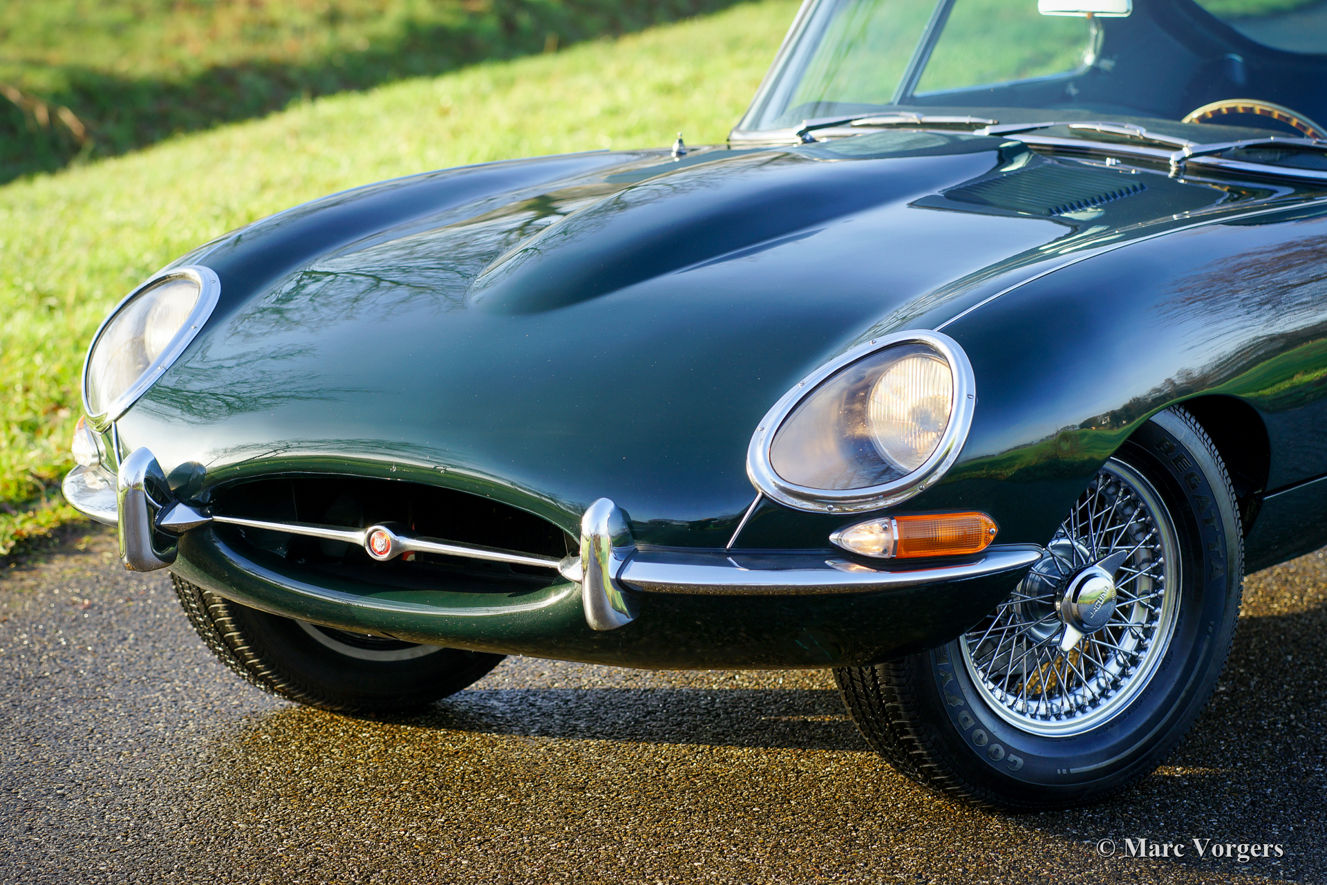Jaguar E-Type 3,8 Liter FHC Serie 1, Jahr 1963. Farbe dunkel British Racing Green kombiniert mit einer hellgrünen „Suede Green“ Lederausstattung und einem hellgrünen Teppich. Dieses fabelhafte Jaguar E-Type „Fixed Head Coupé“ aus der 1. Serie wurde in den USA neu verkauft. Im Jahr 1994 wurde das Auto in die Niederlande importiert. Diese fantastische Maschine wurde vom letzten Besitzer von 2004 bis heute geschätzt! Der Jaguar E-Type wurde im März 1961 auf dem Genfer Autosalon vorgestellt. Der E-Type war in den 1960er Jahren fast so ein großer Showstopper wie der Citroën DS in der 1950er. Sogar Enzo Ferrari war beeindruckt und sagte, dass der Jaguar E-Typ das schönste Auto der Welt sei. Dieses frühe Coupé-Modell der 1. Serie ist aufgrund der großartigen Karosserieform, Dachlinie und Details der gefragteste E-Typ der Serie. Details wie die abgedeckten Scheinwerfer (die in der Serie 1.5 gelöscht wurden) und die wunderschönen Rückleuchten (die in der Serie 2 gelöscht wurden). Dieser fantastische Jaguar E-Type befindet sich in einem sehr guten und super originalen Zustand! Das Auto wurde nie restauriert, nur in der Vergangenheit neu lackiert. Technisch und mechanisch wurde das Auto wunderschön gewartet. In den letzten Jahren wurde der Motor überholt, das Getriebe überprüft und gewartet und die Hinterradaufhängung wiederhergestellt. Das Auto ist ausgestattet mit 15-Zoll-Chrom-Speichenrädern, die von 205/75 Goodyear-Reifen versehen sind. Weiter finden Sie einem zeitrichtigen Blaupunkt Essen-Radio mit FM am Armaturenbrett. Dieser Jaguar fährt und klingt fantastisch; Ein begehrliches Fahrerauto und ein wunderschöner Hingucker!