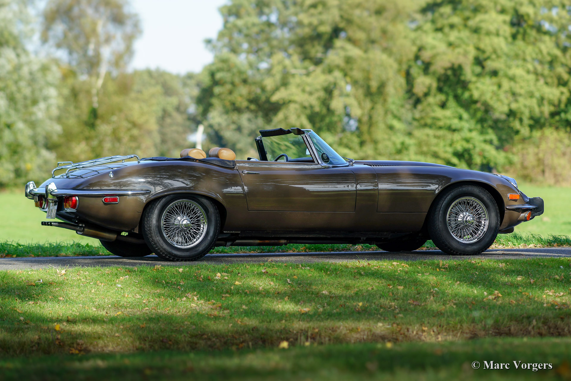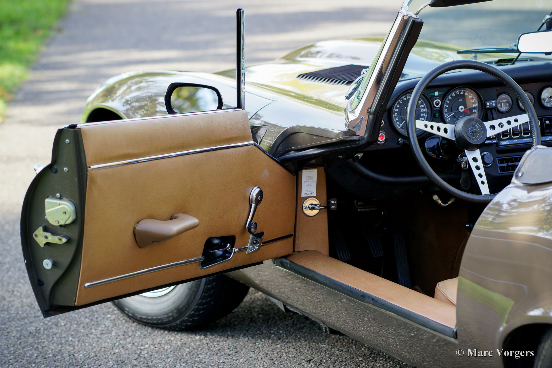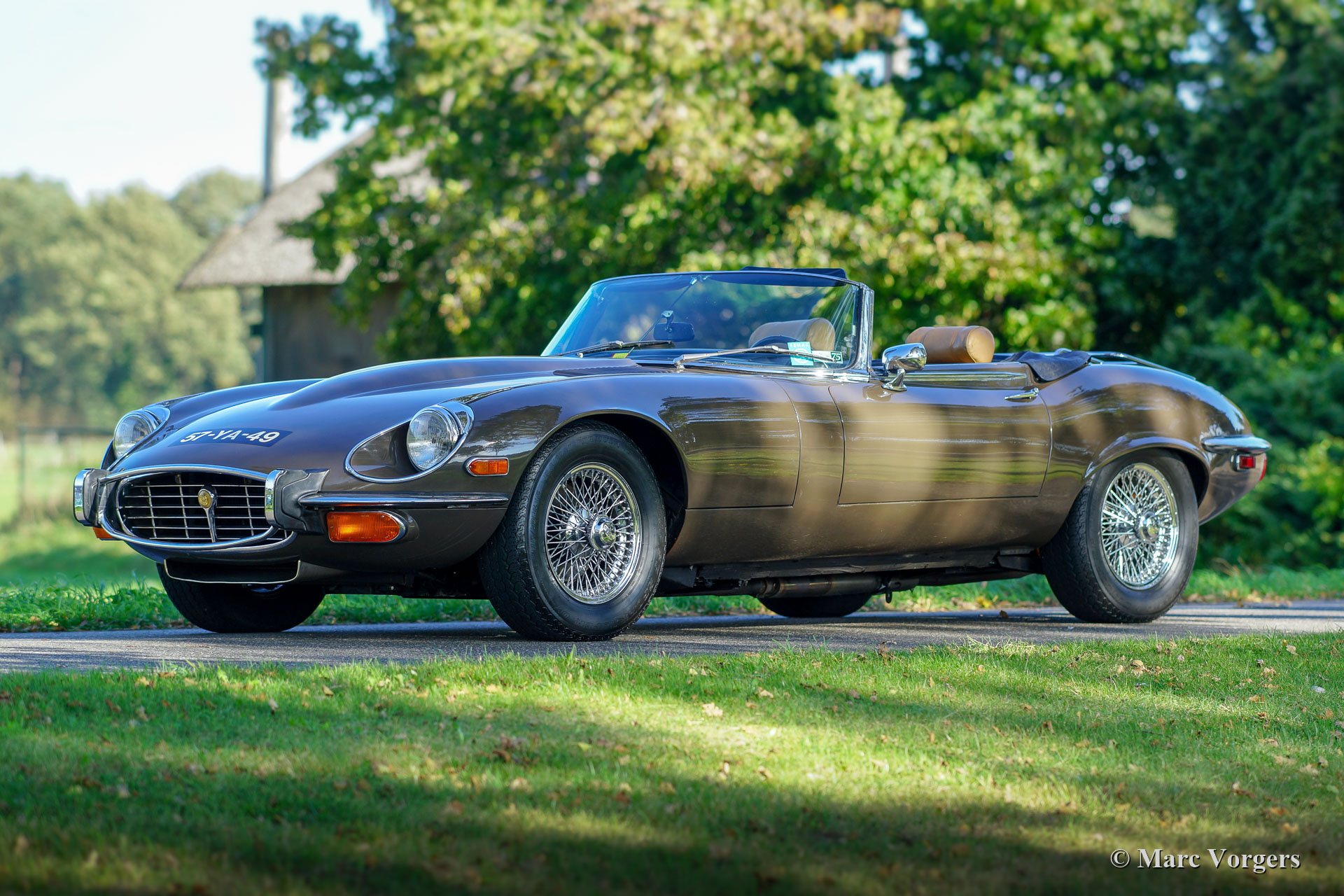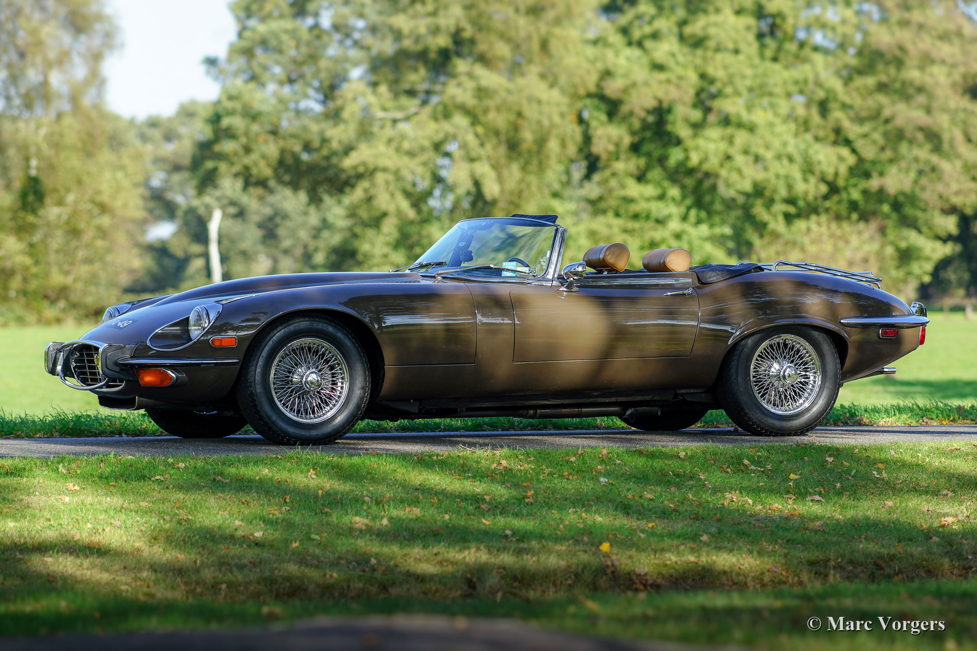 Jaguar E-Type V12 OTS, Jahr 1973. Fahrgestellnummer UDID2175X, Karosserienummer 4S346X, Motornummer 7S9980LX, Getriebenummer KL328X. Farbe braun (Sable) kombiniert mit einer hellbraunen Lederausstattung und hellbraunem Teppich. Schwarzes Verdeck und Verdeck-Abdeckung. Dieser beeindruckende Jaguar E-Type V12 wurde neu in den USA verkauft. Das Auto wurde 1991 in die Niederlande importiert. Dieser E-Type OTS (Open Two Seater, auch Roadster genannt) ist in einem sehr guten und super originalen Zustand! Der E-Type ist mit der seltenen manuellen Getriebeoption ausgestattet und das Auto fährt perfekt. Das Auto wurde nie restauriert, nur sehr gut gewartet, gepflegt und trocken abgestellt! In Anbetracht des Alters von 45 Jahren sind die Gebrauchs- und Altersspuren sehr gering; eine wahre Zeitmaschine! Die Lackierung ist weitgehend original, und das Interieur ist komplett original! In den Niederlanden kannte der E-Type nur zwei Besitzer, seit 2010 ist der Wagen beim zweiten niederländischen Eigner. Dieser Jaguar verfügt über 15-Zoll-Chrom-Draht-Räder, ein Chrom-Gepäckträger, das Original-Radio (British Leyland + FM) und das Original-Werkzeug-Set. Dies ist ein beeindruckender Jaguar E-Type V12 in sehr gutem und super original Zustand!