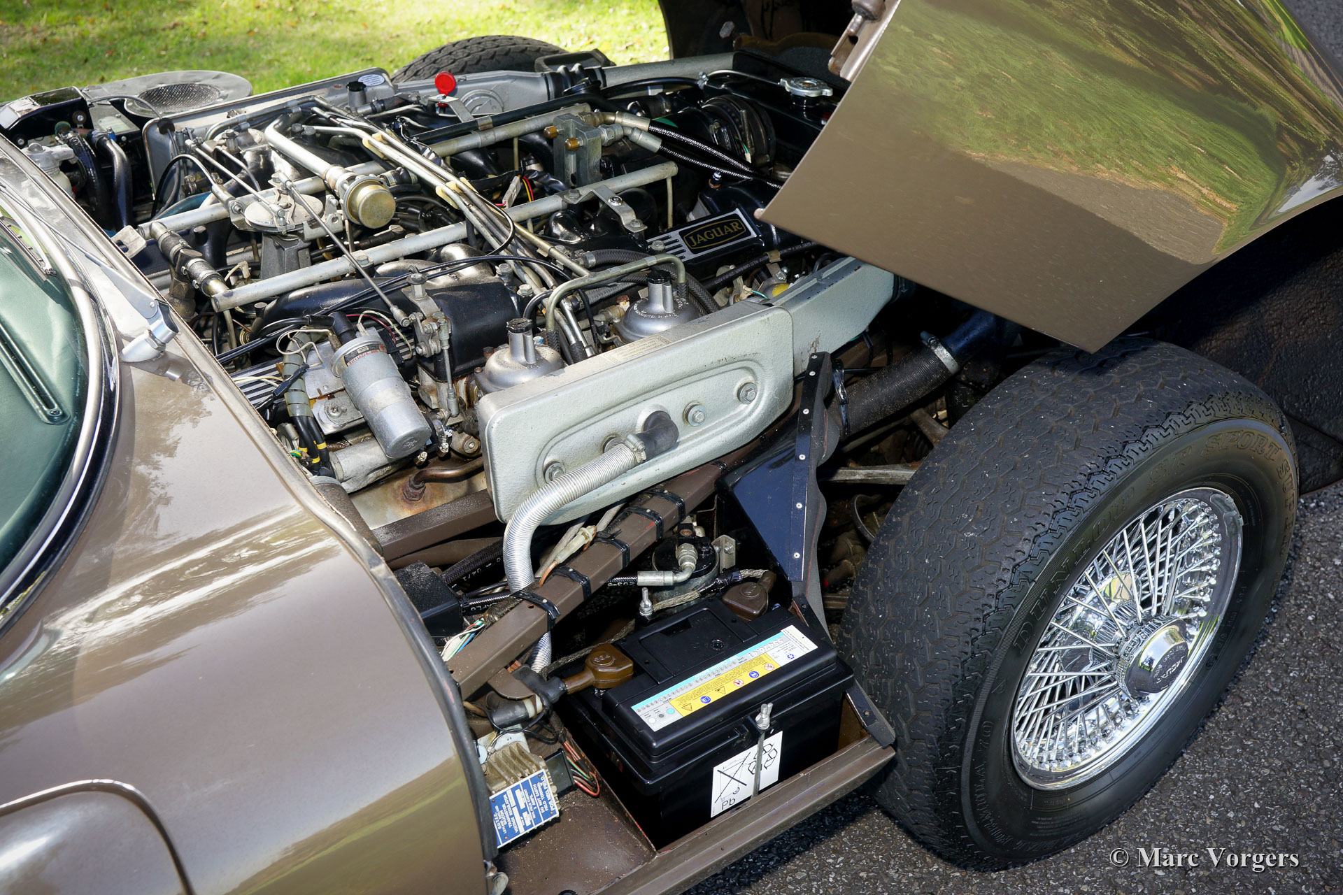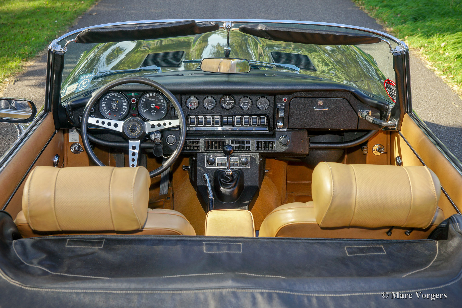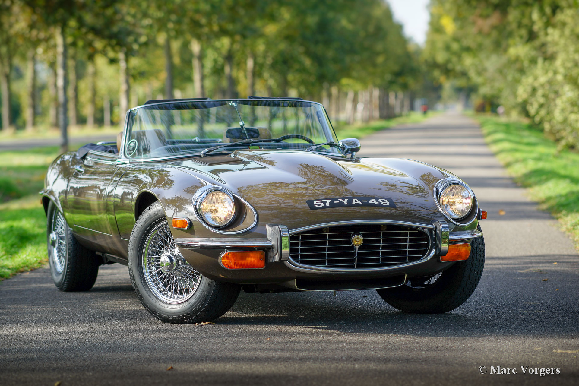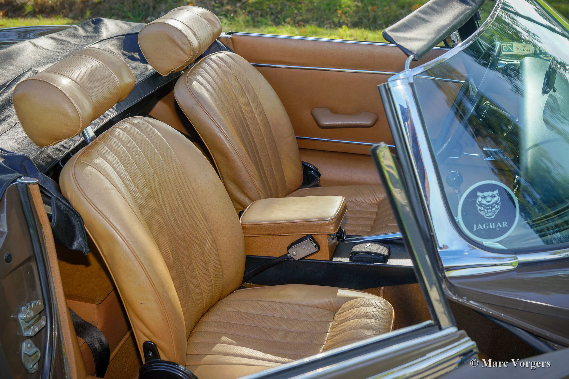 Jaguar E-Type V12 OTS, Jahr 1973. Fahrgestellnummer UDID2175X, Karosserienummer 4S346X, Motornummer 7S9980LX, Getriebenummer KL328X. Farbe braun (Sable) kombiniert mit einer hellbraunen Lederausstattung und hellbraunem Teppich. Schwarzes Verdeck und Verdeck-Abdeckung. Dieser beeindruckende Jaguar E-Type V12 wurde neu in den USA verkauft. Das Auto wurde 1991 in die Niederlande importiert. Dieser E-Type OTS (Open Two Seater, auch Roadster genannt) ist in einem sehr guten und super originalen Zustand! Der E-Type ist mit der seltenen manuellen Getriebeoption ausgestattet und das Auto fährt perfekt. Das Auto wurde nie restauriert, nur sehr gut gewartet, gepflegt und trocken abgestellt! In Anbetracht des Alters von 45 Jahren sind die Gebrauchs- und Altersspuren sehr gering; eine wahre Zeitmaschine! Die Lackierung ist weitgehend original, und das Interieur ist komplett original! In den Niederlanden kannte der E-Type nur zwei Besitzer, seit 2010 ist der Wagen beim zweiten niederländischen Eigner. Dieser Jaguar verfügt über 15-Zoll-Chrom-Draht-Räder, ein Chrom-Gepäckträger, das Original-Radio (British Leyland + FM) und das Original-Werkzeug-Set. Dies ist ein beeindruckender Jaguar E-Type V12 in sehr gutem und super original Zustand!