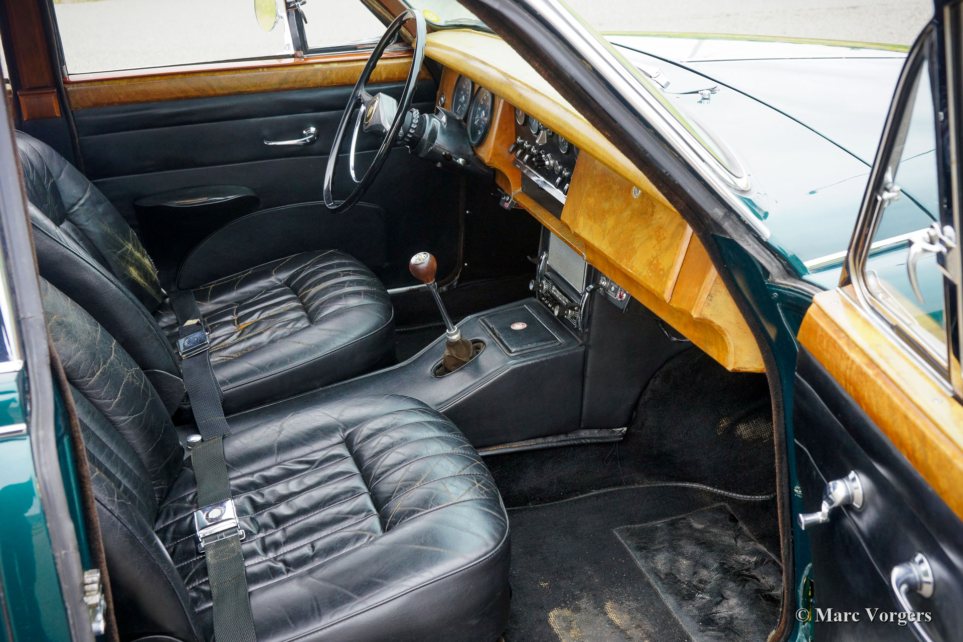 Jaguar Mk II 3,4 Liter, Jahr 1967. Farbe Dunkelgrün metallic kombiniert mit einer schwarzen Lederausstattung. Dieser wundervolle Jaguar Mk II ist ein begehrenswertes 3,4-Liter-Modell mit einem manuell betätigten Getriebe und Overdrive! Das Auto ist in einem sehr guten Zustand und das Auto fährt herrlich. Die Karosserie wurde restauriert und ist in einem ausgezeichneten Zustand. Die Innenausstattung ist original und in ordentlichem Zustand, das schwarze Leder und der Teppich weisen deutliche Alters- und Gebrauchsspuren auf. Der 180 PS starke Reihensechszylinder-Motor läuft wunderbar. Dieser Mk II ist mit breiten Chrom-Speichenrädern und den begehrten schmalen ‚Coomb-Spats‘ um die Hinterräder ausgestattet. Zusätzlich ist das Auto versehen von einem schönen und seltenen original Blaupunkt Frankfurt US X Autoradio mit UKW / FM-Empfang. Dieses Radio funktioniert wunderbar. Das Auto hat sich als eine sehr zuverlässige Maschine erwiesen.