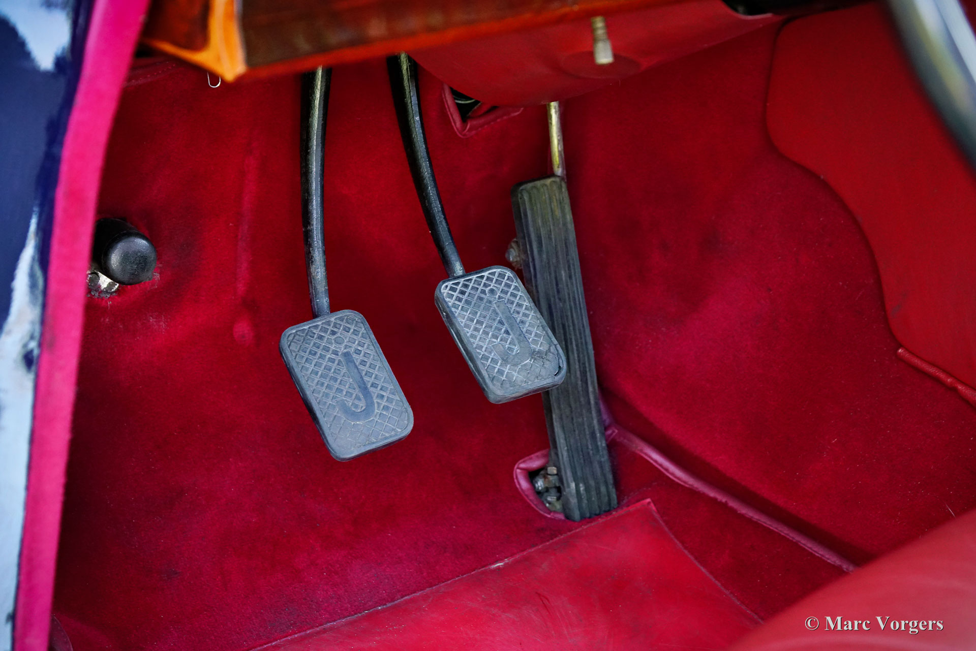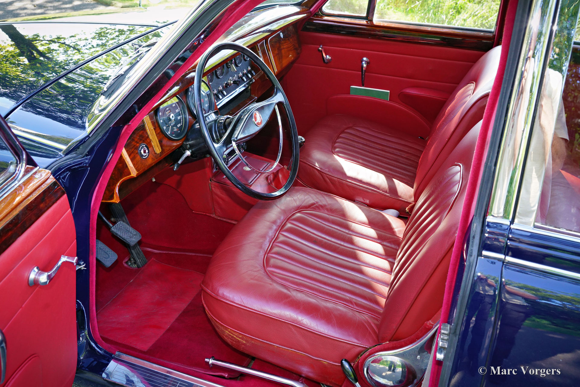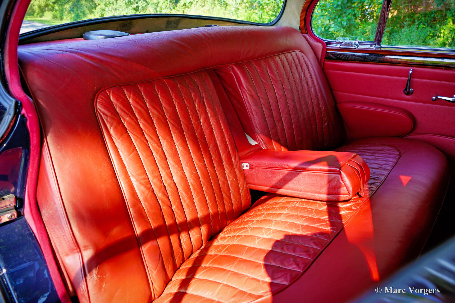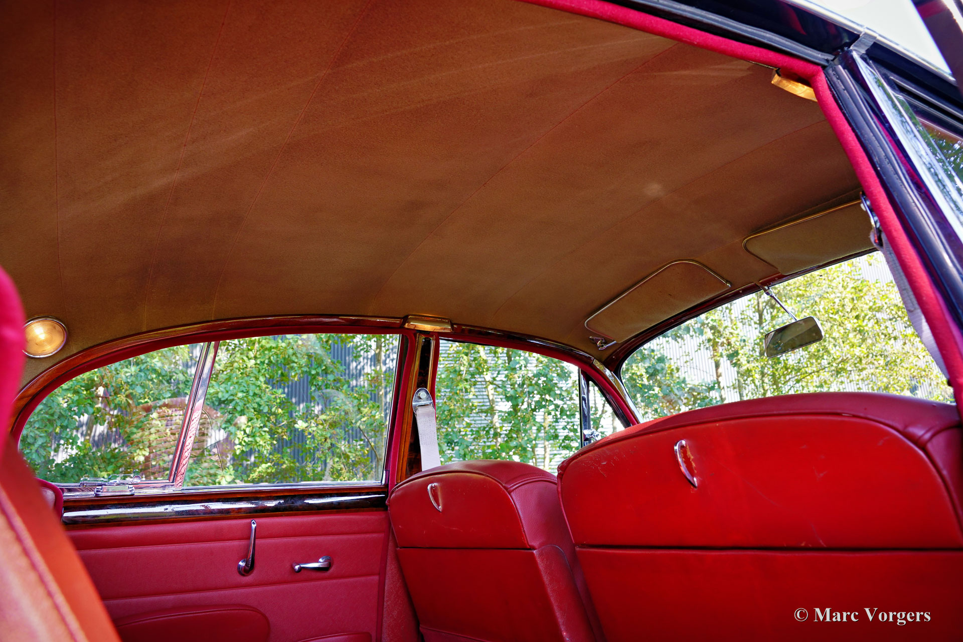 Jaguar Mk II 3,8 Liter, Jahr 1962. Farbe Dunkelblau kombiniert mit einem roten Lederausstattung und rotem Teppich. Dieser sehr schöne Jaguar Mk II wurde in der Vergangenheit umfassend restauriert, das Auto ist in einem sehr guten Zustand und fährt hervorragend. Der Jaguar Mk II war ein großer Erfolg und eine der begehrtesten britischen Limousinen der frühen 1960er Jahre. Dieses Spitzenmodell ist mit dem größten Motor von Jaguar zu dieser Zeit ausgestattet; dem 3,8-Liter-XK-Sechszylinder und dem manuell betätigten 4-Gang-Getriebe mit Overdrive! Der Reihensechszylinder mit 3781 ccm leistete 220 PS und ein 3,8er mit manuellem Getriebe war eine echte 200 km/h-Maschine, die zu Beginn der 1960er Jahre die meisten Sportwagen in den Schatten stellte. Aufgrund seines Potenzials war das Auto bei der Polizei sehr beliebt … und auch bei der Verbrechergilde. Dieser schöne Jaguar Mk II zeigt alle Originaldetails, einschließlich der Stahlräder mit verchromten Radkappen und den „Spats“ über den Hinterrädern. Der luxuriöse Innenraum atmet die Atmosphäre eines britischen Gentlemen‘s Clubs der Spitzenklasse, mit Wollteppich, teurer Lederpolsterung und Walnussholz rundherum. Der sportliche Charakter des Mk II wird durch das kraftvolle Knurren des Sechszylindermotors mit zwei Nockenwellen und das schöne Armaturenbrett voller Anzeigen und Schalter offenbart. Dieser Jaguar ist mit einem Edelstahlauspuff ausgestattet und das Auto wird komplett mit dem Originalwerkzeugsatz geliefert, der im Ersatzrad verstaut ist. Dieser Jaguar ist bereit, einem stolzen neuen Besitzer sein volles Potenzial zu zeigen.