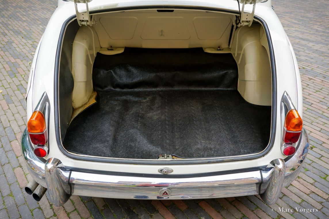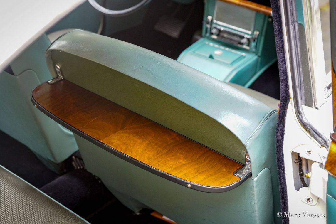 Jaguar MK II 3,8 Liter Automatik, Jahr 1962. Karosserie in Old English White, kombiniert mit einer zweifarbigen Innenausstattung aus grauem Stoff/aquamarinblauem Vinyl, getrimmt mit schwarzem Teppich. Dieser schöne Jaguar MK II 3,8 Liter wurde am 14. Juli 2010 in die Niederlande importiert. Der aktuelle Besitzer kaufte das Auto am 6. April 2017. 2017 wurde das Automatikgetriebe repariert und die Lenkpumpe überprüft, der Tachostand betrug 522 Meilen. Im Juni 2019 wurde das Auto von einem Jaguar-Spezialisten in den Niederlanden einer umfassenden Wartung unterzogen. Mehrere Öllecks wurden repariert, die Lichtmaschine überholt, der Spannungsregler erneuert und eingestellt, die Gummi-Motorhalterungen erneuert, die Vergaser gereinigt und von neuer Nadel Sätze versehen, und der Kraftstofftank erneuert. Das Automatikgetriebe wurde dann komplett überholt. Darüber hinaus wurden neue Lucas Fog Rangers eingebaut. Seit 2017 wurden 15.000 € in Reparaturen und Wartung investiert. Dieser Jaguar MK II 3.8 ist innen und außen in einem sehr guten und wunderbaren Zustand. Nur die hinteren unteren Enden der „Spats“ über den Hinterrädern weisen kleine Korrosionsflecken auf (auf den Fotos sind einige Blasen sichtbar). Als Teil einer Oldtimersammlung wurde der Jaguar nur wenig gefahren, der Tacho zeigt jetzt 2023 Meilen an. Der Jaguar Mk II 3,8 Liter wurde 1959 eingeführt. Der MK II war eine raffinierte britische Limousine, die Komfort mit für seine Zeit bemerkenswerter Leistung kombinierte. Angetrieben vom 3,8-Liter-Jaguar XK Reihensechszylinder Sportwagenmotor mit 220 PS, bot er eine starke Beschleunigung (knapp 10 Sekunden von 0 auf 100 km/h mit dem automatischen 3-Gang-Getriebe von Borg Warner) und ein ruhiges Fahrerlebnis, was ihn sowohl bei wohlhabenderen Privatbesitzern als auch bei der Polizei beliebt machte. Auch die Diebesgilde schätzte den MK II; “Pure wheels for outrunnin' the Dibble.” Dieses Exemplar verfügt über eine wunderschöne Originalausstattung in einem atemberaubenden Farbschema der 1960er Jahre. Das Holzarmaturenbrett und die großzügigen Holzoberflächen rundherum verleihen dem Innenraum einen Hauch von Exklusivität und Eleganz. Das Auto ist mit einem originalen Radiomobile AM-Radio ausgestattet. Besichtigung und Probefahrt sind nur nach vorheriger Terminvereinbarung möglich.
