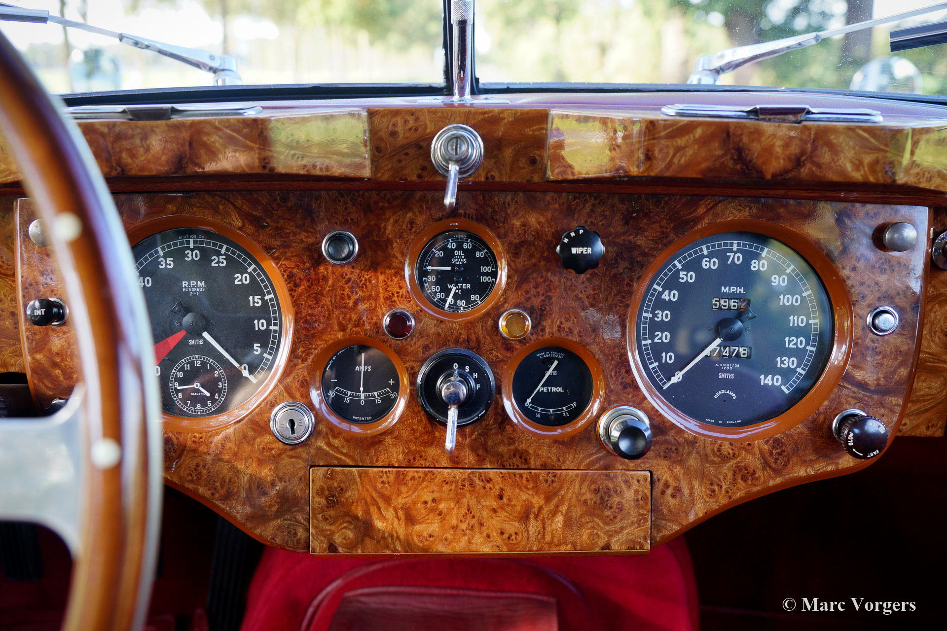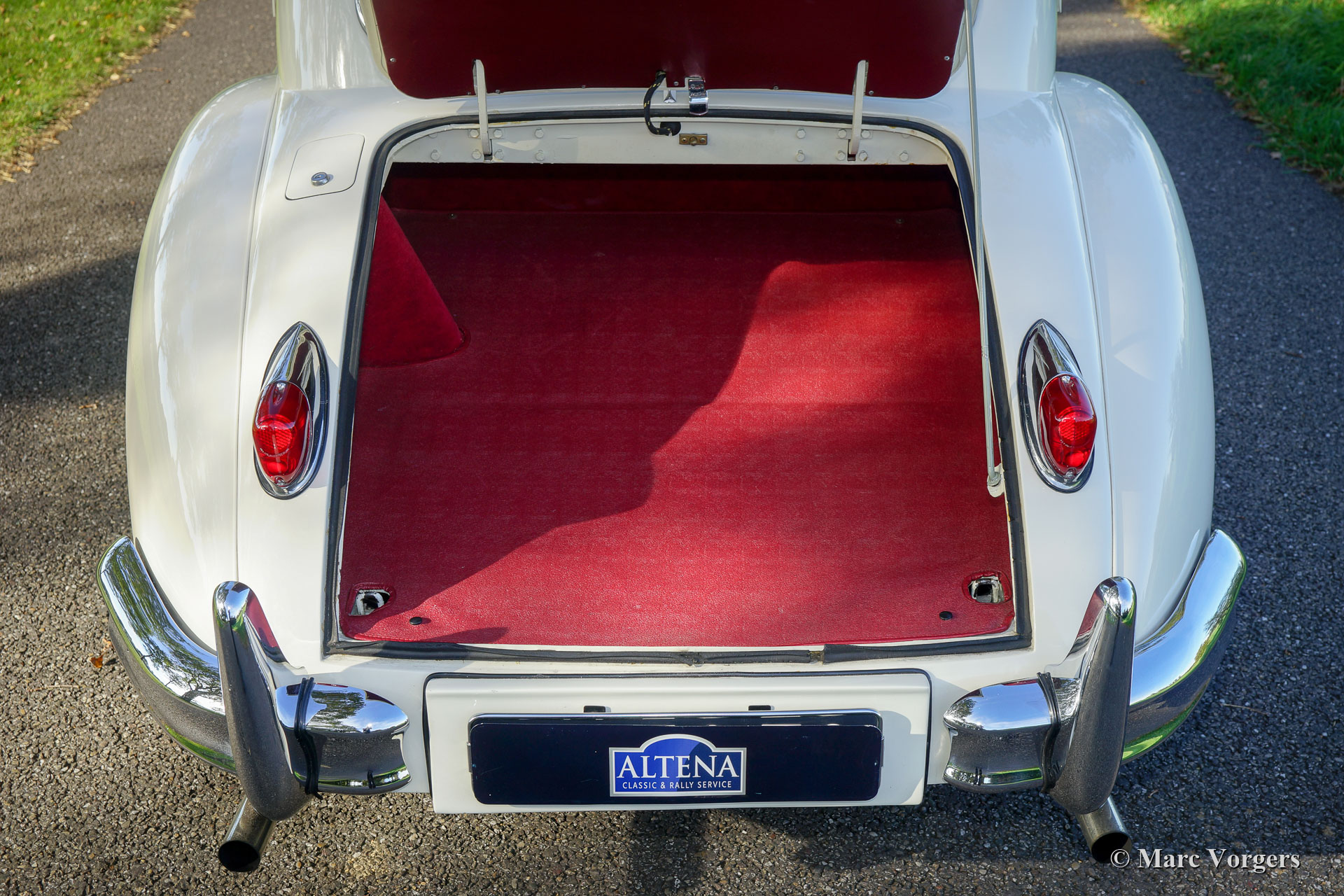 The Jaguar XK 140 replaced the famous XK 120 and was brought onto the market in 1954. The XK 140 was an evolution of the XK 120 with some visual differences and technical improvements. The handsome and dynamic features remained largely unchanged. New was the grille, which counted fewer vertical bars; the rear lights were larger, the bumpers were thicker, and the front indicators, which were placed on the front of the front wing. The important technical improvement was that the XK 140 was provided with a rack and pinion steering which greatly improved steering and driving.