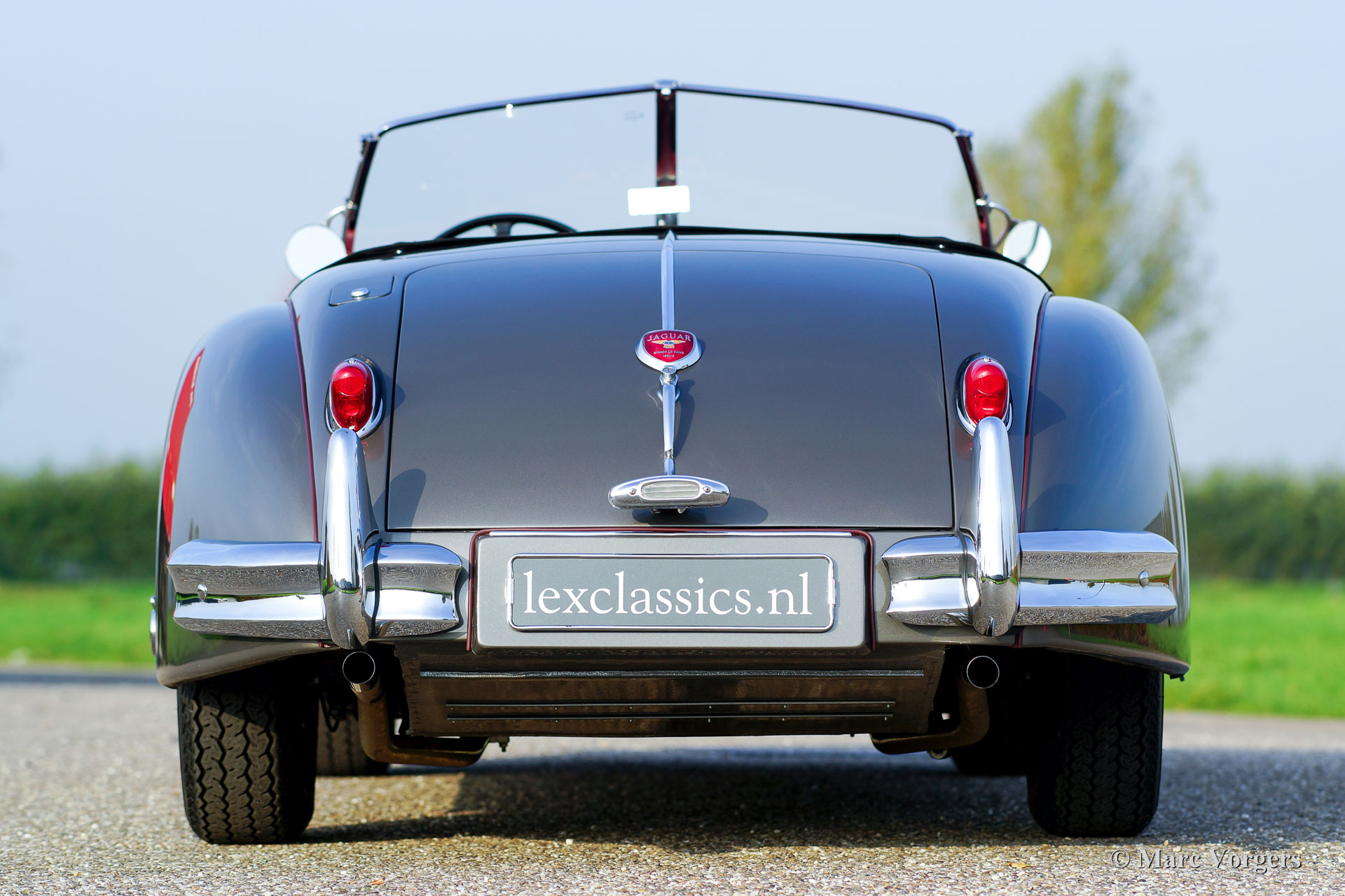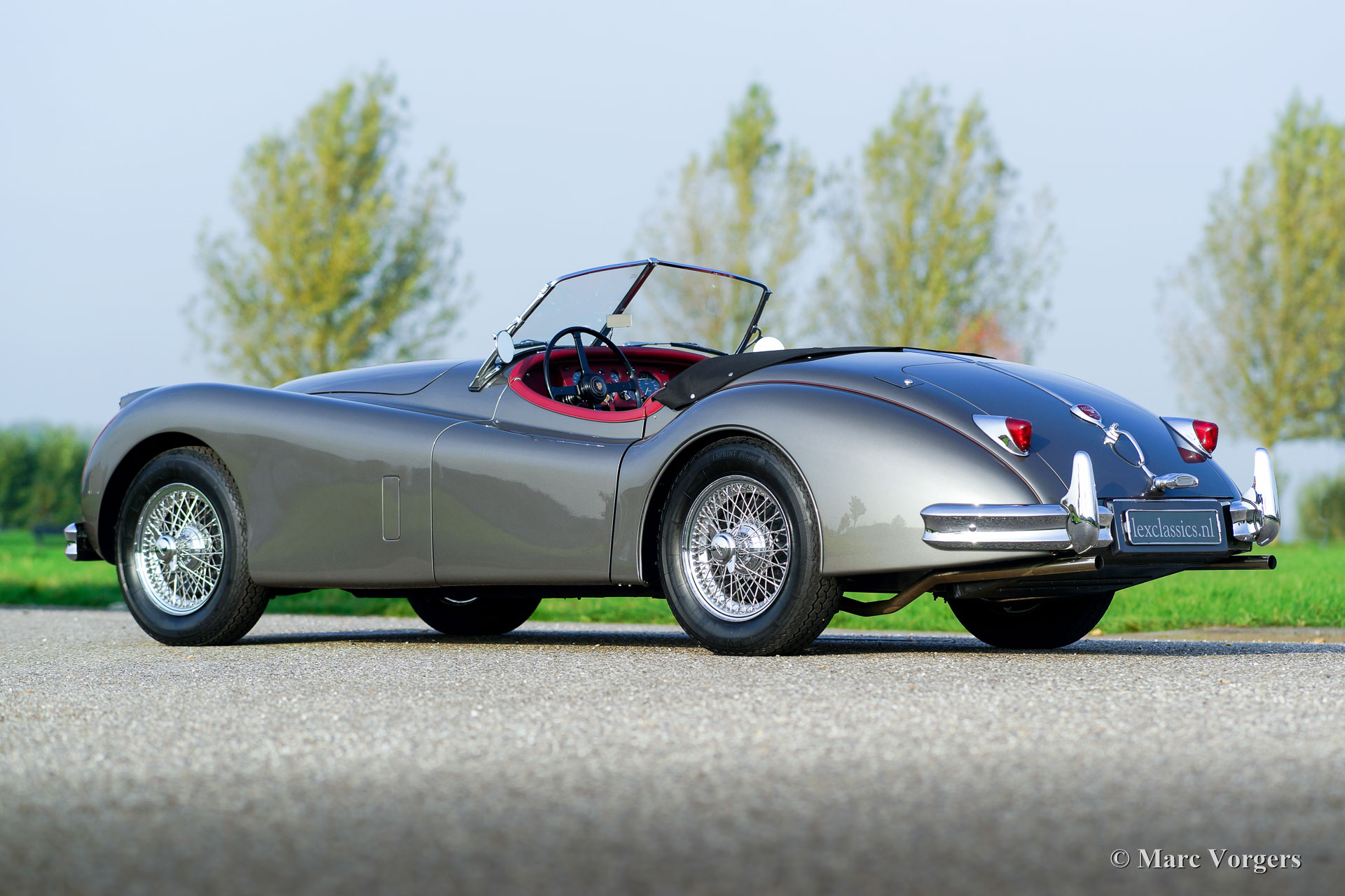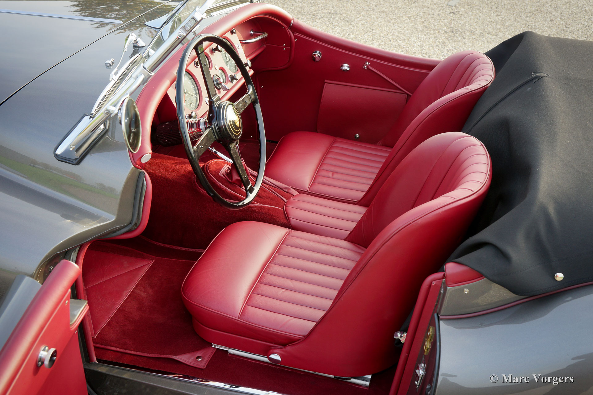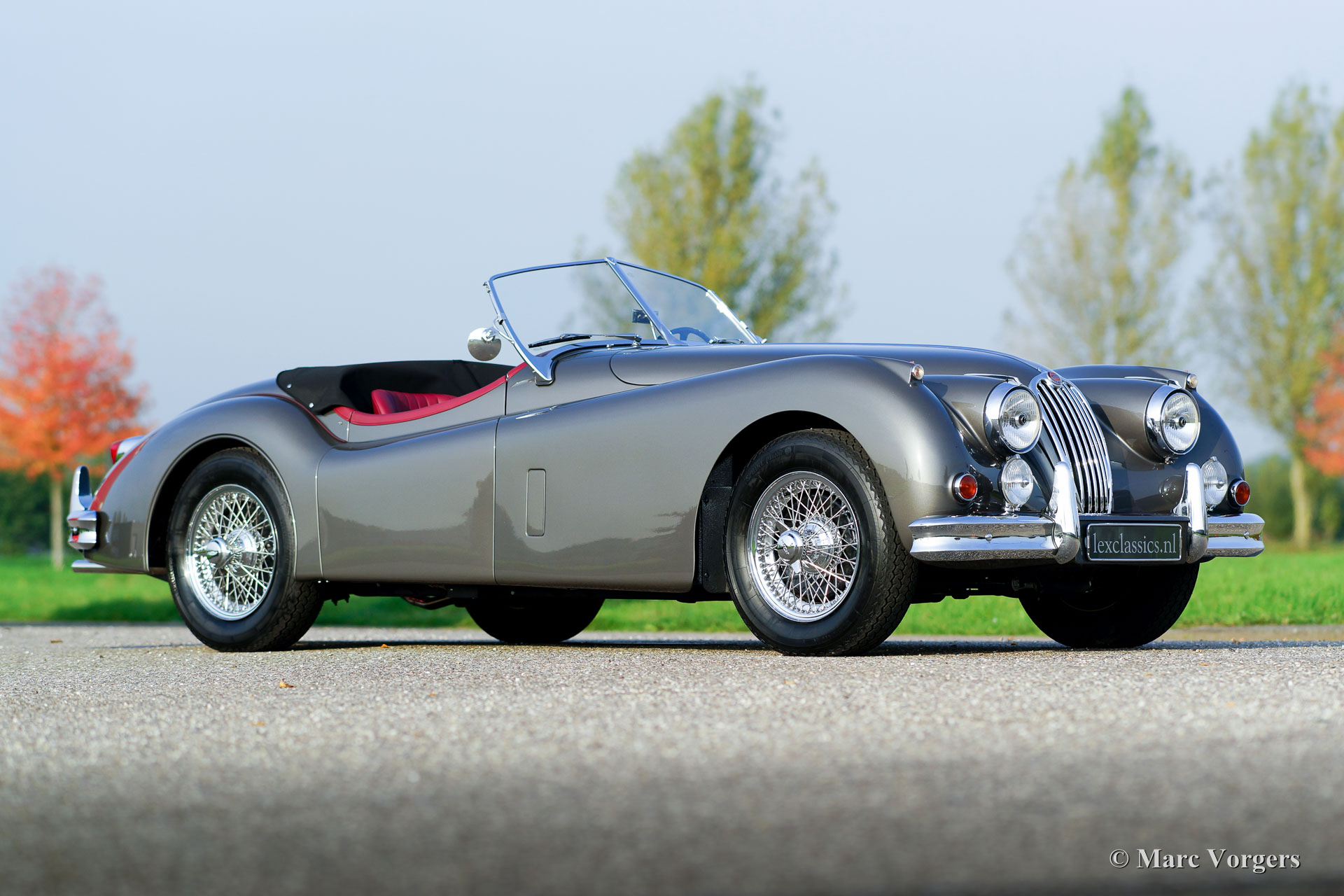 Jaguar XK 140 OTS, Jahr 1957. Farbe 'Gun Metal' grau metallic mit einem roten Lederinterieur und rotem Teppich. Schwarzes Mohair-Verdeck und Persenning. Dieser gewaltige und wundervolle Jaguar XK 140 OTS (Open Two Seater, auch Roadster genannt) verließ das Jaguar-Werk im Jahr 1956. Das Auto wurde im Jahr 1957 in New York (USA) neu verkauft. Dieses makellose Beispiel wurde ausgiebig und perfekt ‘body-off‘ in den Niederlanden in den Jahren 2014 - 2017 restauriert. Dieser Jaguar XK 140 OTS ist in einem einwandfreien Top-Zustand; Concours! Eine umfangreiche Fotoreportage und Rechnungen der Restaurierung sind vorhanden, um die gründliche Restaurierungsarbeit nachzuweisen. Während der Restaurierung erhielt das Auto spezielle Klassische Schalensitze und eine Modifikation der ‘Pedal-box‘, um mehr Platz für größere Fahrer zu schaffen. Das Automobil verfügt über den berühmten 3,4 Liter XK-Sechszylinder-Reihenmotor mit 210 PS. Die Kraft wird über ein manuell betätigtes Vierganggetriebe an die Hinterräder geleitet. Zusätzlich verfügt das Auto über Chromdrahträder, verchromte ‘Knock-off‘-Radmuttern, zwei Außenspiegel und einen elektrischen Kenlow-Lüfter. Dies ist ein Spitzen-Exemplar!