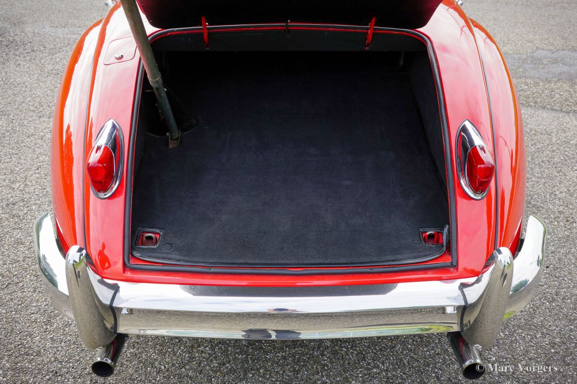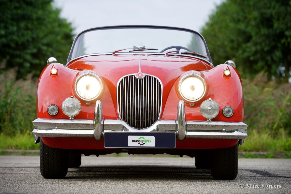 Jaguar XK 150 3,4 Liter OTS (Roadster), Jahr 1959. Farbe rot (Carmen red) kombiniert mit einer schwarzen Lederausstattung mit schwarzem Teppich. Schwarzes Verdeck und Persenning. Dieser prächtige Jaguar XK 150 OTS (Open Two Seater, in den USA auch Roadster genannt) wurde in den Vereinigten Staaten neu verkauft. Das Auto wurde 1986 in die Niederlande importiert und 2001 vom letzten Besitzer gekauft. Die (Wartungs-)Historie ist ab 2009 vollständig dokumentiert. Ein Heritage-Zertifikat ist vorhanden und die Informationen besagen, dass dies ein Jaguar mit „Matching Numbers“ ist! Das Auto ist in einem sehr guten Zustand und alles ist auf dem neuesten Stand. Die Karosserie zeigt eine perfekte Passung der Paneele, eine schöne Lackierung und wunderbare Chromteile. Der Sechszylinder-XK-Motor wurde 2014 von einem Spezialisten in den Niederlanden Komplett überholt. 2016 wurde eine elektrische Servolenkung von EZ eingebaut. Die 215 PS werden über ein Viergang-Schaltgetriebe mit Overdrive auf die Hinterräder übertragen. Dieser XK 150 Roadster fährt perfekt, dies ist eines der allerbesten Exemplare, die wir je gefahren sind! Das Auto zeigt alle Originaldetails und verfügt über wünschenswerte Extras wie das mittlere Armaturenbrett in Nuss Holz, 16-Zoll-Speichenräder mit Vredestein Sprint Classic-Reifen, ein Paar Lucas SFT576-Nebel-/Kurvenscheinwerfer an der Vorderseite, Servobremsen, elektronische Zündung, einen elektrischen Kühlerlüfter, rote Sicherheitsgurte und ein „Retro“-Radio mit Navigationssystem. Dies ist ein sehr begehrter Jaguar XK 150 OTS (Roadster) in einem wunderbaren Zustand, ein fantastisches klassisches Fahrerauto, das einem stolzen neuen Besitzer jede Menge Fahrspaß bringen wird. Der Jaguar XK 150 3,4 Liter OTS ist ein seltenes Auto, es wurden nur 1339 Exemplare gebaut.