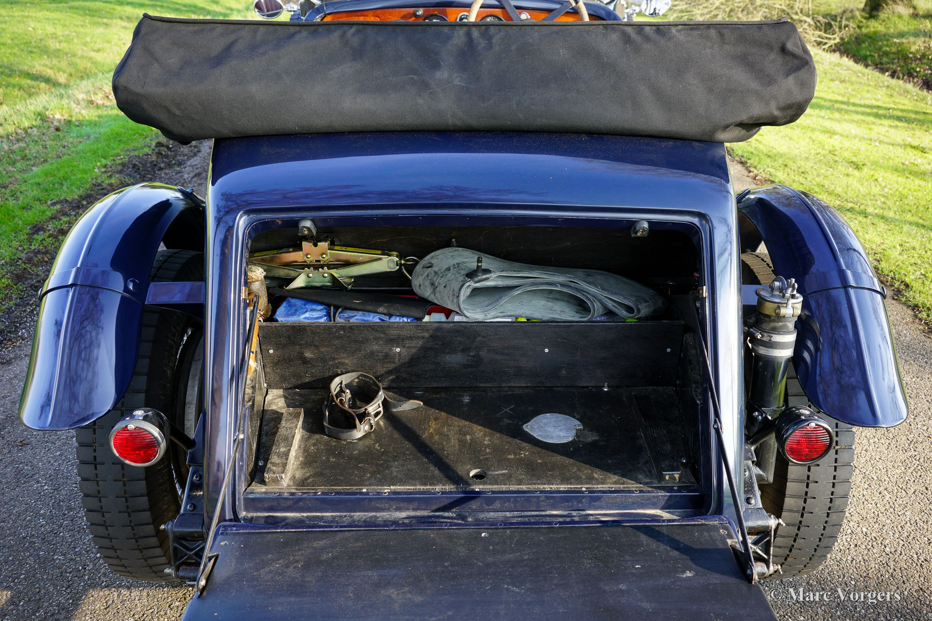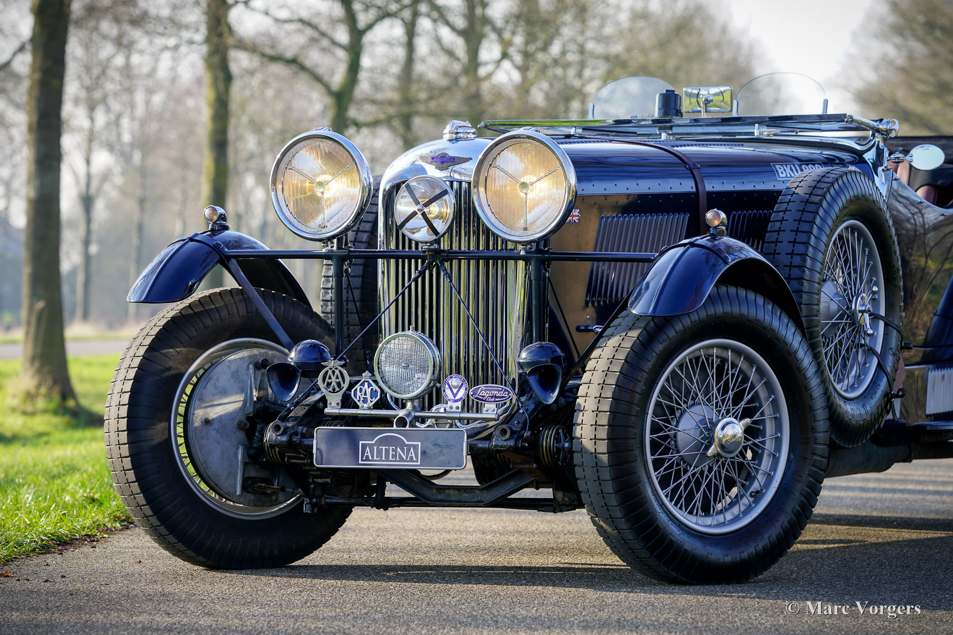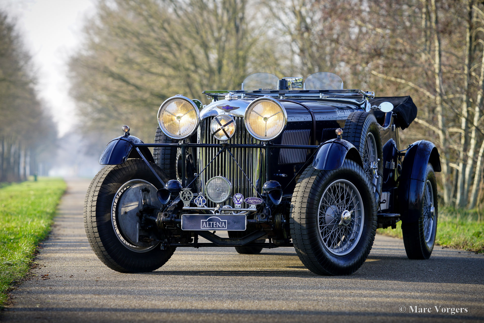 Lagonda LG 45 Sport Special, Jahr 1937. Fahrgestellnummer 12158G10, Motornummer 12153, originales britisches Kennzeichen BKU999. Farben: Dunkelblaue Karosserie, silberne Speichenräder kombiniert mit einer dunkelbraunen Lederausstattung mit dunkelblauem Teppich. Schwarzes Stoffverdeck und Verdeck Abdeckung. Dieser fantastische Lagonda LG45 wurde im Auftrag eines Kunden in Großbritannien von Altena Classic Service gekauft. Der Lagonda kam 2018 als komplettes Projektauto mit einem guten Fahrgestell, schlechter Karosserie, Kisten mit Originalteilen und einem (fachmännisch) überholten Motor. Die Achsen und der Motor waren ursprünglich werkseitig am Fahrgestell montiert und haben „matching numbers“. Im Auftrag und nach den Wünschen unseres Kunden wurde in England eine neue maßgeschneiderte Karosserie hergestellt. Die Wünsche waren: 2 Türen, leicht zu bedienendes Verdeck, sportliches Aussehen, robuste Bauweise, Sicherheit und ausreichend Stauraum. Altena Classic Service hat das Fahrgestell und die mechanischen Teile restauriert und umgebaut, mit Ausnahme des Motors und der Bremsen, die bereits in Großbritannien perfekt überholt wurden. Nach Ankunft der Karosserie haben sich Altena Classic Service und Partner um die Lackierung, die maßgeschneiderte Innenausstattung, das maßgeschneiderte Verdeck und die Fertigstellung dieses wunderbaren Bentley Special gekümmert. Während des Umbaus wurde das Originalgetriebe gegen ein robusteres und einfacher zu bedienendes, vollsynchronisiertes Alvis-Vierganggetriebe ausgetauscht, das das Fahrerlebnis erheblich verbessert. Alle Originalteile, die mit dem Auto geliefert wurden, wie Lampen, Anzeigen und Zierteile, wurden in ihrer ursprünglichen Pracht wiederhergestellt und wieder eingebaut. Neue 19-Zoll-Speichenräder und 6,50 x 19-Zoll-Blockley-Reifen wurden montiert. Das Auto wird mit einer umfangreichen Restaurierungsakte mit Rechnungen und den Originalzeichnungen für die maßgeschneiderte Spezialkarosserie geliefert. Kosten und Mühen wurden nicht gescheut, um diesen einzigartigen, großartig aussehenden und hochwertigen Vintage-Spezial-Lagonda zu bauen.