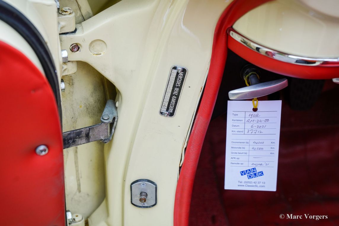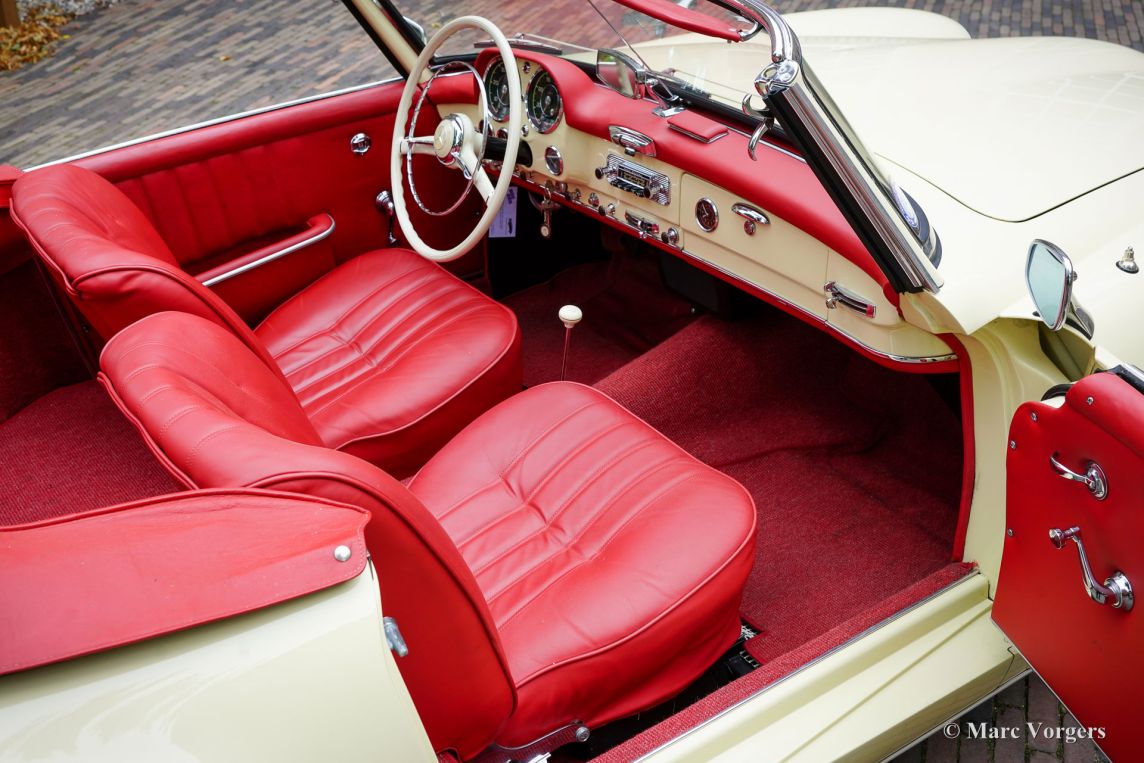 Mercedes-Benz 190 SL, Baujahr 1959. Fahrgestellnummer 121040-10-9500466. Farbe Elfenbein (wir glauben, es ist Elfenbein DB608), kombiniert mit einer roten Lederausstattung und rotem Teppich. Dieser großartige Mercedes-Benz 190 SL wurde erstmals am 28. Februar 1959 zugelassen und am 7. November 2006 in die Niederlande importiert. Vor etwa einem Jahrzehnt wurde das Auto umfassend in Concours-Zustand restauriert! Das Auto ist immer noch in einem wunderbaren Top-Zustand! Das Auto hat schöne Originaldetails und weist nur minimale Gebrauchsspuren auf. Dieser großartige Mercedes 190 SL wurde im Juni 2021 vom jetzigen Besitzer gekauft und vom Mercedes-Benz SL-Spezialisten van Dijk in den Niederlanden gewartet, wo auch ein wunderschönes Becker Europa-Radio eingebaut wurde. Der Mercedes-Benz 190 SL wurde erstmals am 6. Februar 1954 als Prototyp auf der International Motor Sports Show in New York präsentiert. Bei diesem Debüt fuhr größtenteils der US-Importeur Max Hoffman. Die Serienversion wurde im März 1955 auf dem Genfer Autosalon vorgestellt. Der Mercedes-Benz 190 SL ist ein eleganter zweisitziger Roadster, der als erschwinglichere Ergänzung zum sehr teuren Sechszylinder-Sport-/Rennwagen 300 SL konzipiert wurde. Der 190 SL bietet edles Design und ein komfortables Reiseerlebnis statt purer Leistung. Dieses wunderschöne Exemplar wurde hochwertig restauriert und befindet sich in einem hervorragenden Zustand. Ein tadelloses Exemplar für den anspruchsvollen Mercedes-Benz-Enthusiasten/-Sammler. Dieses Fahrzeug kann nur nach vorheriger Terminvereinbarung besichtigt und Probe gefahren werden.