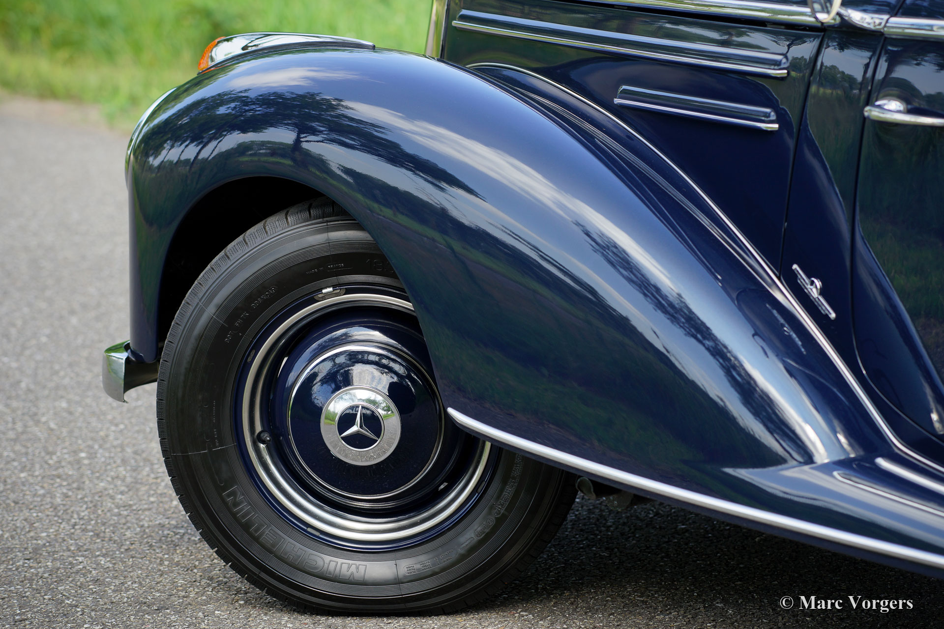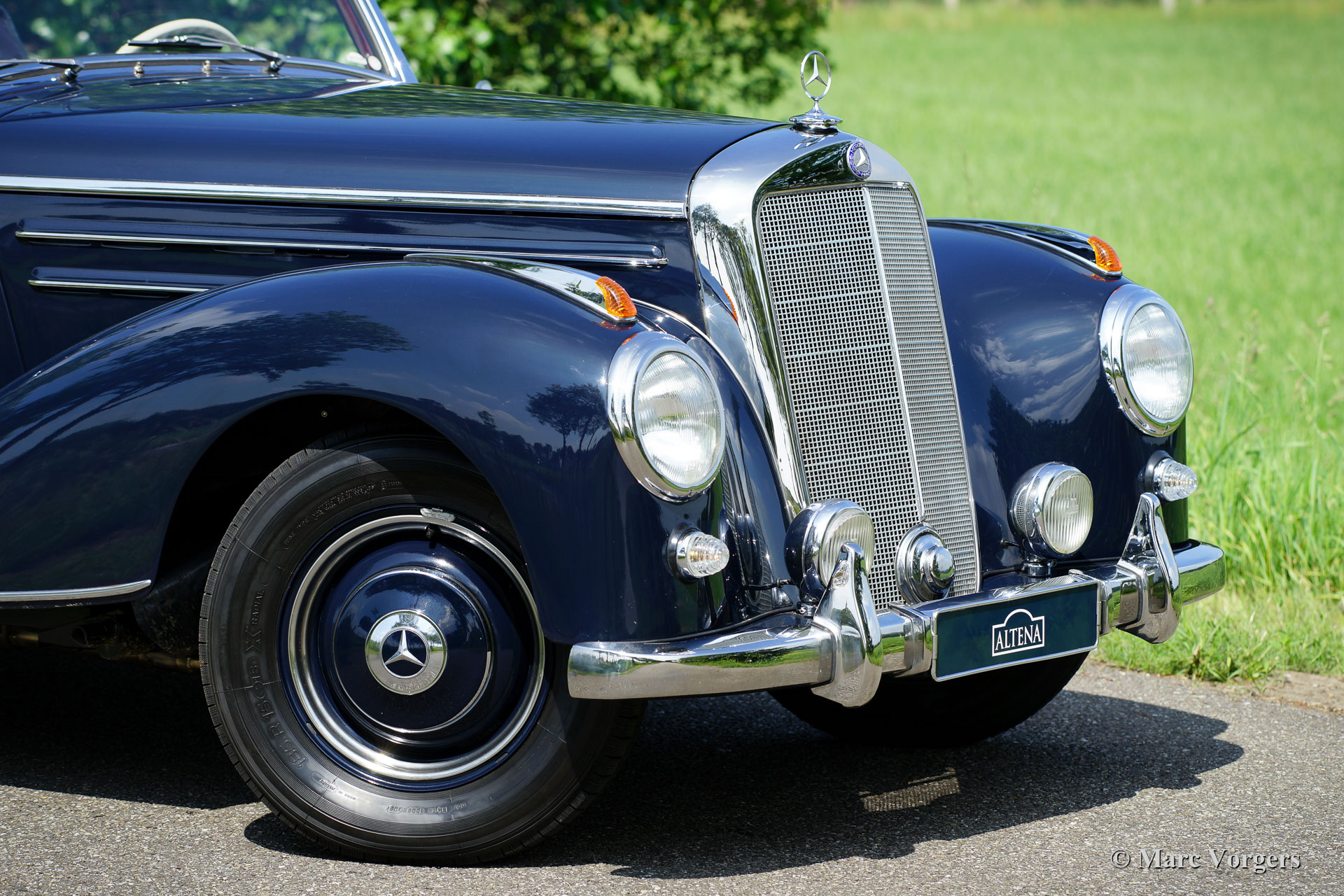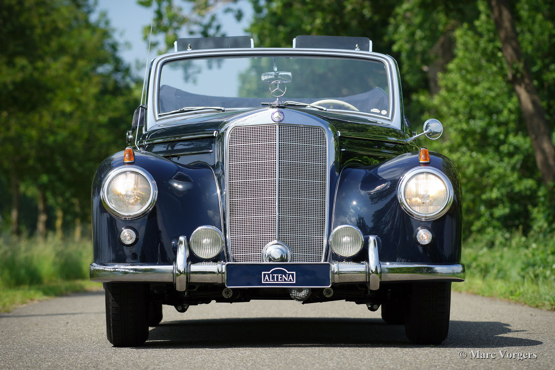 Mercedes-Benz 220 Cabriolet A, Jahr 1951. Farbe dunkelblau kombiniert mit einem grauen Lederausstattung und grauem Teppich. Dunkelblaues Verdeck und Verdeck Abdeckung. In den 1990er Jahren wurde dieses wunderschöne und seltene Mercedes 220 Cabriolet A von einem niederländischen Mercedes-Benz-Spezialisten umfassend restauriert. Alles wurde restauriert, überholt und / oder erneuert, nur die ursprüngliche Lederausstattung wurde renoviert und in das restaurierte Auto übernommen. Nach über 20 Jahren und nur 4983 Kilometern seit der Restaurierung ist das Auto immer noch in einem ausgezeichneten Zustand! Die Karosserie, Lackierung und Chrom sind in einem hervorragenden Zustand. Der Maschinenraum, die Unterseite und der Kofferraum sehen schön und sauber aus. Das Interieur befindet sich in gutem Zustand mit Gebrauchsspuren und Altersspuren. Das Auto zeigt alle Originaldetails und ist mit dem werkseitigen Original-Becker-Radio und den Bosch-Nebelscheinwerfern ausgestattet. Darüber hinaus wird das Auto mit der originalen Werkzeugrolle und dem äußerst seltenen originalen Kofferset von „Bad Cannstadt“ geliefert. Diese 220 Cabriolet A ist ein rares und sehr wünschenswertes Beispiel.