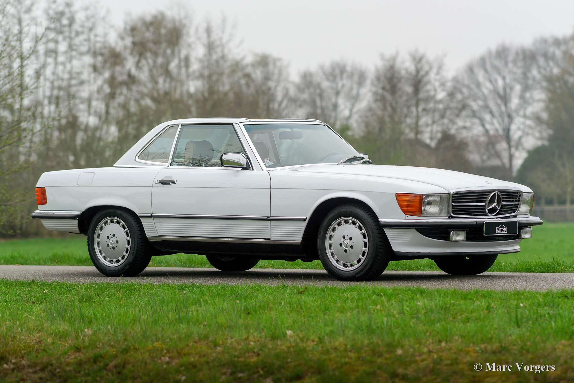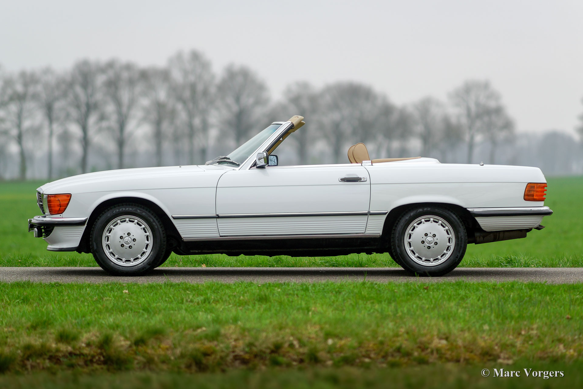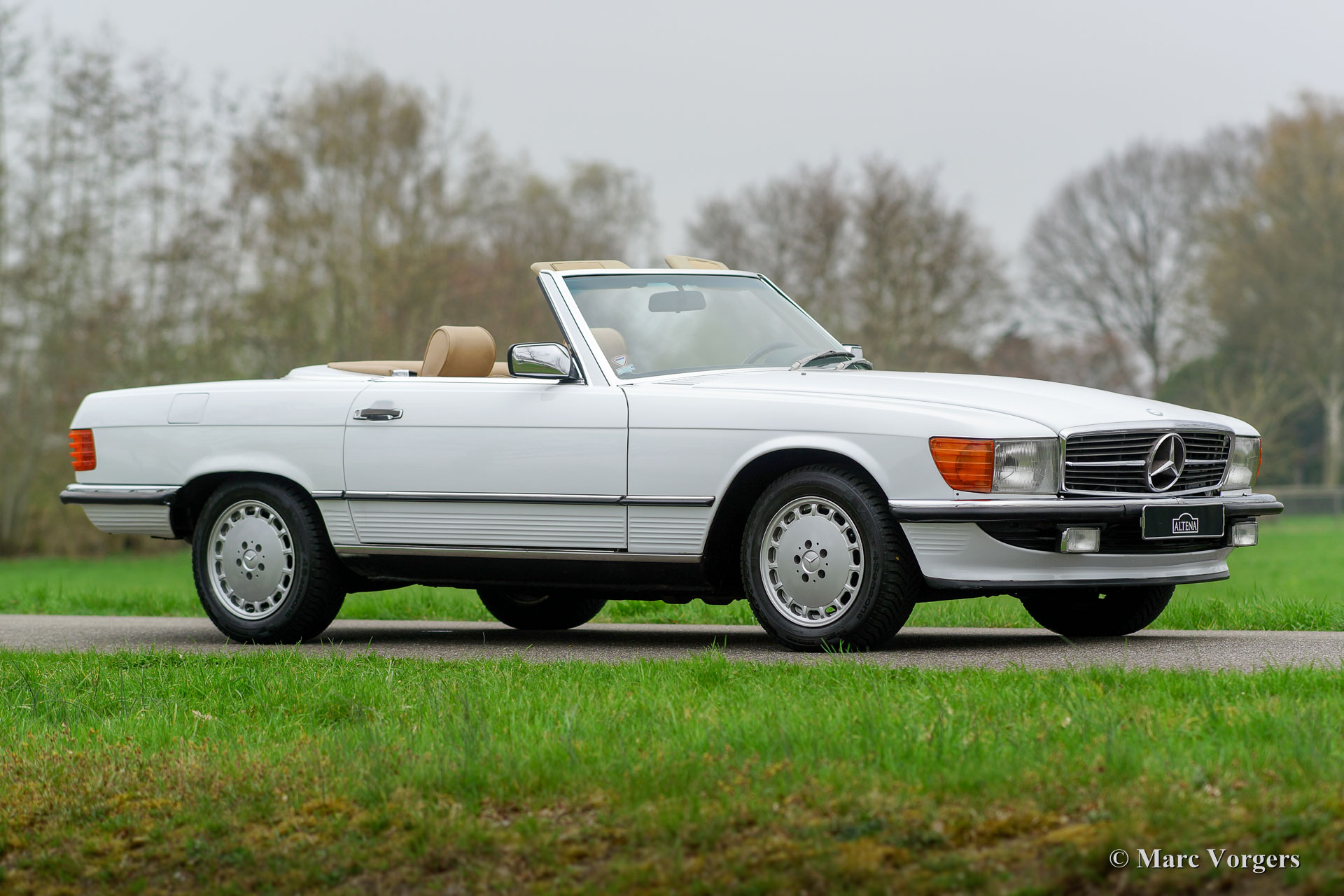 Mercedes-Benz 300 SL (Typ R 107), Jahr 1987. Fahrgestellnummer WDB1070411A06524X. Farbe weiß (Arktik Weiß) mit einer beigefarbenen Lederausstattung und beigefarbenem Teppich. Original Hard-Top in Wagenfarbe und ein schwarzes Mohair-Verdeck. Dies ist eine original europäische R 107 300 SL, das Automobil wurde neu in Deutschland verkauft. Das Auto wurde im Jahr 2015 in die Niederlande importiert. Dieser Mercedes 300 SL ist in einem sehr guten bis hervorragenden und super originalen Zustand! Dies ist das begehrenswerteste Sechszylinder-Modell mit dem sehr seltenen manuellen Getriebe! Das Auto ist sehr gut dokumentiert, die Datei enthält eine MB-Datenkarte mit Originalangaben und -nummern, Service-Rechnungen und allen Original-Handbüchern. Das ursprüngliche Bord-Werkzeug ist auch noch vorhanden. Dies ist ein herrlicher Mercedes-Benz 300 SL in super originalem Zustand! Das Auto ist bereit für jede Urlaubsreise oder was auch immer der neue Besitzer mit das Auto vor hat!