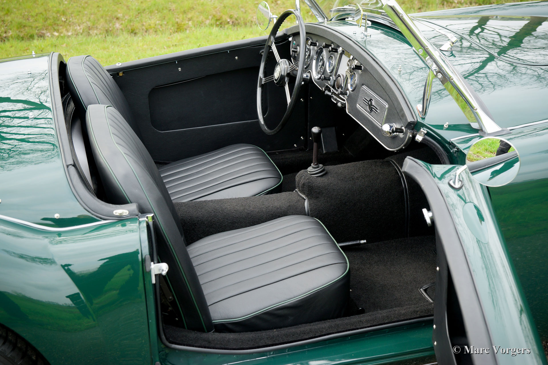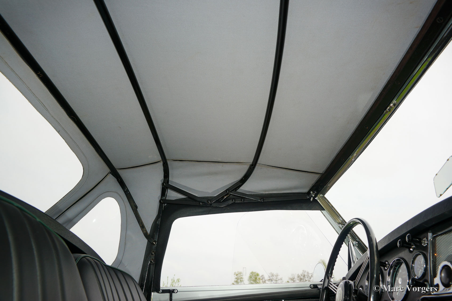 MG MGA 1500 Roadster, Jahr 1958. Farbe dunkel British Racing Green kombiniert mit einer schwarzen Lederausstattung mit grünen Paspeln und schwarzem Teppich. Schwarzes Verdeck und Seitenfenster Rahmen aus Aluminium. Dieser prächtige MGA 1500 Roadster wurde in den Jahren 2020-2021 perfekt restauriert und hat seit seiner Fertigstellung nur 1500 Kilometer zurückgelegt. Alles wurde restauriert, überarbeitet und / oder erneuert. Die Karosserie wurde aus blankem Metall restauriert, der Innenraum neu gepolstert, Chromteile neu verchromt, ein neuer Kabelbaum eingebaut, ein Edelstahlauspuff und neue Chromdrahträder eingebaut und Motor und Getriebe überholt. Ein Fotobericht der Restaurierung liegt vor. Dieser MGA 1500 ist in einem perfekten und neuwertigen Top-Zustand! Auf Wunsch des Besitzers wurde das Armaturenbrett wunderschön in schwarzem Vinyl (1600 Mk II-Stil) ausgeführt und 1600 Abzeichen wurden neben dem Motorhaube angebracht. Dieser wunderschöne und hochwertige MG MGA 1500 sieht aus, fährt und fühlt sich brandneu an. Das Auto kann in jedes Land importiert werden.