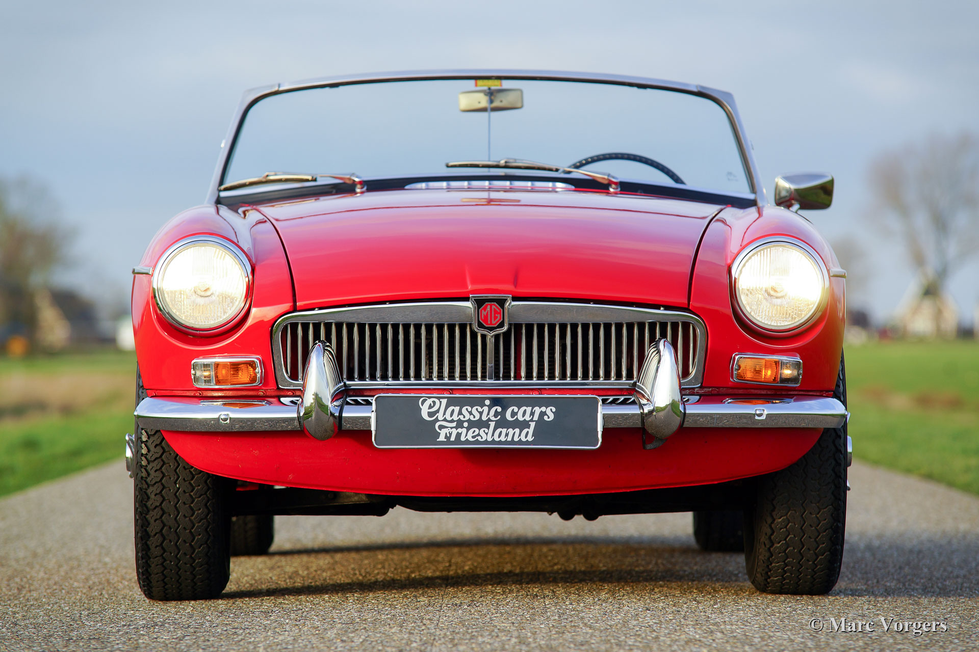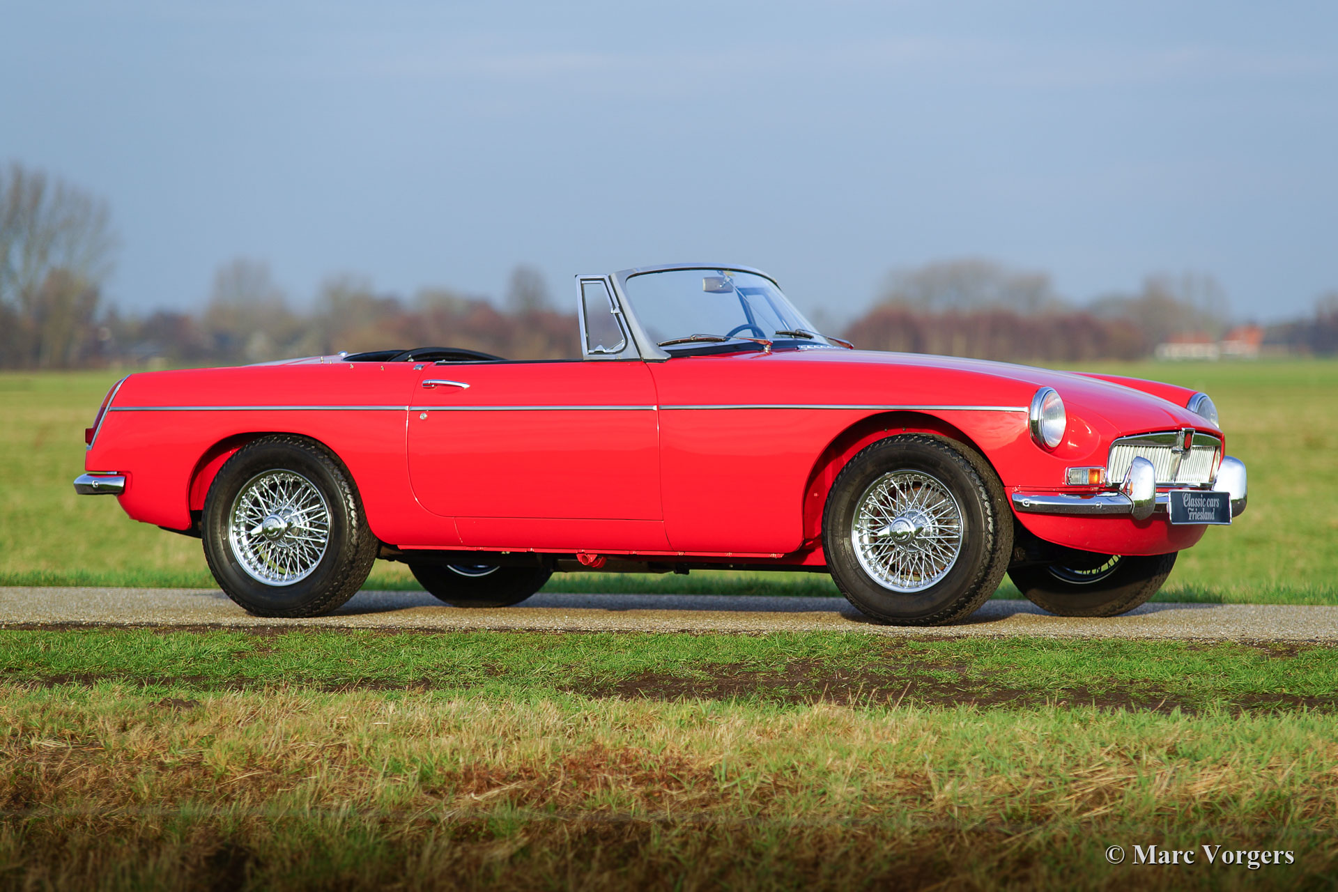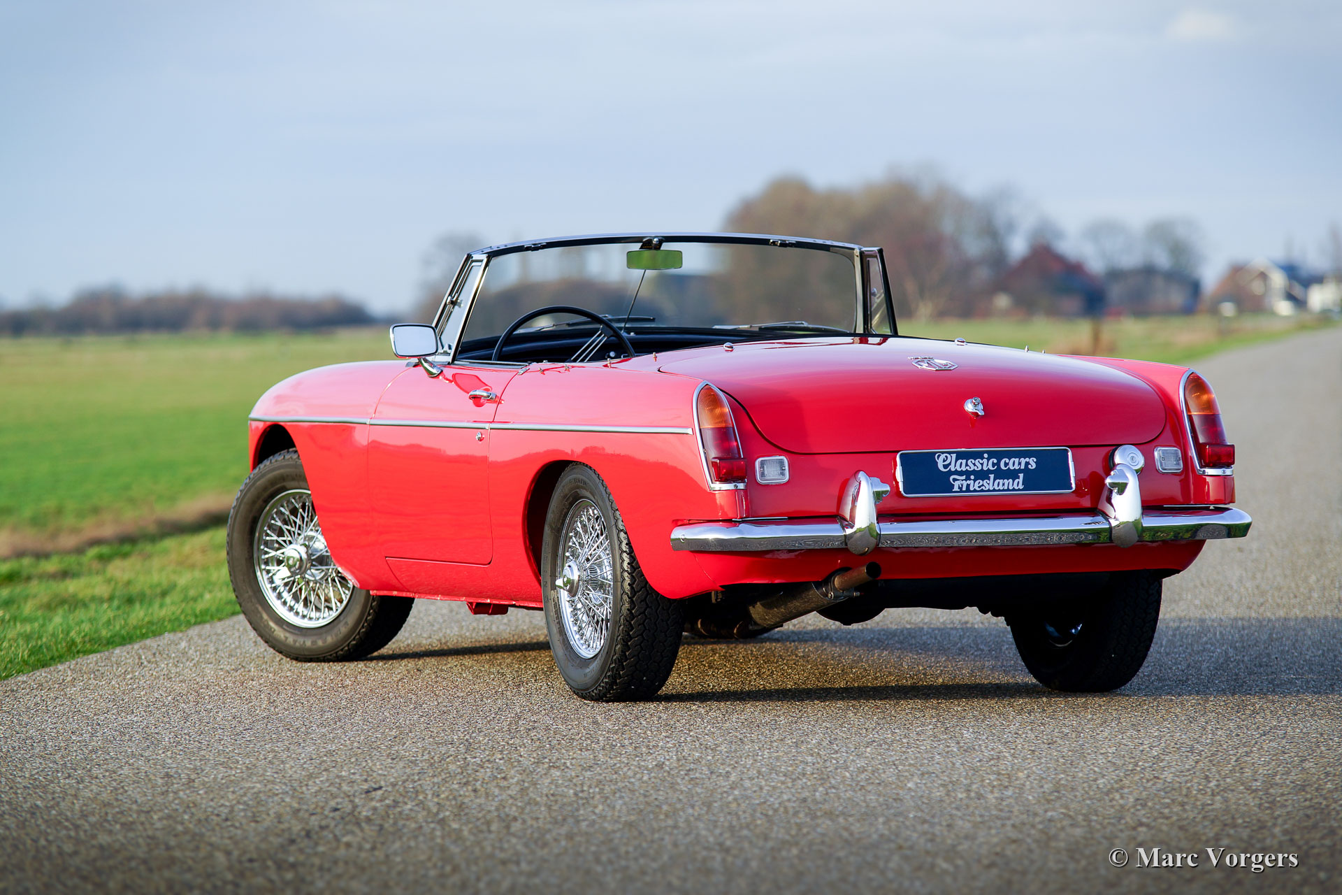 MG MGB Roadster Mk 1, Jahr 1966. Farbe rot kombiniert mit einem schwarzen Lederinterieur getrimmt mit weißen Paspeln. Schwarzes Mohair-Verdeck und Verdeck-Abdeckung. Dieser wundervolle MGB-Roadster wurde in den Jahren 2015 - 2017 in den Niederlanden vollständig restauriert. Die Karosserie wurde von Grund auf (vom blanken Metall aus) restauriert und die Arbeiten wurden mit einer professionellen Lackierung innen und außen einschließlich der Unterseite abgeschlossen. Alles wurde restauriert, überholt und / oder erneuert; Motor, Bremsen, Kühlsystem, Armaturenbrettanzeigen usw. Ein manuelles 5-Gang-Getriebe (Modifikation) und eine Edelstahl-Abgasanlage wurden eingebaut. Eine umfangreiche Wiederherstellungsdatei ist vorhanden. Dieser wunderschöne MGB Mk 1 Roadster befindet sich in einem hervorragenden Top-Zustand und das Auto zeigt wunderschöne originelle Details wie das Armaturenbrett aus Metall und das Originallenkrad. Das Auto ist ausgestattet mit verchromten Drahträdern und einem Schaltknauf aus Walnussholz.