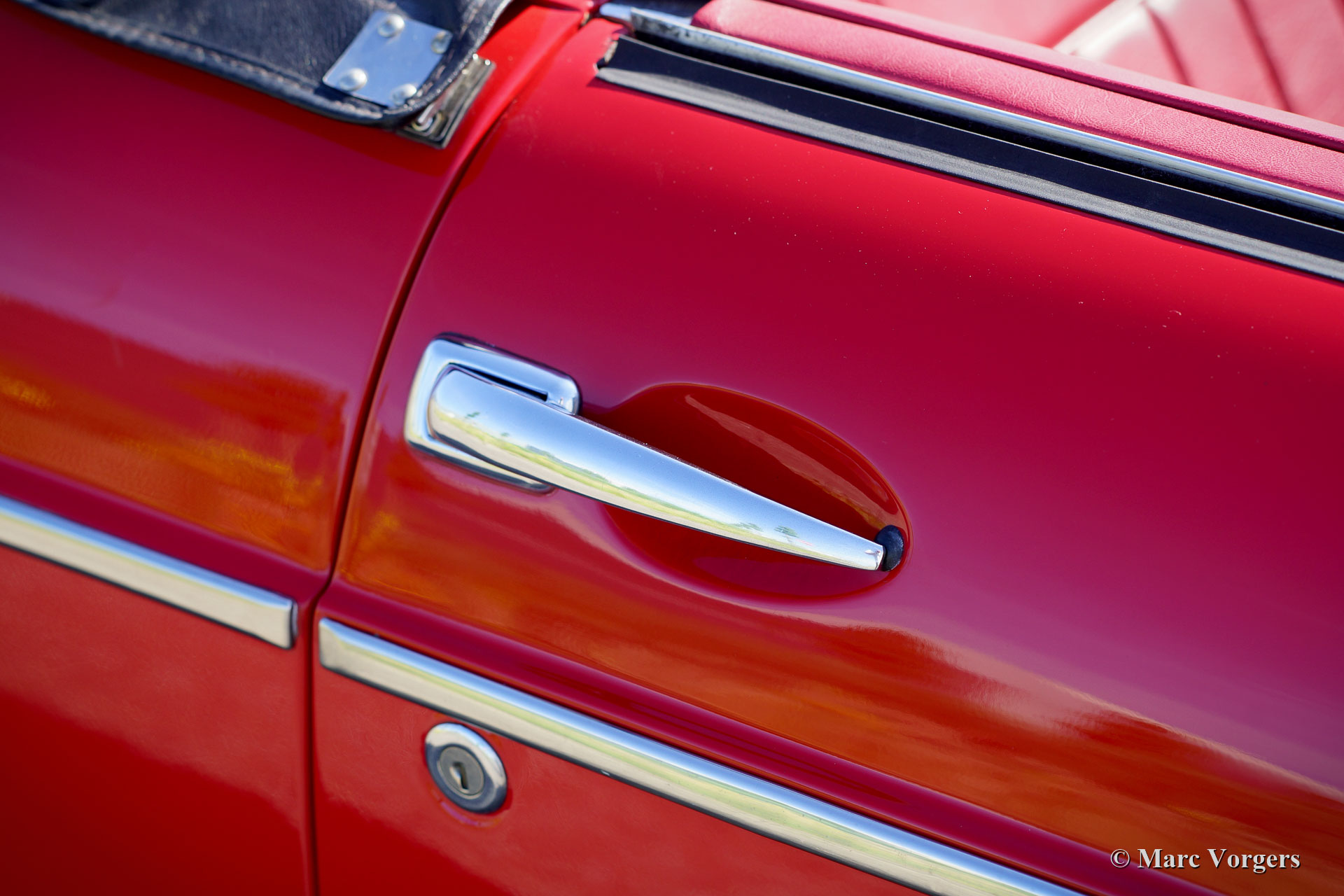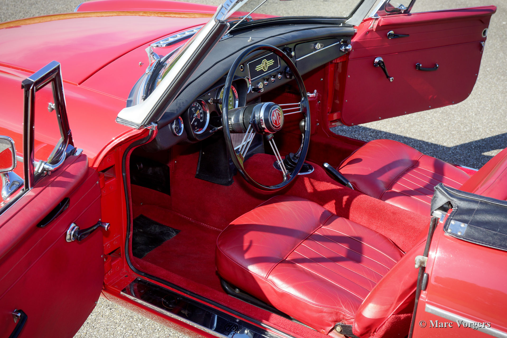 MG MGB Roadster Mk I ‘Ziehgriff-Modell’, Jahr 1965. Farbe rot kombiniert mit einer roten Lederausstattung. Schwarzes Vinyl-Verdeck und Verdeck-Abdeckung. Dieser wunderschöne MGB Roadster ist in einem ausgezeichneten Zustand und das Auto fährt herrlich! Dies ist das früheste MGB Modell mit den speziellen ‘Ziehgriff‘-Türgriffen. Außerdem sind das schöne Armaturenbrett aus Metall, mit schwarzer ‘Faltenfarbe, und das fantastische originale Lenkrad vorhanden! Darüber hinaus verfügt das Auto über silber lackierte Speichenräder, Servobremsen, einen Ölkühler, eine Edelstahl-Auspuffanlage und einen verchromten Gepäckträger. Kürzlich wurden neue Federn eingebaut, Sprungfedern an der Vorderseite und parabolische Blattfedern an der Rückseite. Dies ist ein sehr begehrliches früher MGB Roadster!