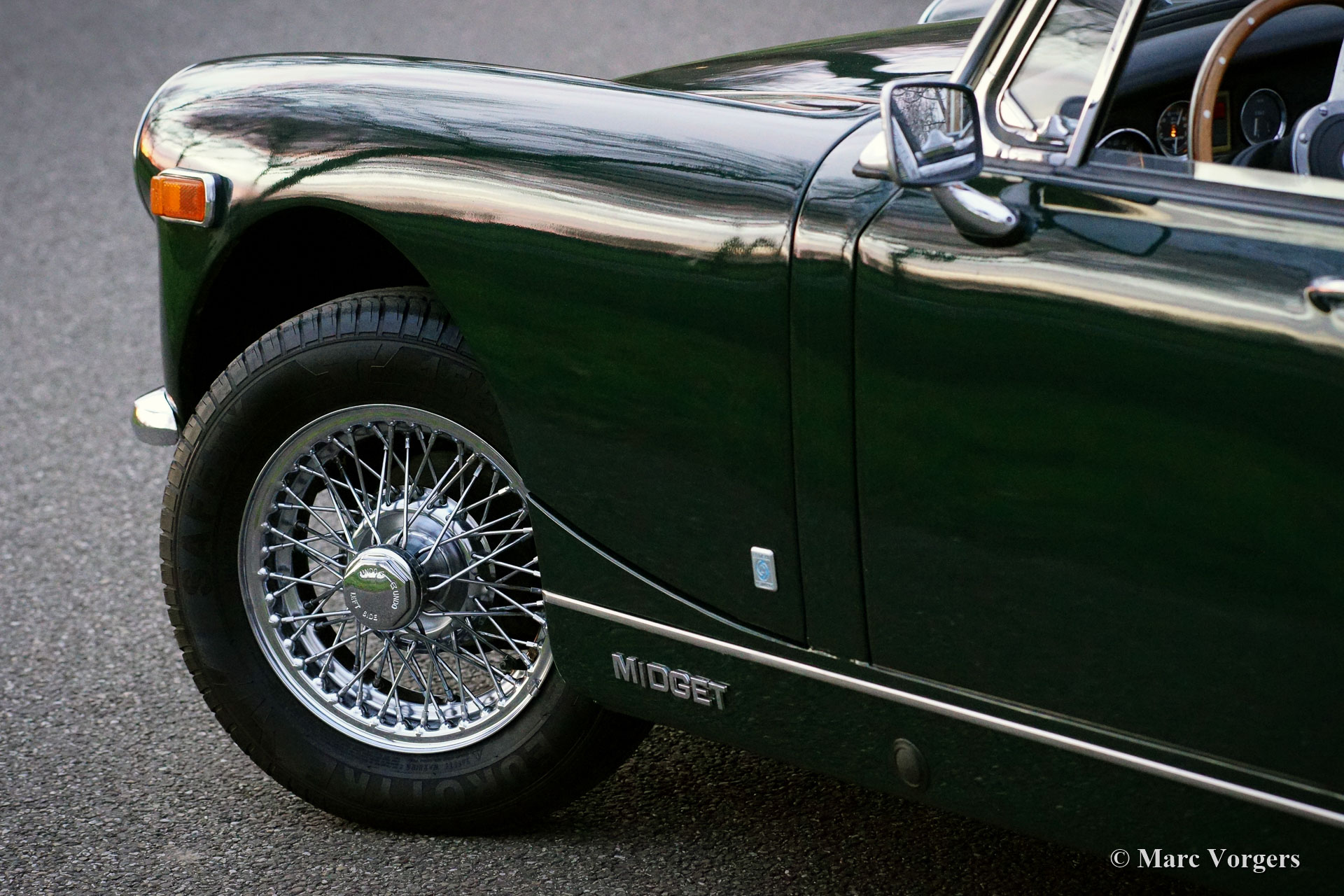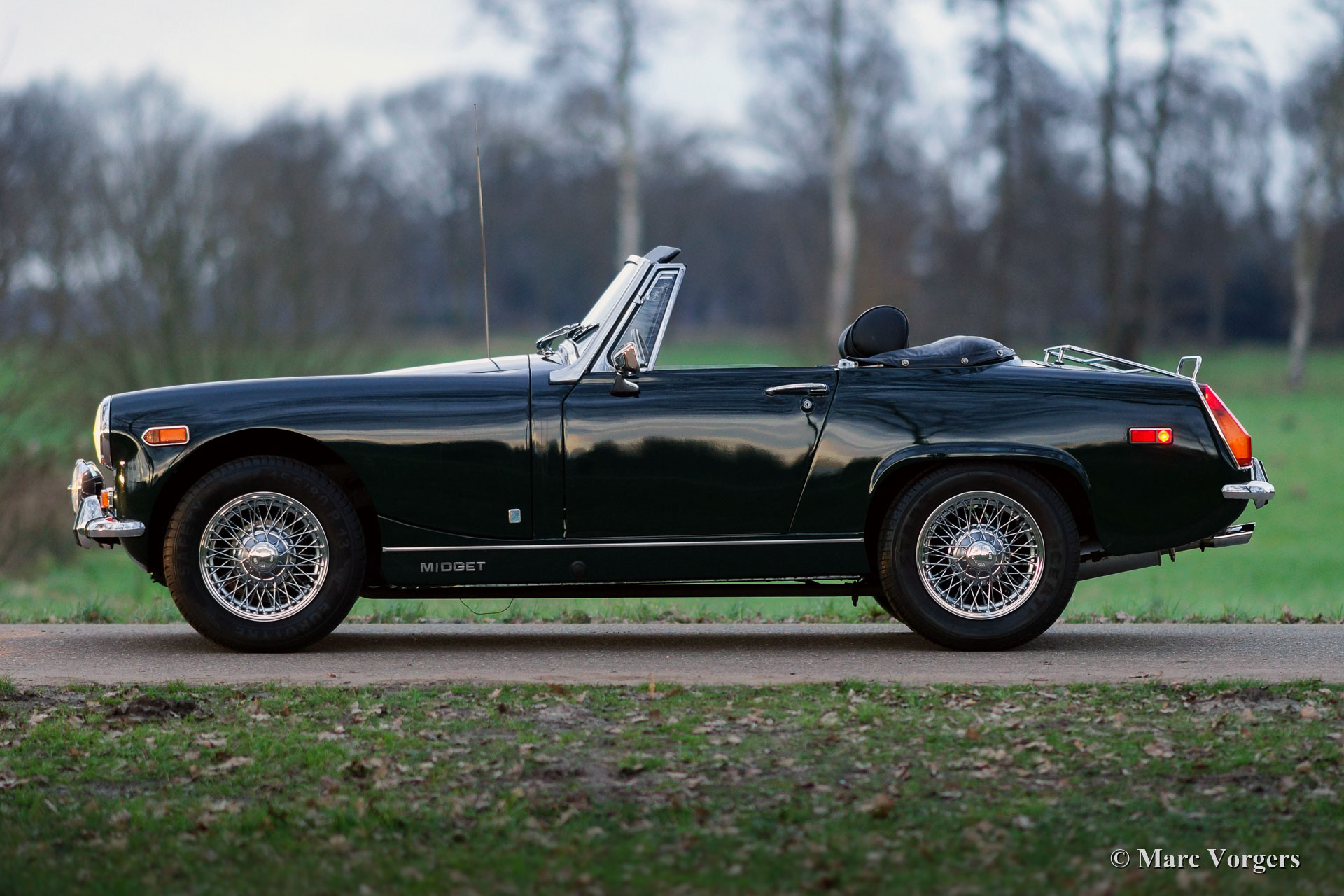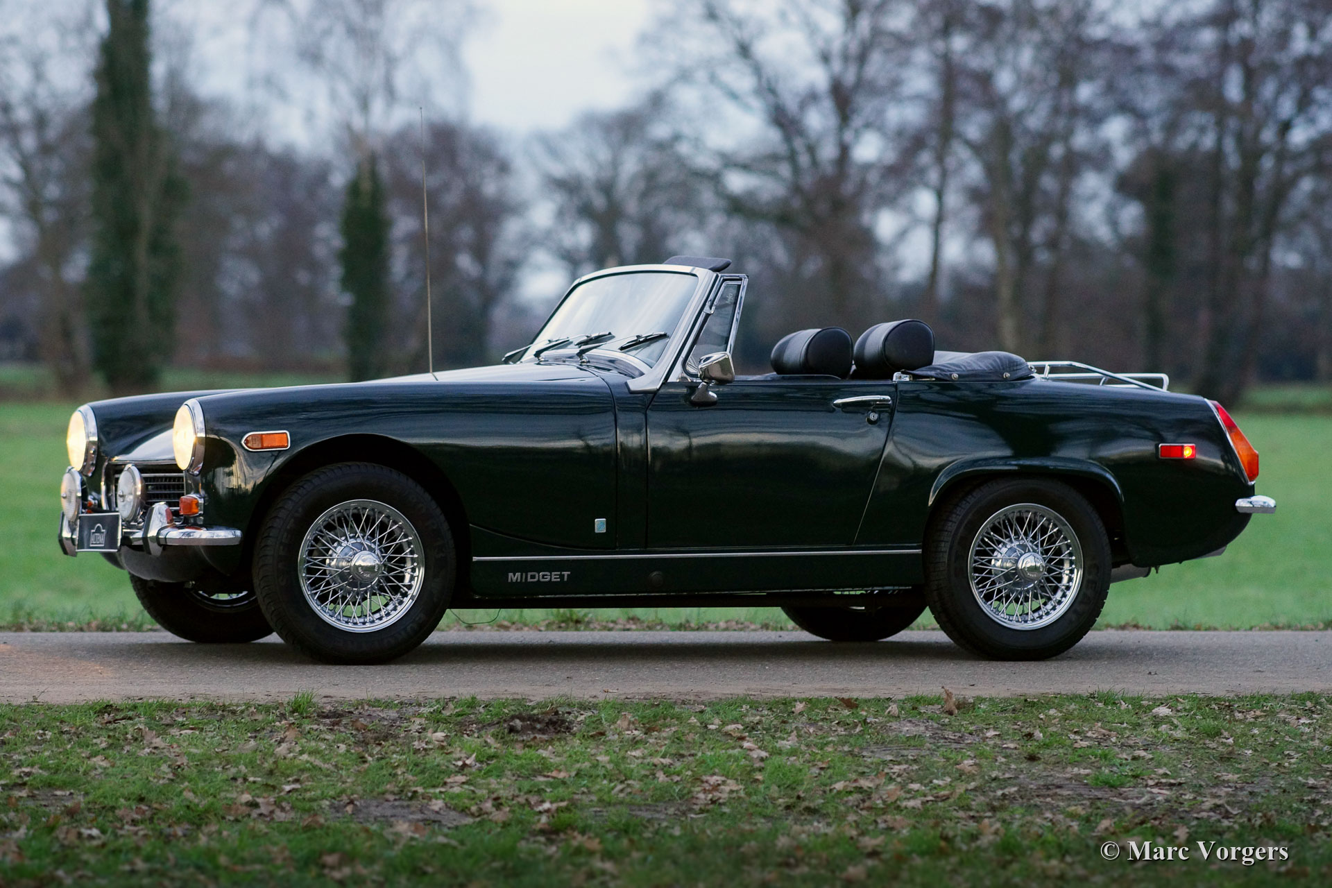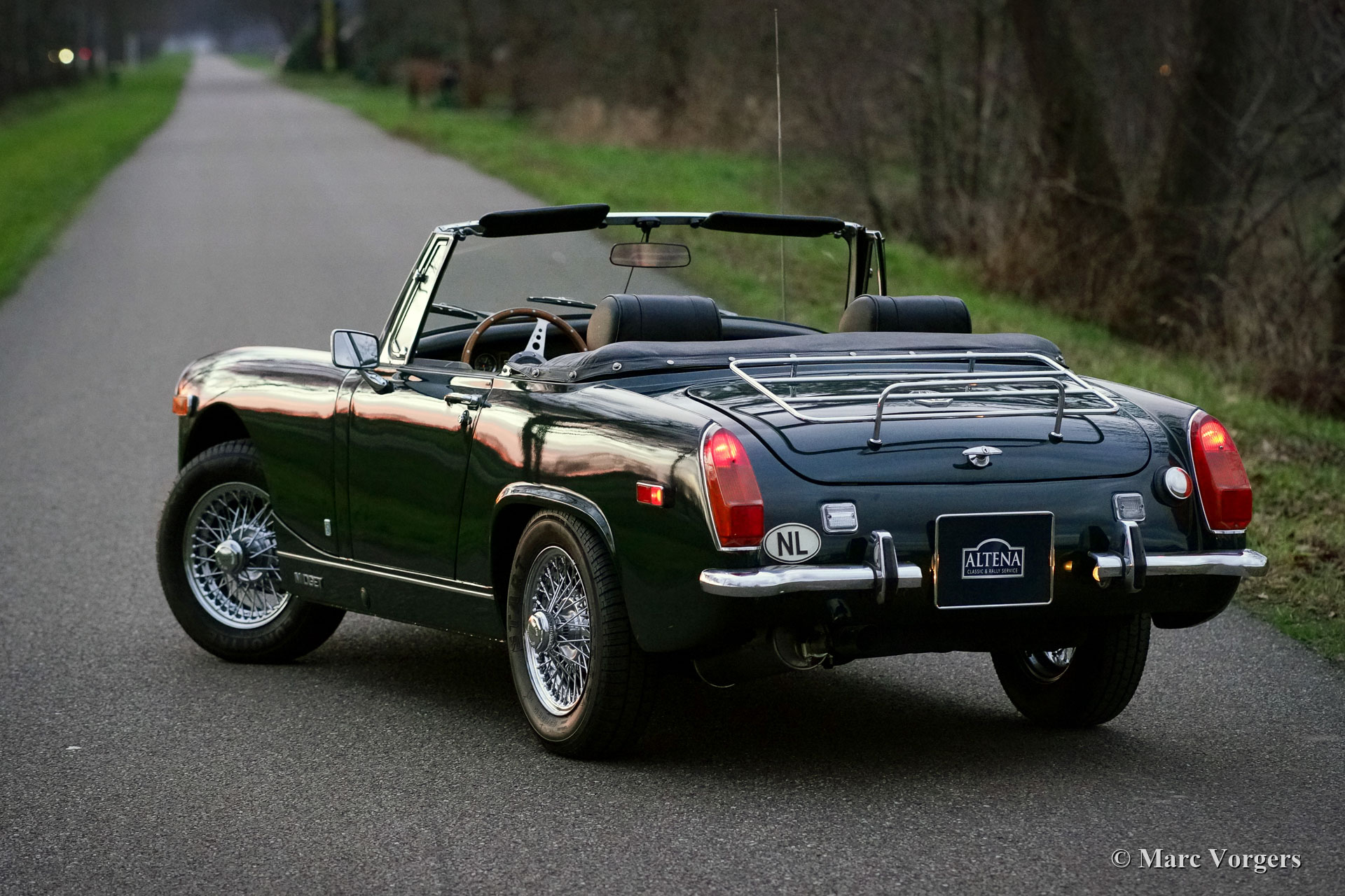 MG Midget 1275 Mk III, Jahr 1970. Farbe dunkel British Racing Green kombiniert mit einem schwarzen Kunstleder Interieur und schwarzem Teppich. Schwarzes Vinylverdeck. Dieser sehr schöne MG Midget wurde in Kanada neu verkauft. Im Jahr 1999 wurde das Auto in die Niederlande importiert. Seit 1999 kennt das Auto nur einen niederländischen Besitzer, der das Auto mit Liebe geschätzt hat. Im Jahr 2000 erhielt das Auto einen schönen neuen Lack, und im Zeitraum 1999-2021 wurde das Auto perfekt gewartet und auf dem neuesten Stand gehalten. Viele Teile wurden erneuert, alle Rechnungen sind vorhanden. Die Verlaufsdatei enthält auch Dokumente aus der kanadischen Zeit. Dieser entzückende MG Midget 1275 ist innen und außen in einem sehr guten und schönen Zustand, und das Auto schaltet, bremst und fährt sehr gut. Das Auto ist ausgestattet mit Chrom-Speichenrädern, einer Chrom-Gepäckablage, einem wunderschönen MotoLita-Lenkrad mit Holzkranz, Lucas-Nebelscheinwerfern vorne, einem zeitrichtigen AM-Radio und einem neuen Vinyl-Verdeck. Dieser MG kann in jedes Land importiert werden. Ein sehr schöner MG Midget mit dem begehrten 1275 ccm Motor!