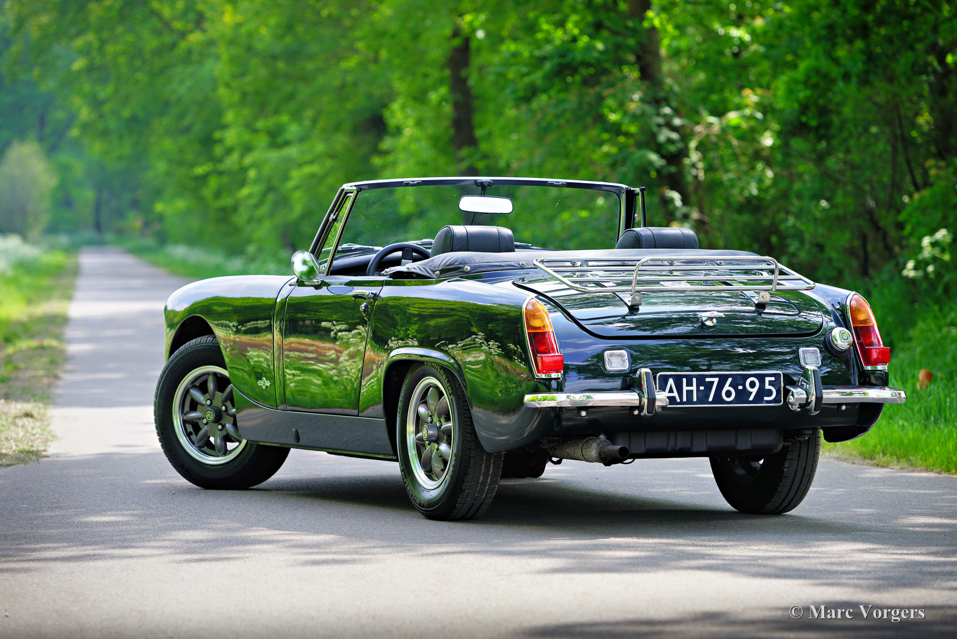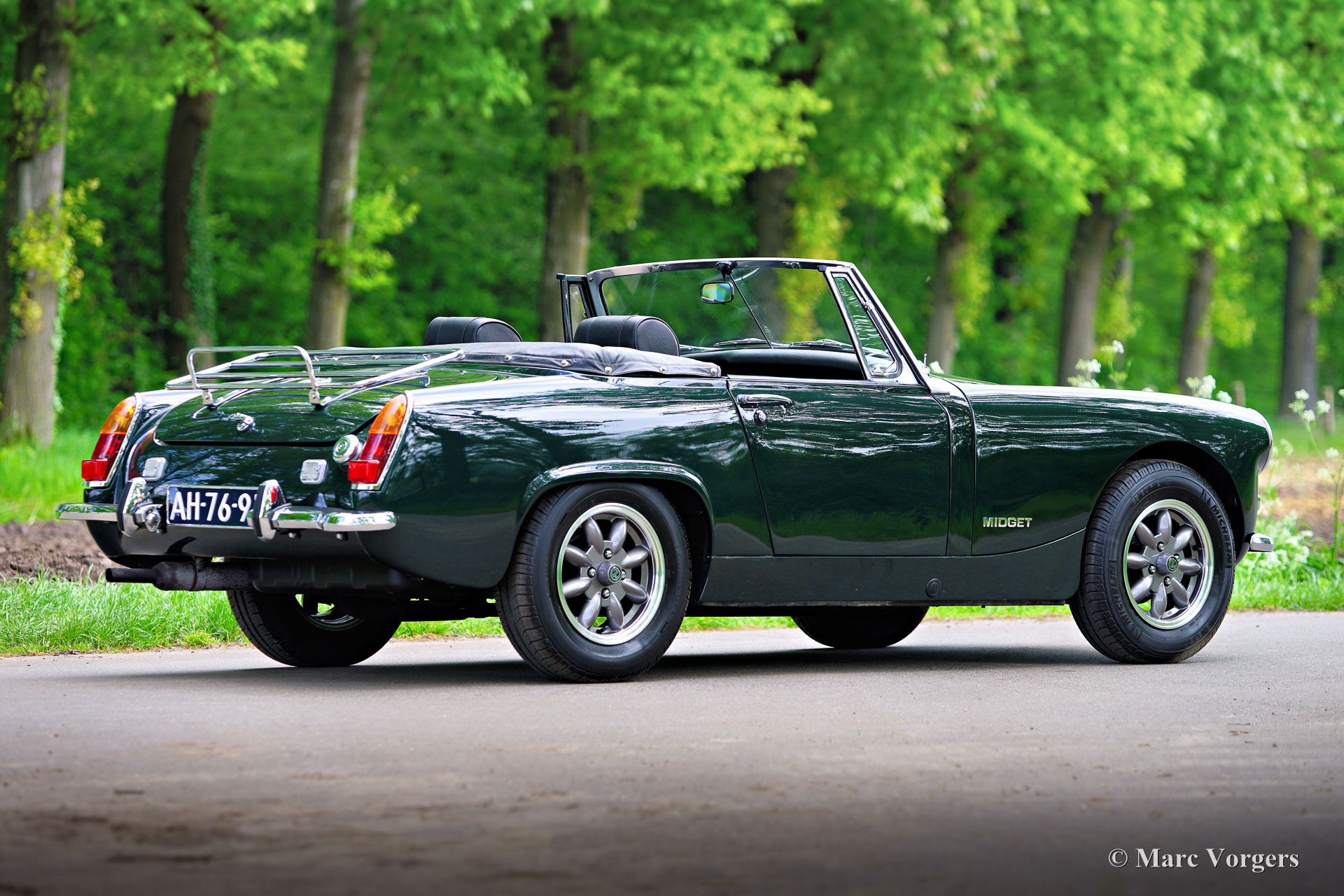 MG Midget MK III, Jahr 1970 (Erstzulassung 1. Juli 1970). Farbe dunkelgrün (British Racing Green) kombiniert mit einer schwarzen Kunstlederausstattung und anthrazitfarbenem Teppich. Schwarzes Vinylverdeck und Verdeck Abdeckung. Dieses entzückende MG Midget MK III-Modell mit wurde in Deutschland neu verkauft und im Mai 2001 in die Niederlande importiert. In den letzten 23 Jahren hatte das Auto fünf begeisterte Besitzer. Der letzte Besitzer beschädigte bedauerlicherweise in einem Moment der Unachtsamkeit die Karosserie. Das Auto wurde von S2 Classic Cars gekauft, im Jahr 2023 wurde das Blech repariert und die Karosserie in unserer Werkstatt restauriert. Das Auto wurde in der Originalfarbe neu lackiert. Darüber hinaus wurde das Auto auf den neuesten Stand gebracht (einschließlich des Einbaus einer neuen Hinterachse) und umfassend gewartet. Der MG A-Series-Motor mit 62 PS und 1275 ccm läuft wunderbar und der Auspuffklang ist sportlich, aber nie ermüdend. Der kompakte Innenraum bietet reichlich Platz für einen Fahrer mit einer Körpergröße von bis zu 185 cm. Das Auto ist ausgestattet mit Leichtmetallfelgen im Minilite-Stil, originalen Kopfstützen, einem Sportlenkrad mit Lederkranz, einer Radiokonsole mit zeitgemäßem Radio und Lautsprecher, K&N-Sportluftfiltern und einer Aluminium-Ventildeckel. Dieser MG Midget sieht wundervoll aus und fährt sich ausgezeignet. Ein wunderbarer Fund für eine Person oder ein Paar, die das britische Fahr- und Lebensgefühl lieben!