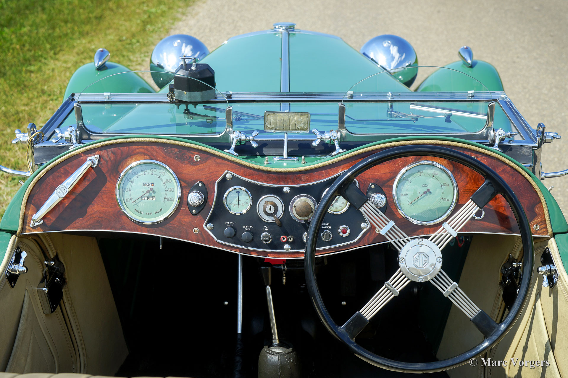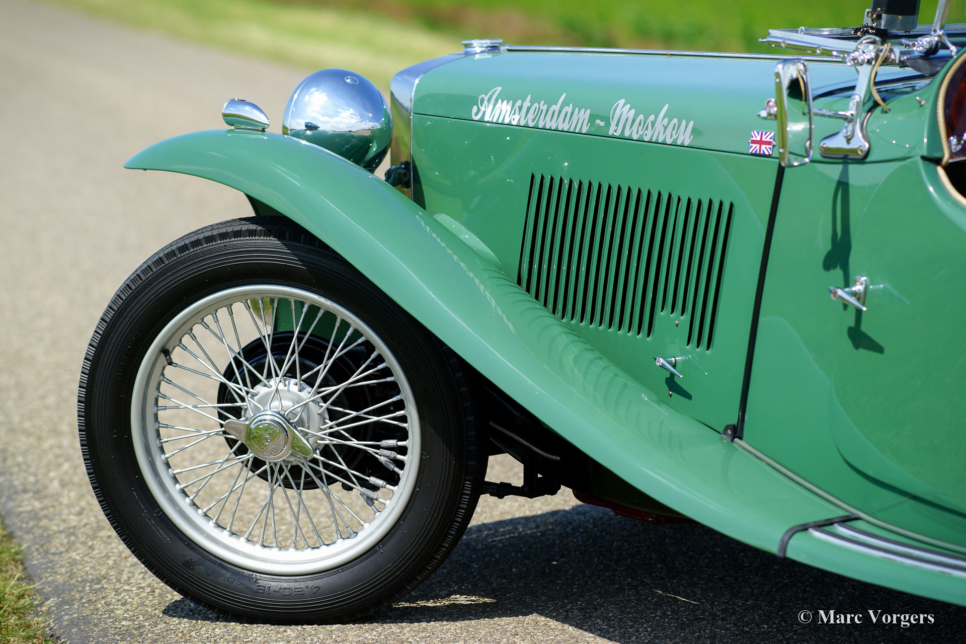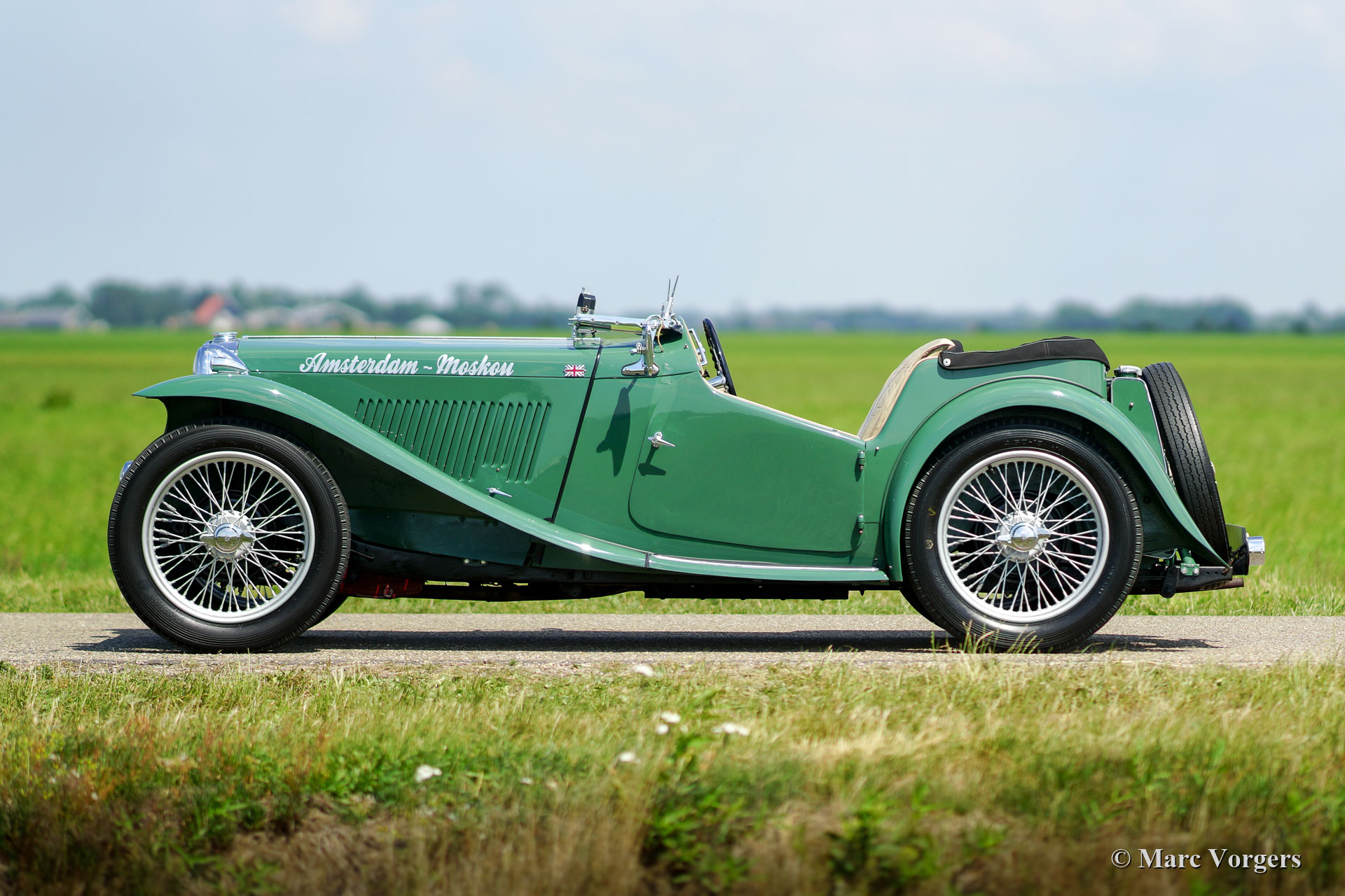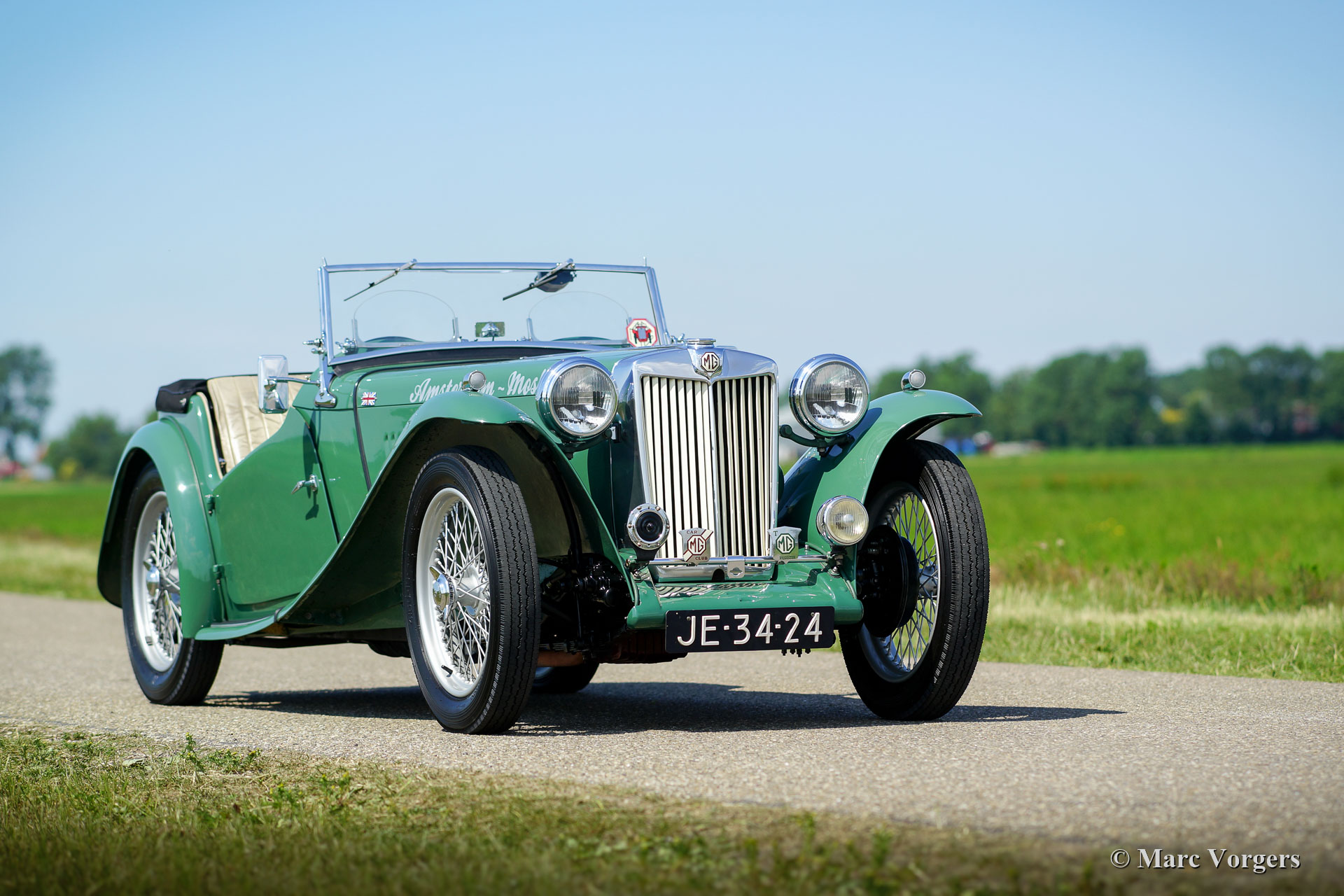 The MG TC was the first new post-war MG. The TC was introduced in 1945, and based on the pre-war TB, it was very similar. A major improvement to the TC was the larger interior, which was increased by 10 cm. The design was similar to the pre-war TB, with swept separate wings, large 19-inch wire wheels and a folding windshield. The MG TB/TC series were much admired by the American soldiers who were on the point of returning to America; this type of small sports car with its smooth handling, was not yet known in America. As a result, many TBs and TCs were shipped to America, and also the MG TC was in great demand at the other side of the pond. All TCs had right-hand steering, leaf springs all around and a 54 bhp four-cylinder engine. In 1950, the MG TC was succeeded by the MG TD.