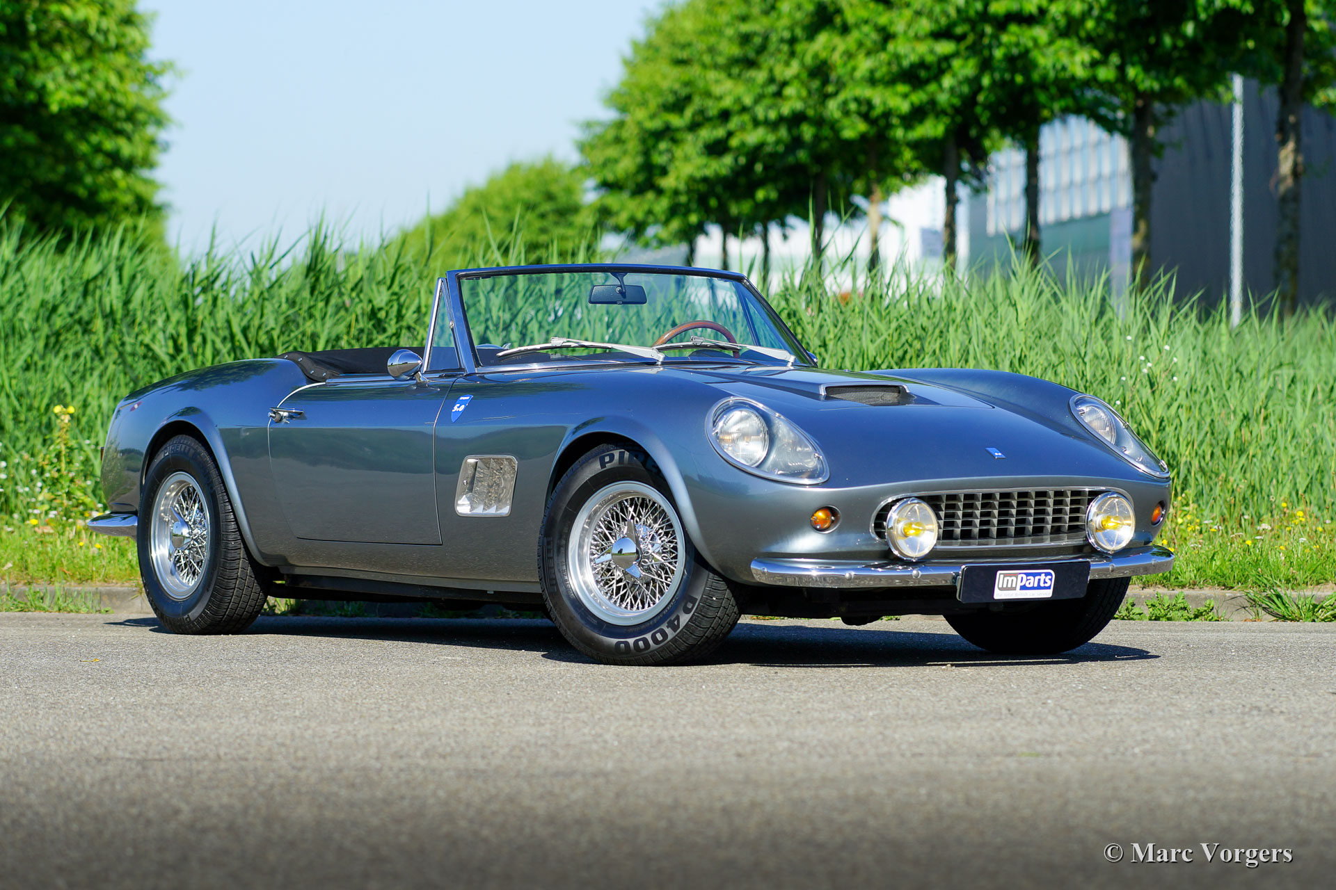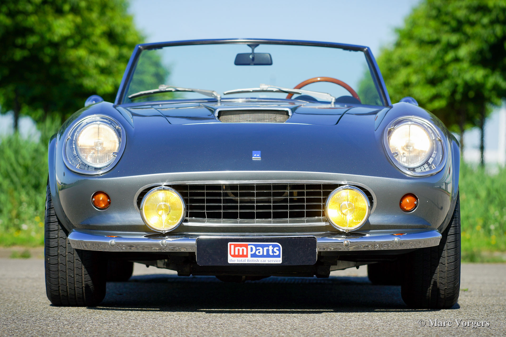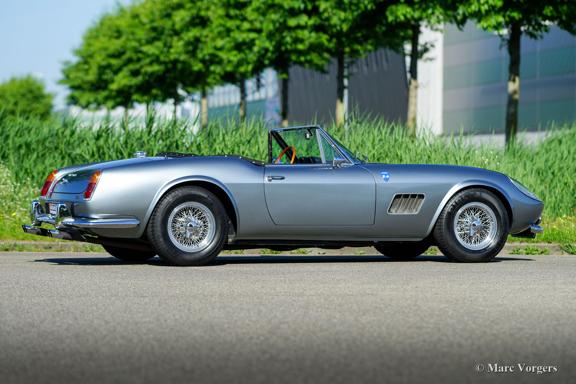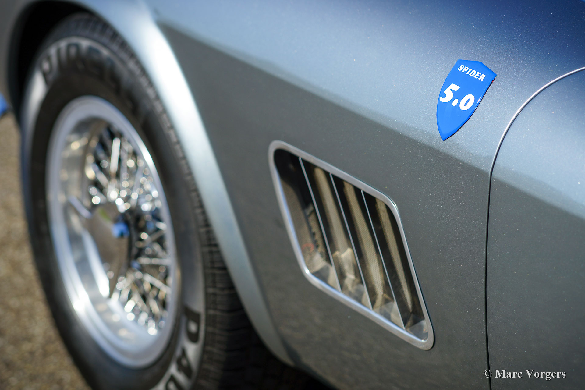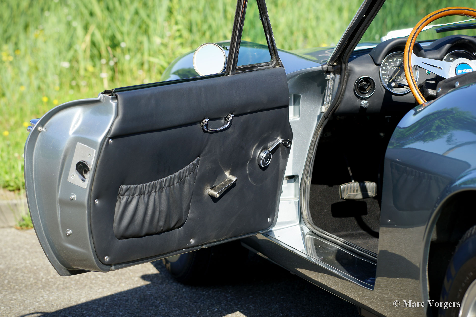 Modena Spyder California, Jahr 1970. Farbe silbermetallic kombiniert mit einer schwarzen Lederausstattung und einem schwarzen Teppich. Schwarzes Verdeck und Hauben Abdeckung. Der Modena Spyder California ist ein 1963er Ferrari 250 GT California-Nachbau mit einer GFK-Karosserie (glasfaserverstärktes Polyester), die von Modena Design and Development in El Cajon, Kalifornien, USA, hergestellt wurde. Die GFK-Karosserie wird verstärkt von ein Stahlbügel und Türinnerteile von Stahl. Der Modena Spyder ist basiert auf einem starren Rohr-Spaceframe-Chassis, das vom Indy-Autodesigner Bob Webb entworfen wurde. Das Chassis verfügt über unabhängige Vorderradaufhängung, eine Starre Hinterachse mit Schraubfedern und rundum sind Scheibenbremsen montiert. Der vorgestellte Modena Spyder ist mit einem Ford 302 cu (5 Liter) V8-Motor ausgestattet, der mit einem Viergang-Automatikgetriebe kombiniert ist. Das Chassis ist sehr robust und gut gefedert, das Auto beschleunigt, fährt und klingt sehr beeindruckend! Dieser Modena Spyder ist weiter versehen von Klimaanlage, Servolenkung, wunderschönen Chromdrahträdern, Pirelli 215 / 70-15-Reifen, Marchal 662/672 Scheinwerfern aus den 1960er und einem Nardi-Lenkrad mit Holzkranz. Der Modena Spyder California wurde weltberühmt wegen seiner wichtigen Rolle in dem 1986 veröffentlichten Film Ferris Buellers Day Off. Das Auto wurde im Jahr 2006 in die Niederlande importiert. Dieser wunderschöne Modena Spyder California hat 9000 Meilen gefahren und das Auto ist in einem Top Zustand!