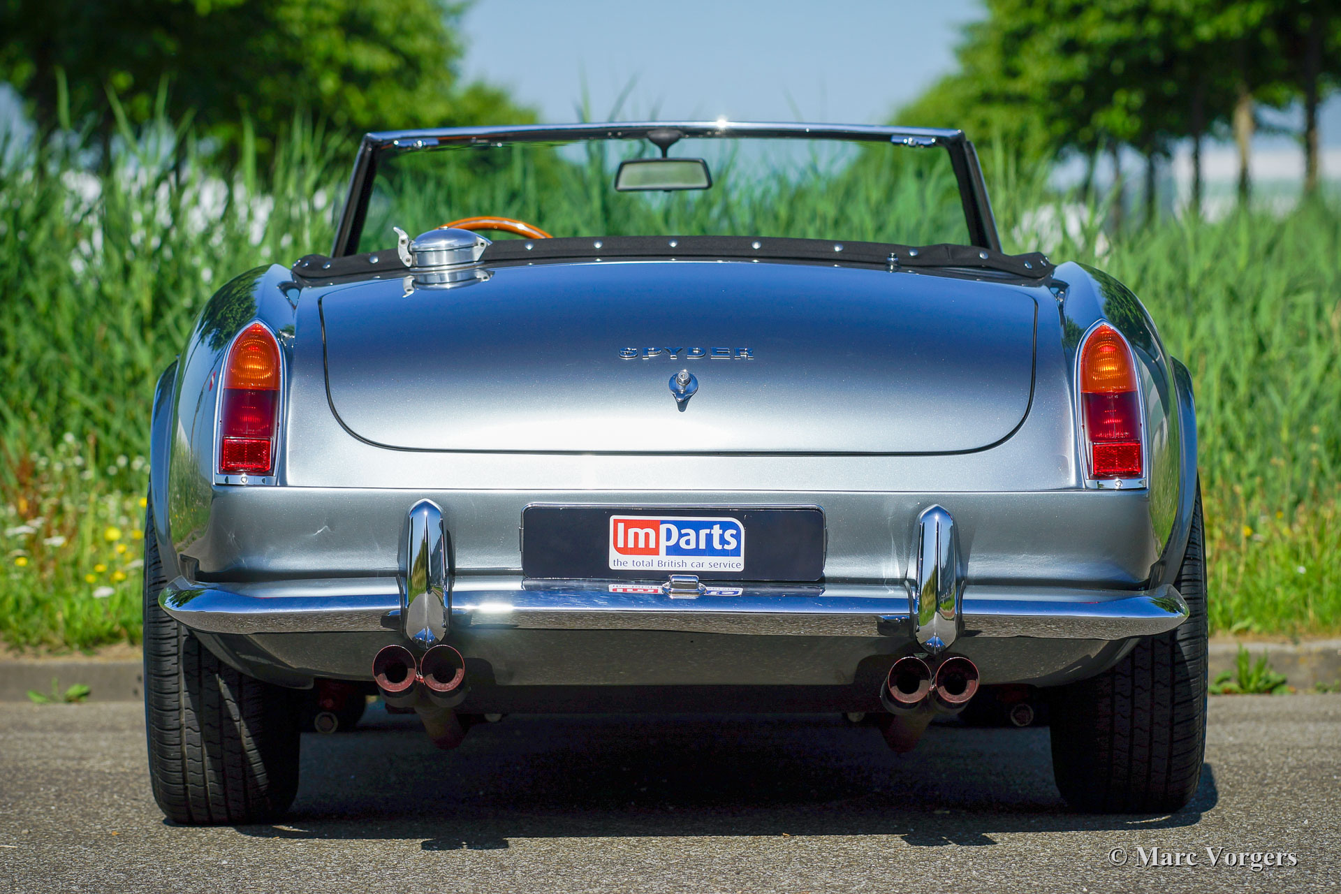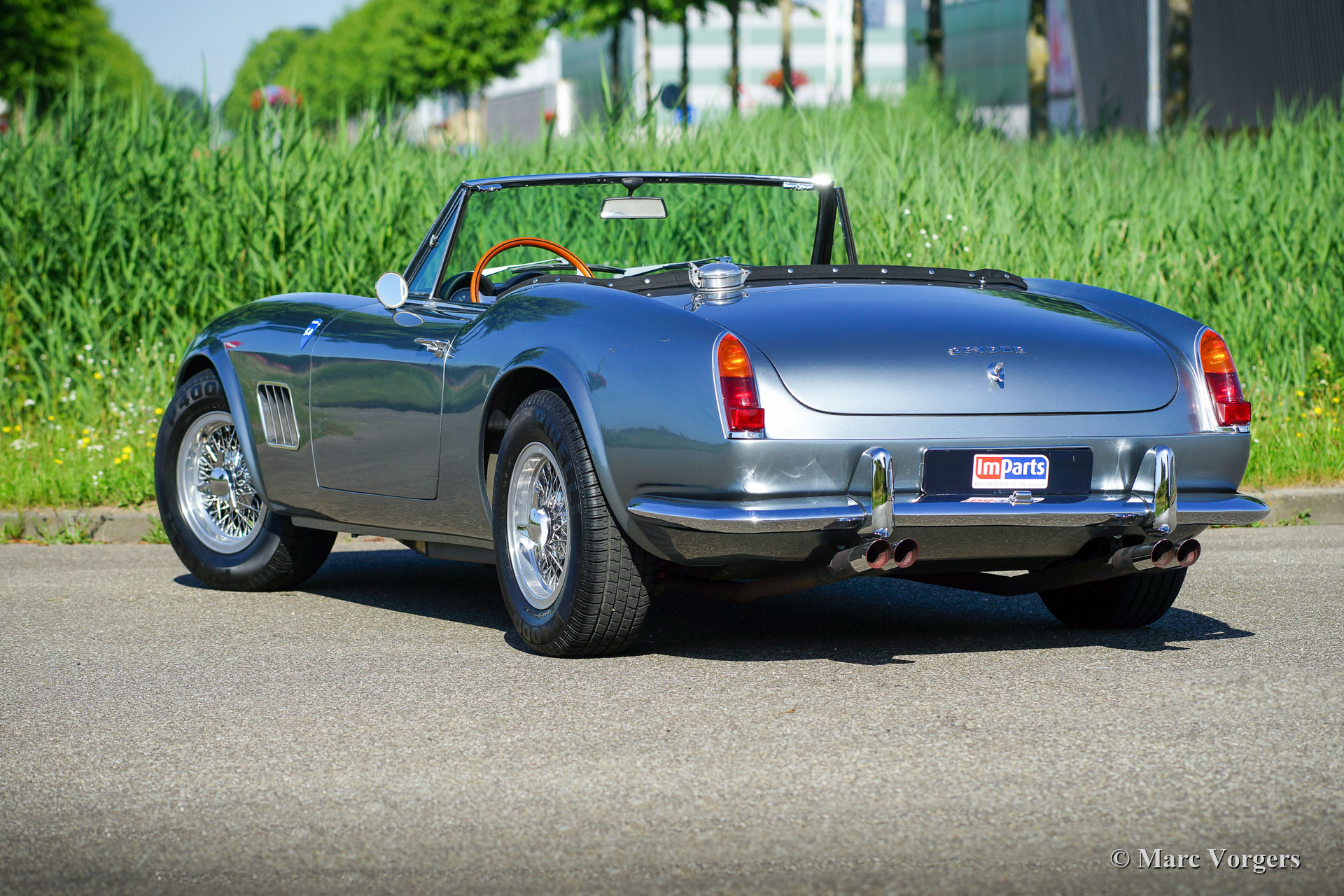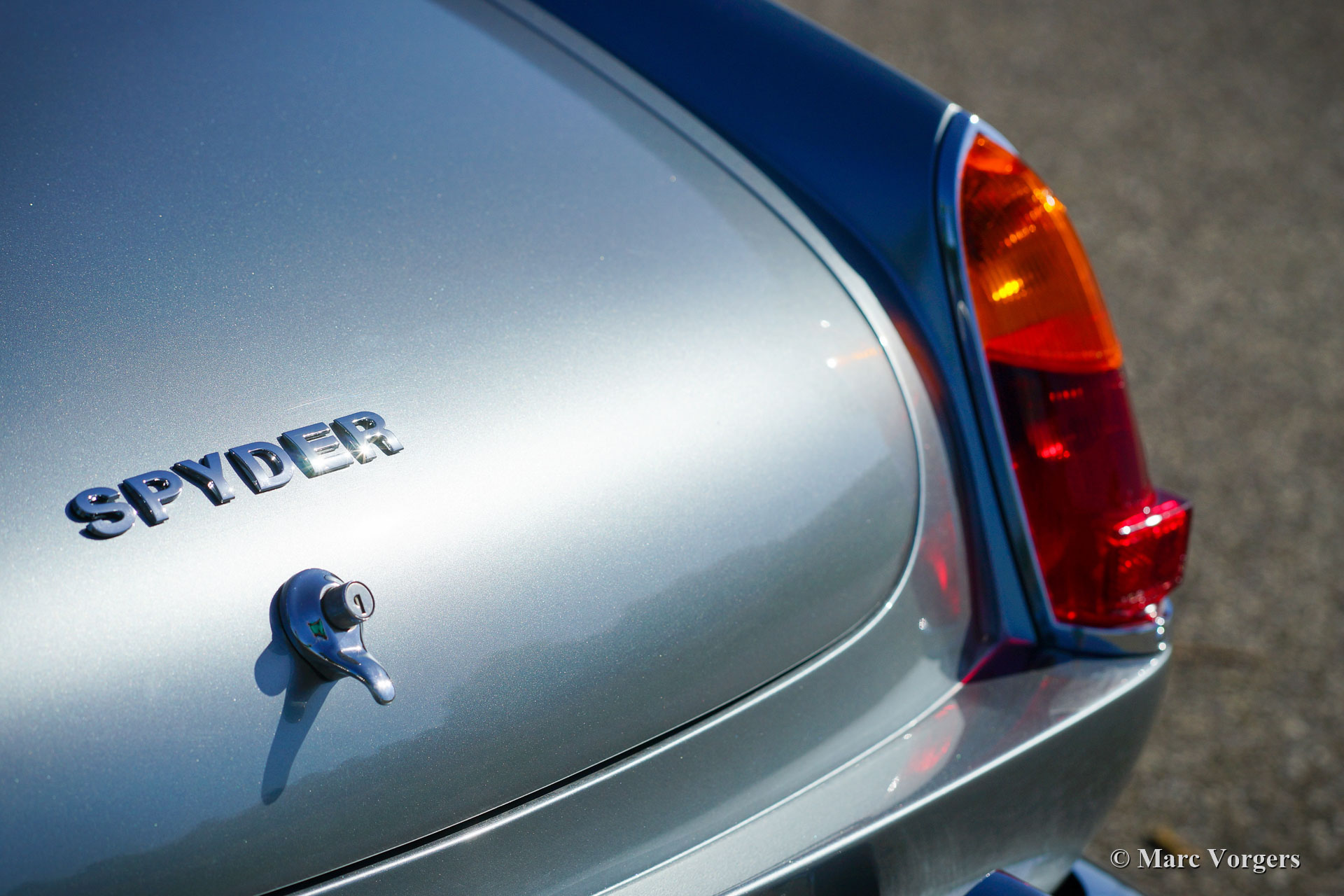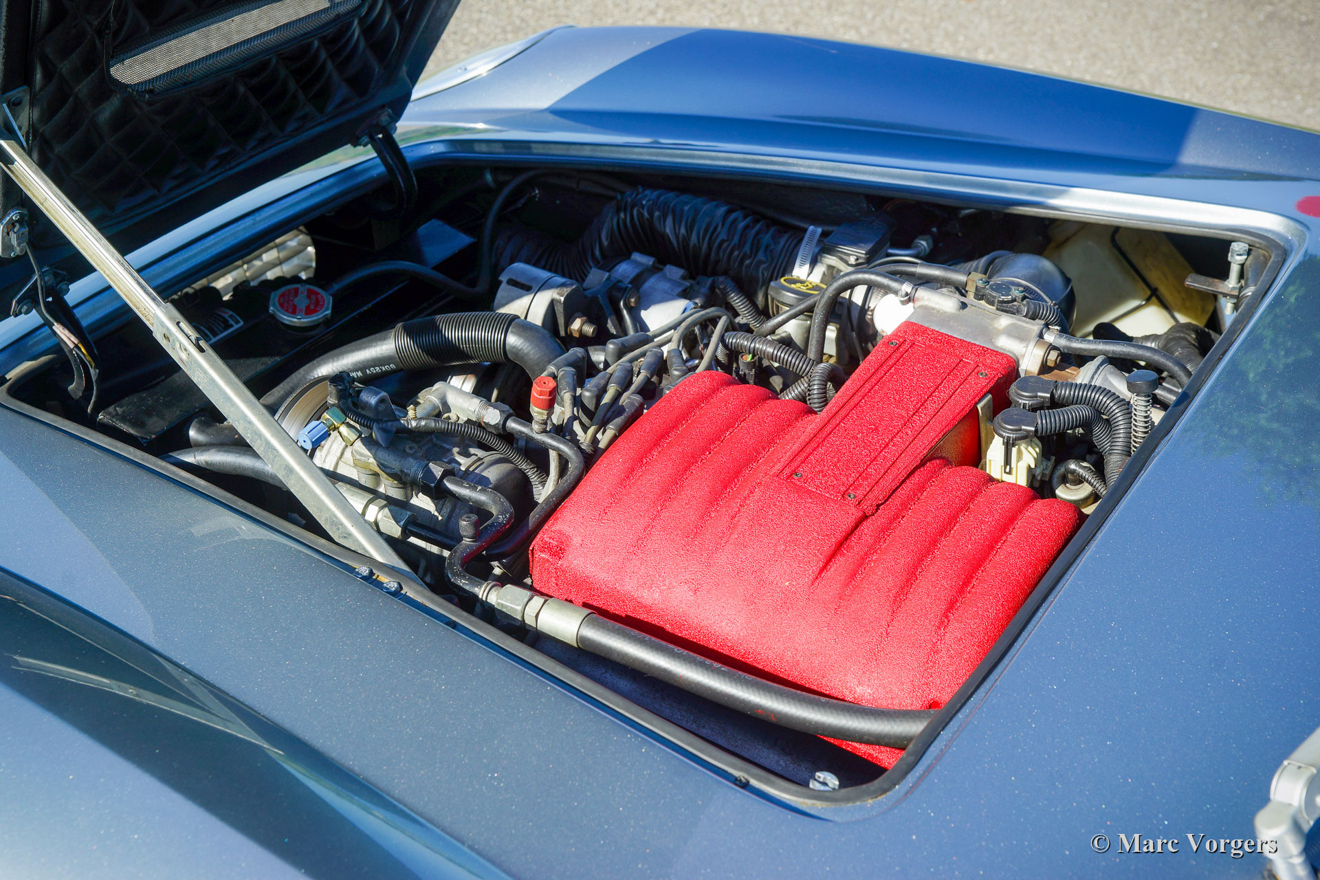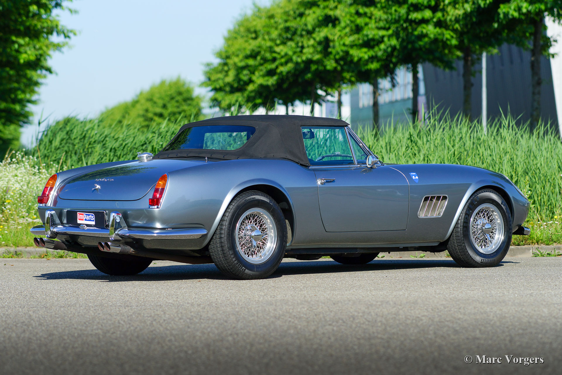 Modena Spyder California, Jahr 1970. Farbe silbermetallic kombiniert mit einer schwarzen Lederausstattung und einem schwarzen Teppich. Schwarzes Verdeck und Hauben Abdeckung. Der Modena Spyder California ist ein 1963er Ferrari 250 GT California-Nachbau mit einer GFK-Karosserie (glasfaserverstärktes Polyester), die von Modena Design and Development in El Cajon, Kalifornien, USA, hergestellt wurde. Die GFK-Karosserie wird verstärkt von ein Stahlbügel und Türinnerteile von Stahl. Der Modena Spyder ist basiert auf einem starren Rohr-Spaceframe-Chassis, das vom Indy-Autodesigner Bob Webb entworfen wurde. Das Chassis verfügt über unabhängige Vorderradaufhängung, eine Starre Hinterachse mit Schraubfedern und rundum sind Scheibenbremsen montiert. Der vorgestellte Modena Spyder ist mit einem Ford 302 cu (5 Liter) V8-Motor ausgestattet, der mit einem Viergang-Automatikgetriebe kombiniert ist. Das Chassis ist sehr robust und gut gefedert, das Auto beschleunigt, fährt und klingt sehr beeindruckend! Dieser Modena Spyder ist weiter versehen von Klimaanlage, Servolenkung, wunderschönen Chromdrahträdern, Pirelli 215 / 70-15-Reifen, Marchal 662/672 Scheinwerfern aus den 1960er und einem Nardi-Lenkrad mit Holzkranz. Der Modena Spyder California wurde weltberühmt wegen seiner wichtigen Rolle in dem 1986 veröffentlichten Film Ferris Buellers Day Off. Das Auto wurde im Jahr 2006 in die Niederlande importiert. Dieser wunderschöne Modena Spyder California hat 9000 Meilen gefahren und das Auto ist in einem Top Zustand!