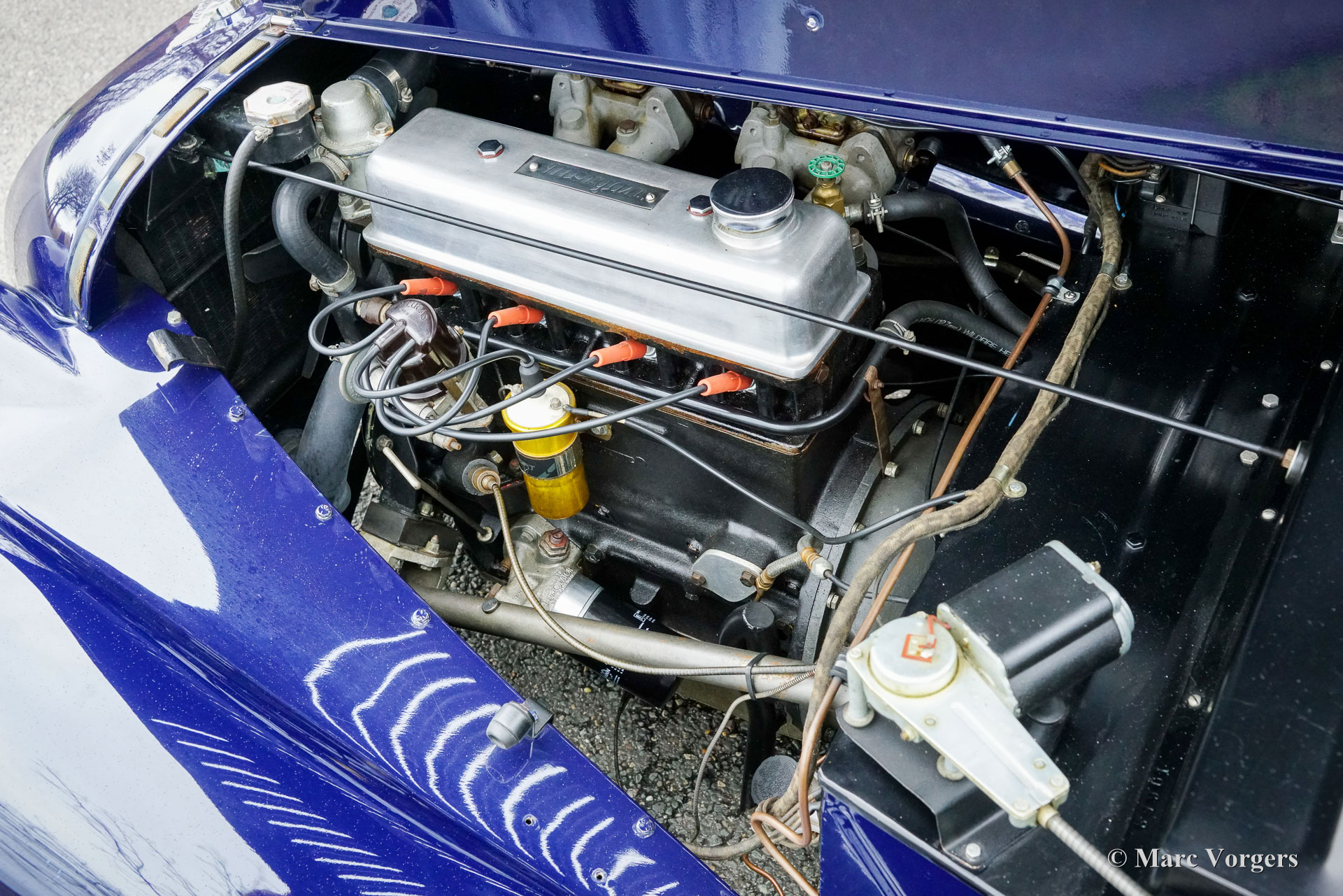 Morgan Plus 4 „bustle back“, Baujahr 1956. Fahrgestellnummer 3528, Motornummer TS10658. Werksoriginale Teile und Nummern (ein von Charles Morgan unterzeichnetes Heritage Dokument bestätigt dies). Außenfarbe: Dunkelblau (Midnightwatch Blue) mit einem burgunderroter Volllederausstattung. Dieser Morgan verfügt über eine schwarze Schlechtwetterausrüstung bestehend aus einem Verdeck, Seitenfenster mit Aluminiumrahmen und einer Persenning. Der Morgan Plus 4 „Bustle Back“ ist aufgrund seiner Übergangskarosserie mit dem steileren Heck im Stil der 1930er-Jahre das seltenste Plus-4-Modell. Von diesem Modell wurden zwischen 1956 und Oktober 1958 (ab Fahrgestellnummer 4023) nur wenige Dutzend Fahrzeuge gebaut, bevor Morgan auf das abfallende Heck und den seitlich versetzten Tankdeckel umstellte. Dieser klassische Morgan wurde neu in Minnesota, USA, verkauft. Angeblich war er ab Werk mit Rennsport-Upgrades ausgestattet. Dieser prächtige Morgan Plus 4 wurde in den USA umfassend und perfekt restauriert und modifiziert. Die Modifikationen wurden durchgeführt, um die Bremsen (Sicherheit), die Leistung, das Handling und den Fahrkomfort zu verbessern. Die Bremsen wurden auf ein Zweikreissystem mit Plus 8 Scheibenbremsen an den Vorderrädern aufgerüstet. Eine Triumph TR6 Kupplung wurde verbaut, da sie leichter zu bedienen ist und gleichzeitig die zusätzliche Leistung des getunten Motors bewältigen kann. Der Motor ist das originale Triumph TR3-Aggregat mit zwei Weber Doppelvergasern (42 DCOE). Die Vergaser mit ihren Luftfiltern sind passgenau unter einer speziellen Wölbung auf der rechten Seite der Motorhaube untergebracht. Darüber hinaus wurde die Kühlung verbessert, eine Ölwanne aus Aluminium montiert, eine elektrische Kraftstoffpumpe mit Druckregler installiert, ein Seitenauspuff angebracht und schließlich hochwertige Koni-Stoßdämpfer verbaut. Der Motor läuft und klingt perfekt, und die Kraft wird über ein knackiges Viergang-Schaltgetriebe an die Hinterräder übertragen. Mit den Koni-Stoßdämpfern und den Continental-Reifen der Dimension 195/60 R15 auf den leichten 72-Speichen-Drahtspeichenrädern fährt sich der Wagen perfekt. Das Fahrerlebnis ist intensiv und spektakulär: Das Lenkrad ist nah am Fahrer, die tiefe Sitzposition und der beeindruckende Blick über die lange Motorhaube, durch deren zwei Reihen von Kühlluftschlitzen die Hitze entweicht, sorgen für ein unvergleichliches Fahrgefühl. Der sportliche Sound aus dem seitlichen Auspuff macht die Fahrt zu einem echten Erlebnis! Das Ausloten der Grenzen von Geschwindigkeit und Haftung ist nur etwas für erfahrene Fahrer!