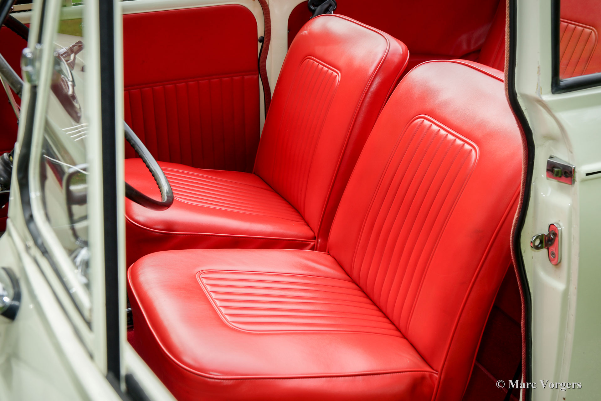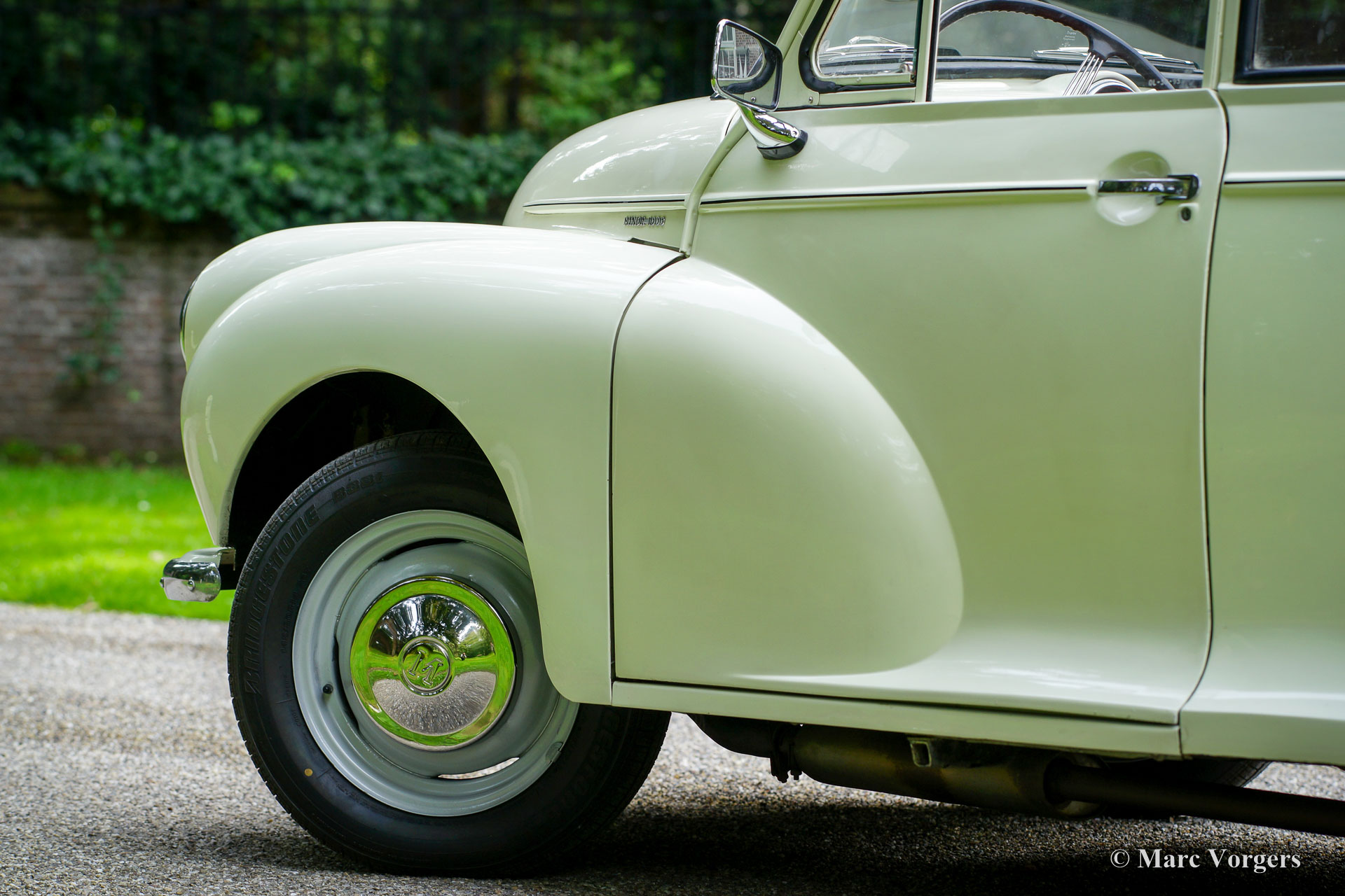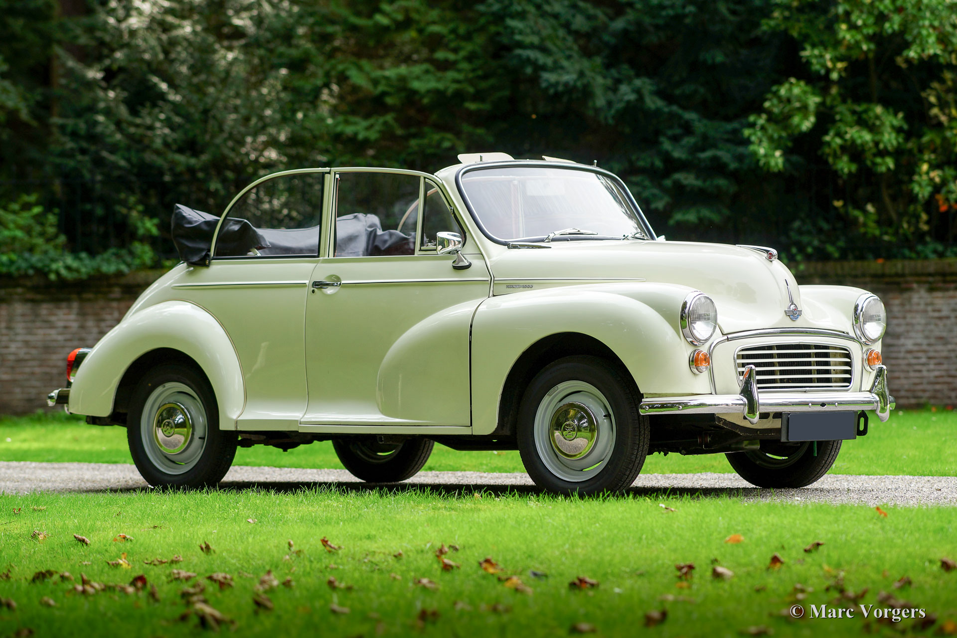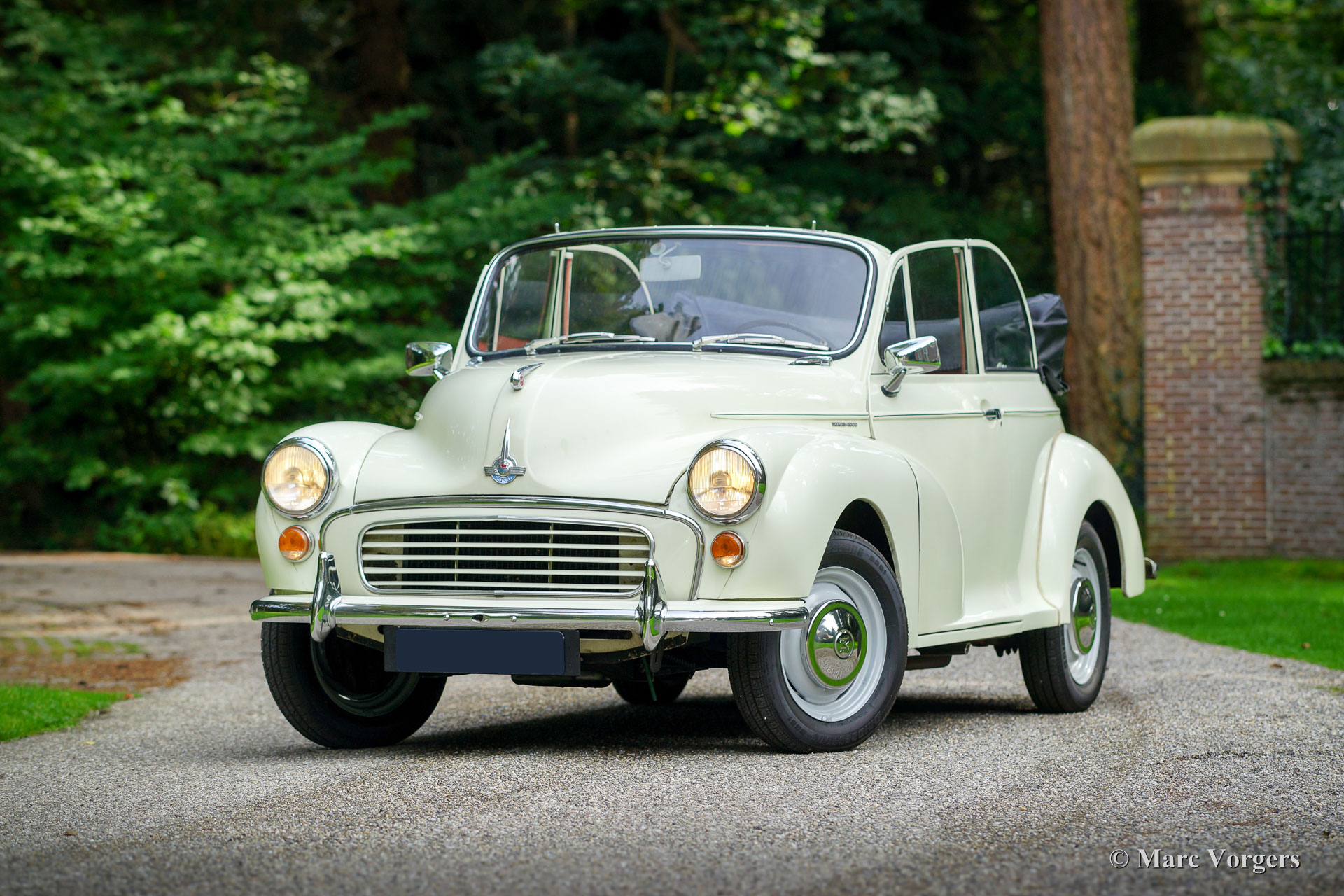 Morris Minor Tourer (Cabriolet), Jahr 1970. Farbe Old English Weiß mit einem roten Kunstleder Innenraum mit weißen Paspeln beschnitten. Schwarzer Teppich, schwarzes Vinyl-Verdeck und Kapuzenabdeckung. Dieses wunderbare Morris-Minor Cabriolet wurde in der Vergangenheit weitgehend restauriert. Während des Wiederaufbaus wurde die Polsterung erneuert und der Motor und das Getriebe wurden überholt. Das Auto ist in einem sehr guten und sehr schönen Zustand! Der Motor ist mit einer größeren S.U. Vergaser des Typs HS4 ausgestattet, 123 elektronische Zündung und eine Wechselstrom Lichtmaschine. Darüber hinaus verfügt das Auto über Scheibenbremsen an den Vorderrädern und einen Edelstahl-Auspuff. Weitere Extras: Sicherheitsgurte und eine Anhängerkupplung. Dieser Morris Minor wurde vor kurzem gewartet. Die Bedienungsanleitung ist vorhanden. Dies ist ein wundervolles britisches Cabriolet, das viel offenen Fahrspaß für vier Personen bietet.