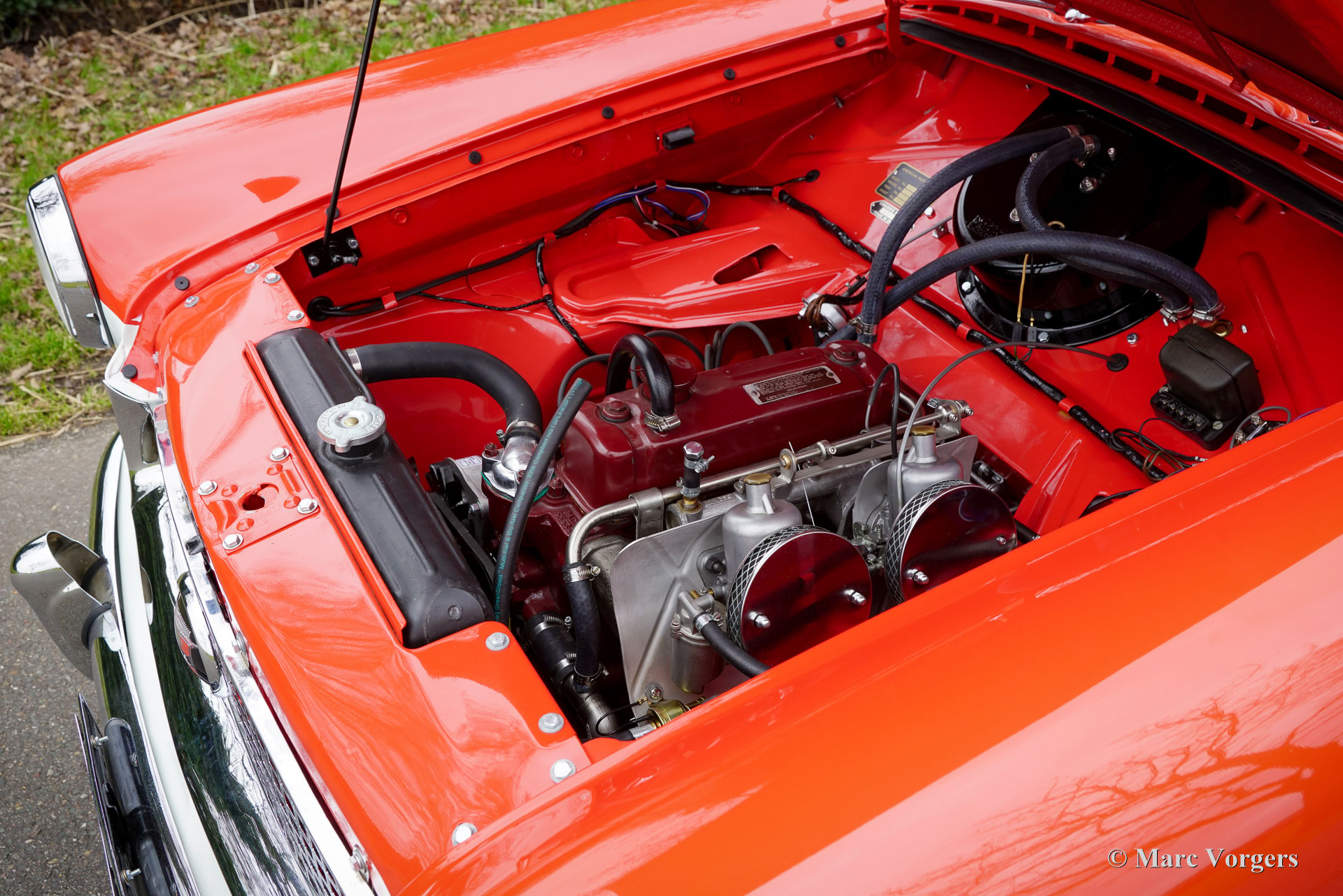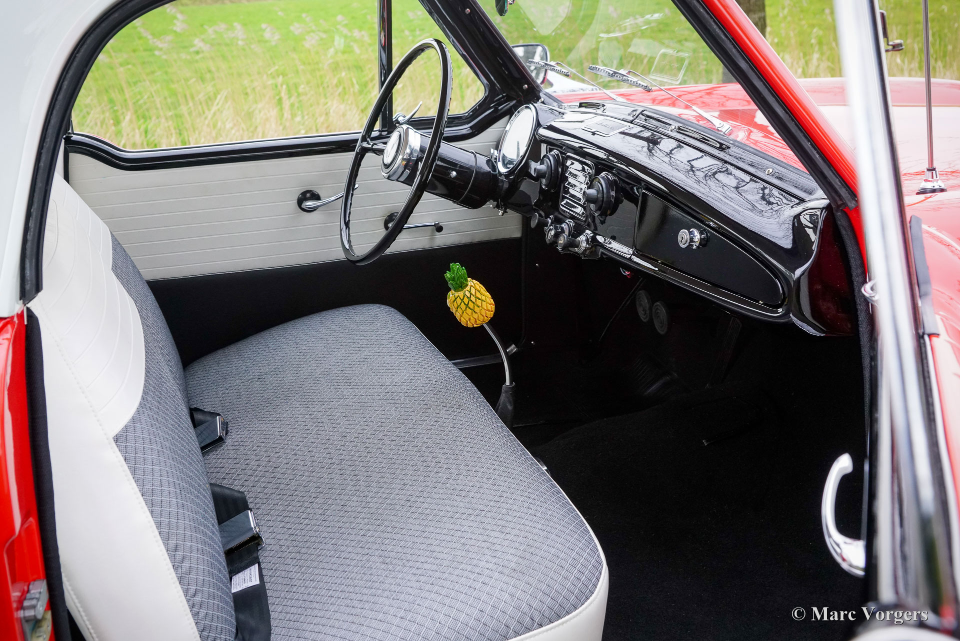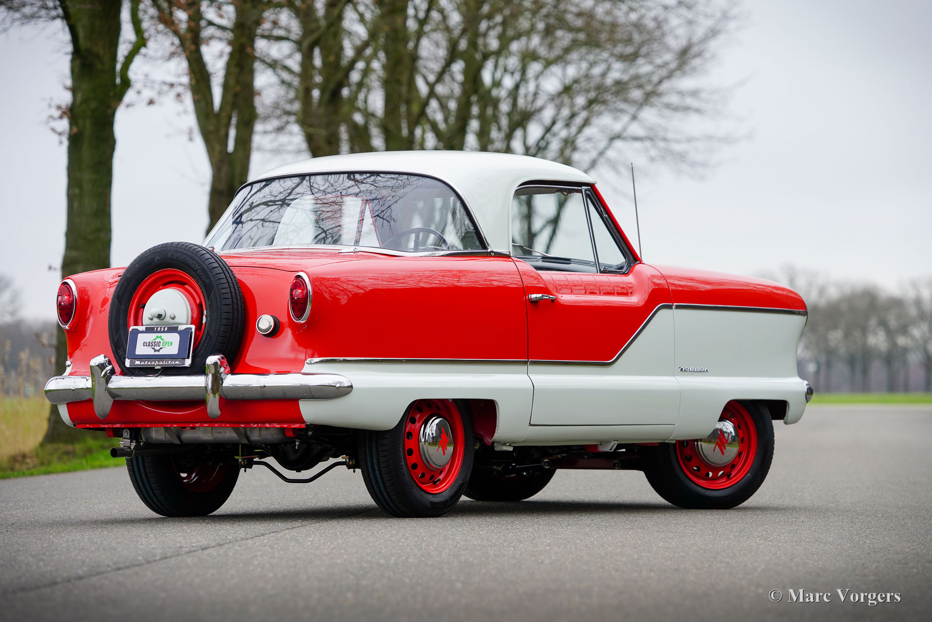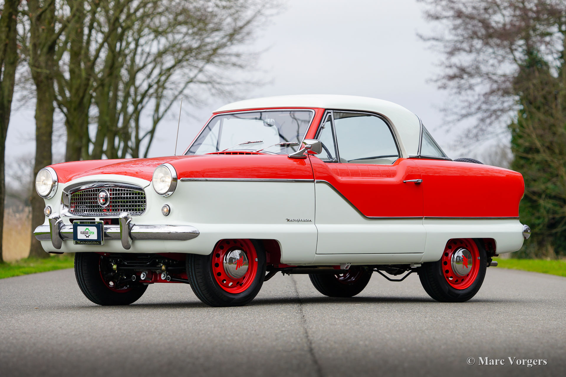 Nash Metropolitan, Jahr 1959. Farbe Rot über Cremeweiß, kombiniert mit einer grau/weißen Stoff-/Vinyl-Innenausstattung mit schwarzem Teppich. Der Nash Metropolitan ist ein amerikanisches Automobil, das in England montiert und von 1953 bis 1961 vermarktet wurde. Es wurden etwa 60.000 Autos produziert. Der Nash Metropolitan ist mit dem bekannten 1500-cm³-A-Serie-Motor des MG MGA ausgestattet. Dieses wunderschöne Exemplar wurde umfassend restauriert, das Auto ist in einem TOP-Zustand und das Auto fährt perfekt. Im Streben nach Perfektion wurden Kosten und Mühen nicht gescheut. Das Auto wurde in mehreren Punkten modifiziert und verbessert; An den Vorderrädern wurden Scheibenbremsen angebracht, außerdem wurden ein 5-Gang-Ford-Getriebe, eine elektronische Zündung und eine Wechselstrom Lichtmaschine eingebaut. Der Nash Metropolitan zeigt viel Charakter und die vielen wunderbaren Details fallen beim Betrachten des Autos immer wieder auf. Der Nash Metropolitan ist ein angloamerikanisches Auto, das sowohl in britischen als auch in amerikanischen Autosammlungen einen Ehrenplatz genießt. Diese Auto is ein Spitzenbeispiel!