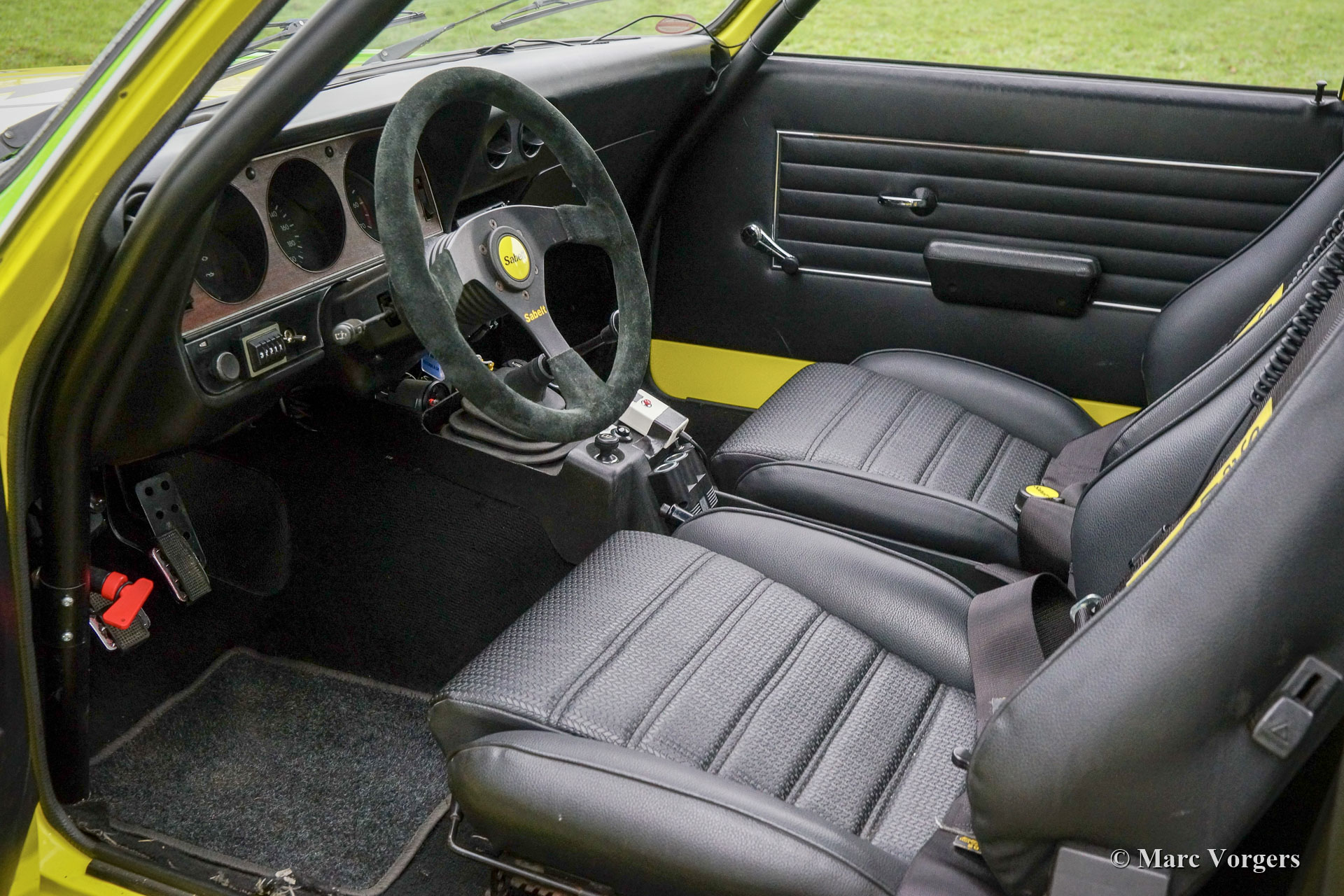 Opel Ascona A Rally Auto, Jahr 1975. Farbschema des Euro Opel Händler Teams, zitronengelb mit hellgrün. Rallye-Innenausstattung aus schwarzem Kunstleder. Dieses prächtige Opel Ascona Rally Auto ist eine Nachbildung des offiziellen Opel-Händler-Teamwagens aus den 1970er Jahren. Das Auto wurde wunderschön und professionell restauriert und umgebaut. Das Auto wurde komplett zerlegt und bis ins kleinste Detail auf Rallyes vorbereitet. Das Auto verfügt über einen leistungsstarken 2,2-Liter-Motor, ein 5-Gang-Handschaltgetriebe, zwei Weber-Doppel-Vergaser, einen Überrollkäfig, Leichtmetallfelgen, 4 große Bosch-Scheinwerfer, ein Sabelt Rally-Lenkrad, Sabelt 4-Punkt-Sicherheitsgurte, Kommunikation Ausrüstung und ein Brantz International 2 'S' Pro Rallymeter. Dieses fantastische Opel Ascona Rally Auto ist in einem ausgezeichneten Zustand und das Auto fährt sich beeindruckend. Dies ist ein großartiges Rallye-Auto, um an historischen (Touren-)Rallye-Events teilzunehmen! Dieses Rallye-Auto stammt von einem begeisterten Enthusiasten und ist bereit, in vollen Zügen genossen zu werden.