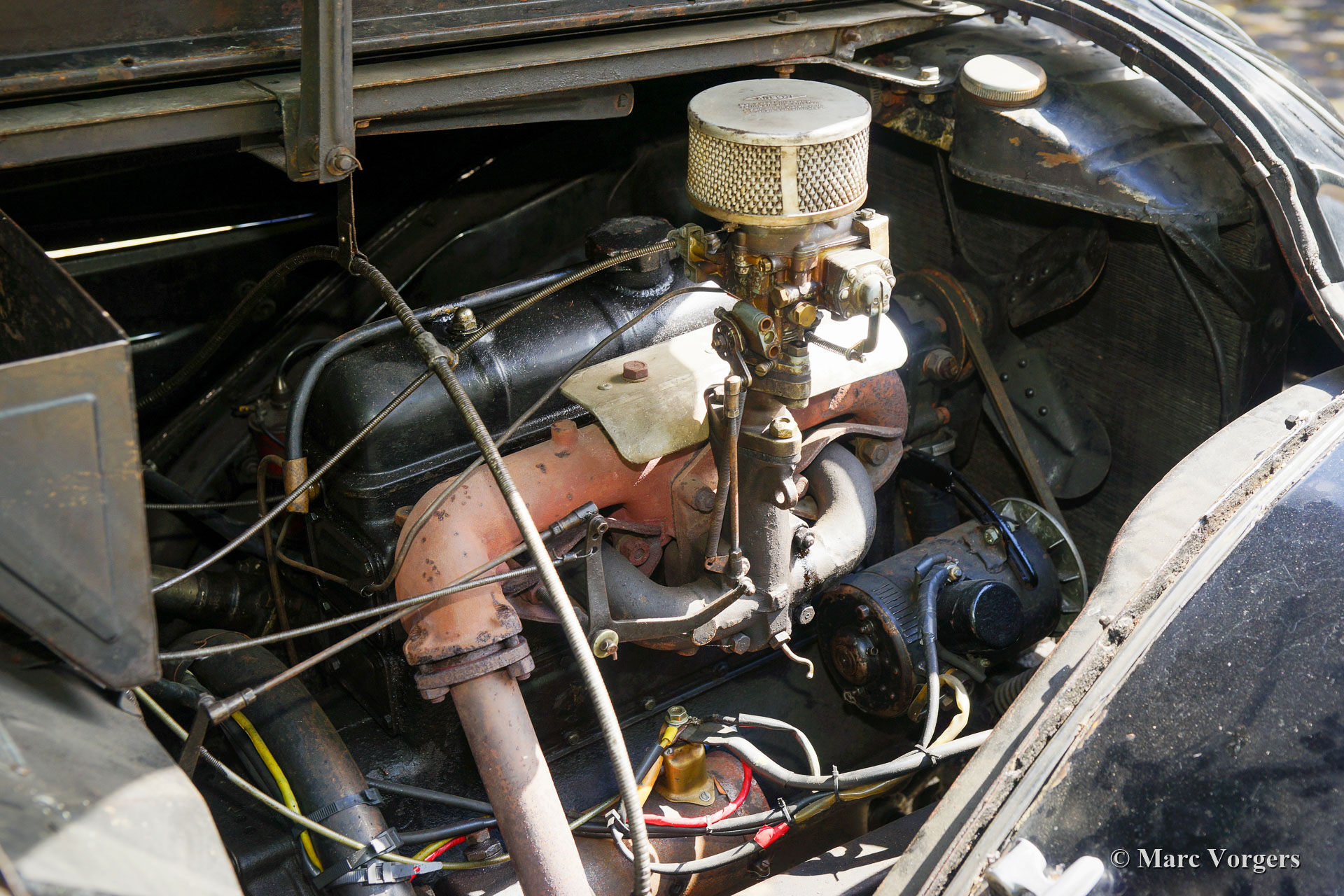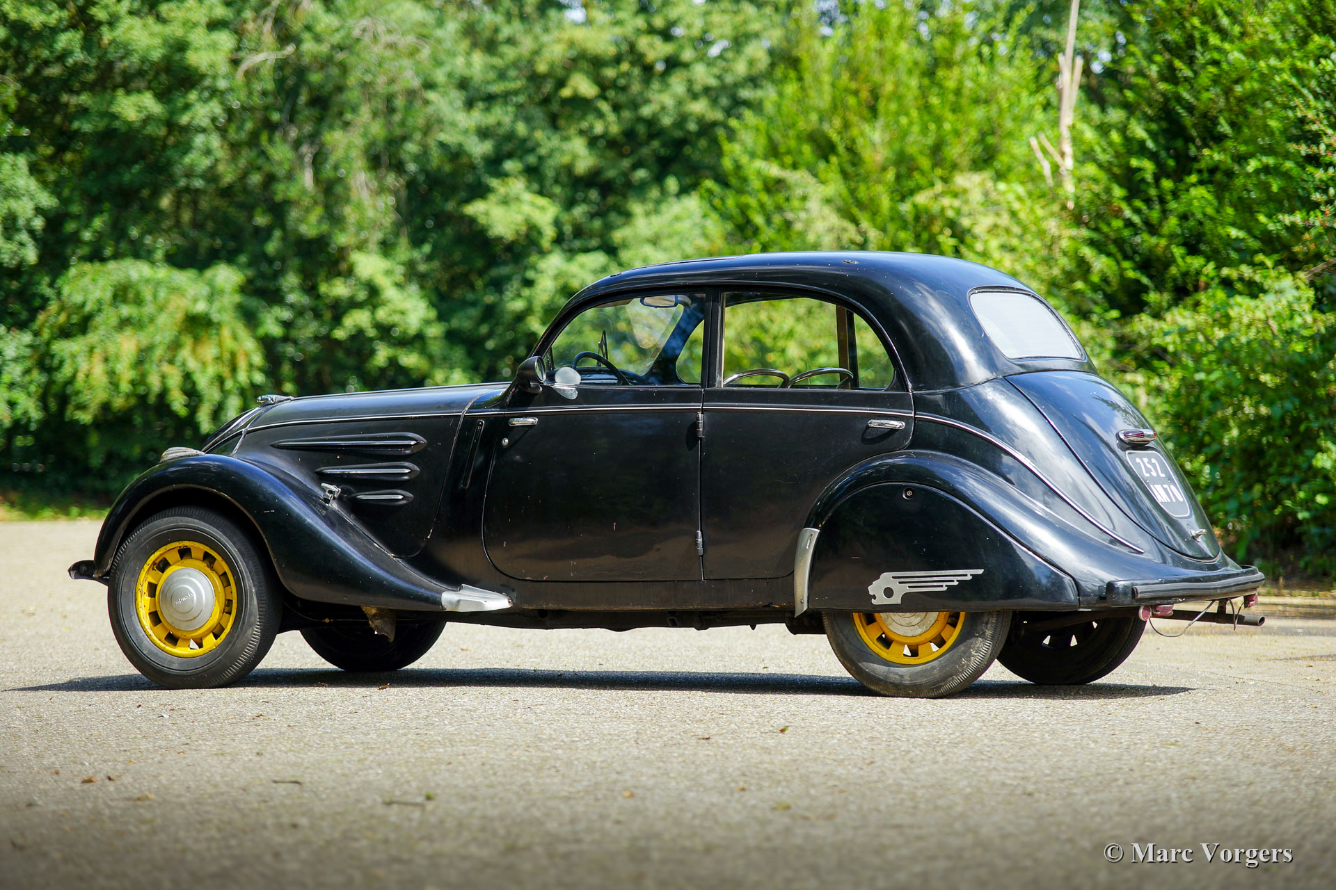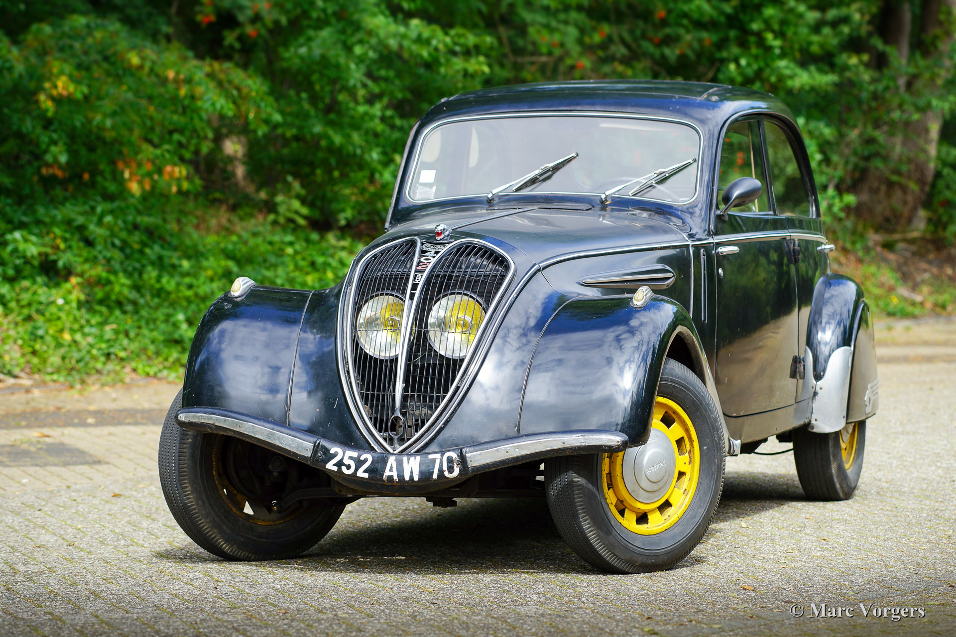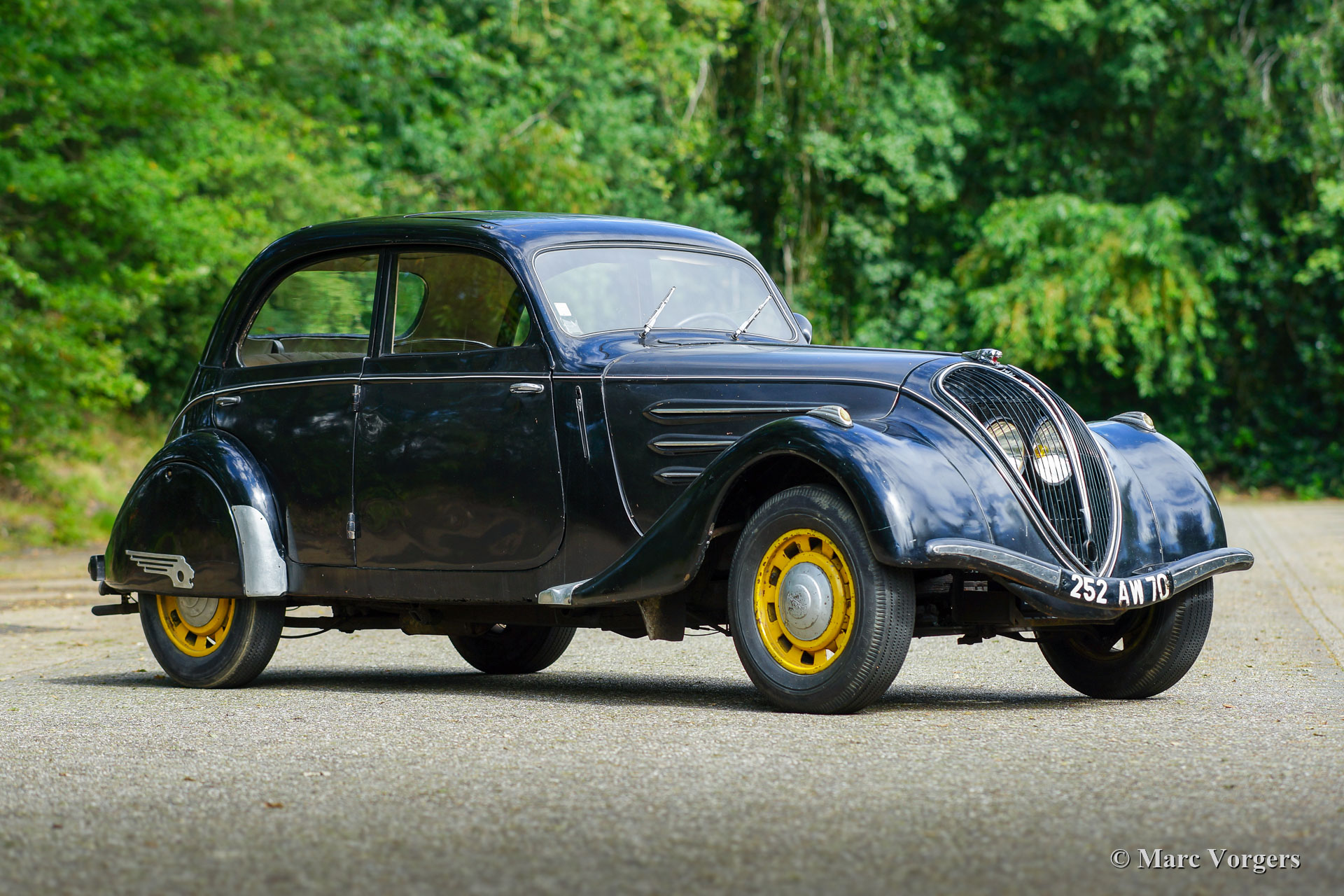 Peugeot 402 B Legere, Jahr 1938. Farbe schwarz mit gelben Rädern kombiniert mit einem beigen Stoff Interieur. Hier haben wir einen wunderbaren und seltenen Peugeot 402 B Legere in einem super originalen "Scheunenfund" -Zustand! Das Auto stammt vom zweiten Besitzer (einem französischen Garagenbesitzer), der das Auto viele Jahre trocken gelagert hatte. Dieser wunderschöne Peugeot verfügt über ein fantastisches, stromlinienförmiges Design und es zeigt alle Originaldetails. Die Lackierung ist weitgehend original, der Innenraum ist komplett original und die Mechanik ist komplett original. Wir haben das Auto wieder zum Leben erweckt, das Auto fährt sich sehr gut! Ein neuer Besitzer kann beschließen, die ursprüngliche Patina beizubehalten und das Auto so zu genießen, wie es ist. Der Peugeot verfügt über ein großes Schiebedach und ein Handschaltgetriebe. Das Auto wird auf vier neuen Reifen geliefert. Das Auto kommt mit allen Papieren, um das Auto in jedes Land weltweit zu importieren. Ein prächtiger und seltener Peugeot 402 B Legere in fahrendem ‚Scheunenfund‘-Zustand!