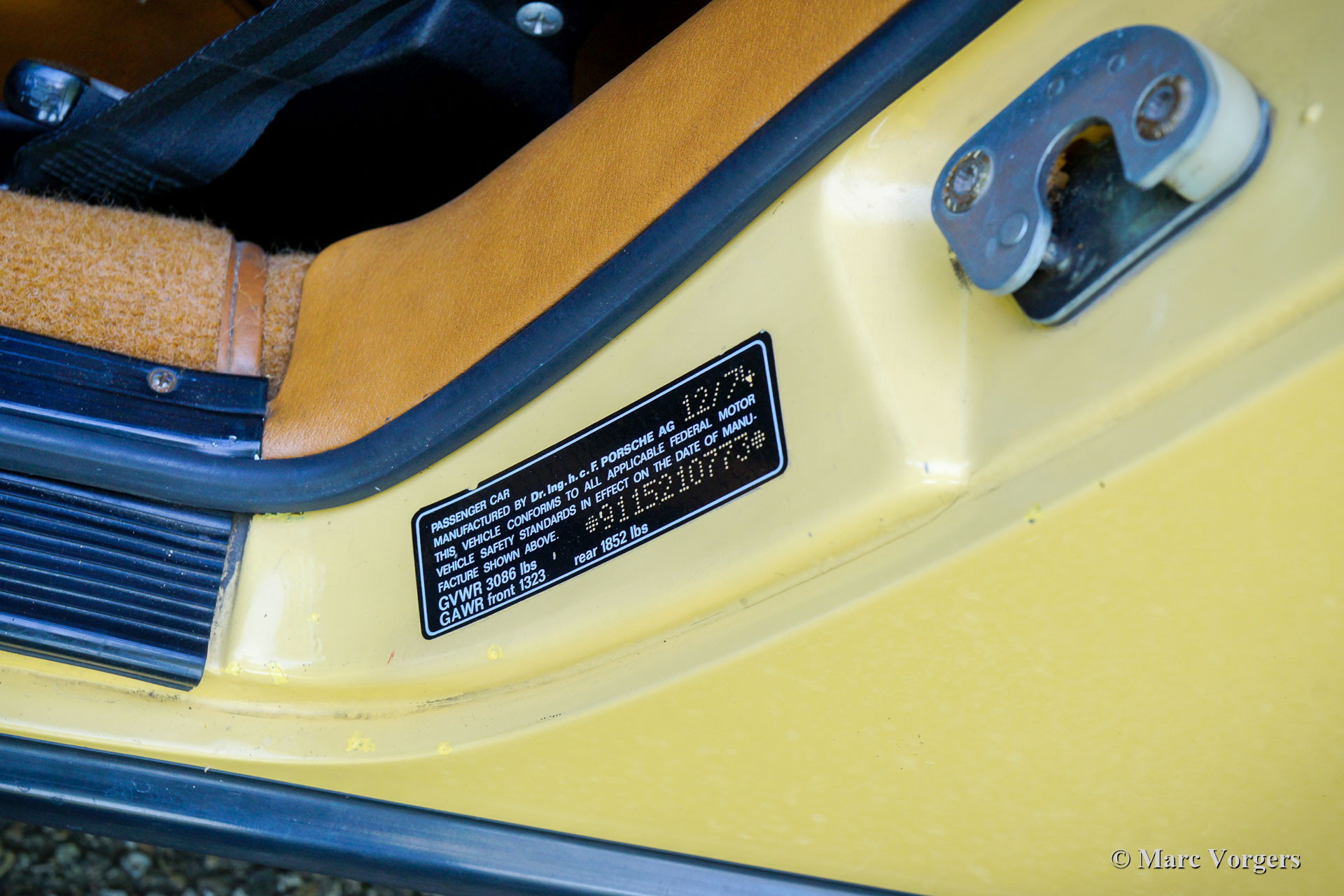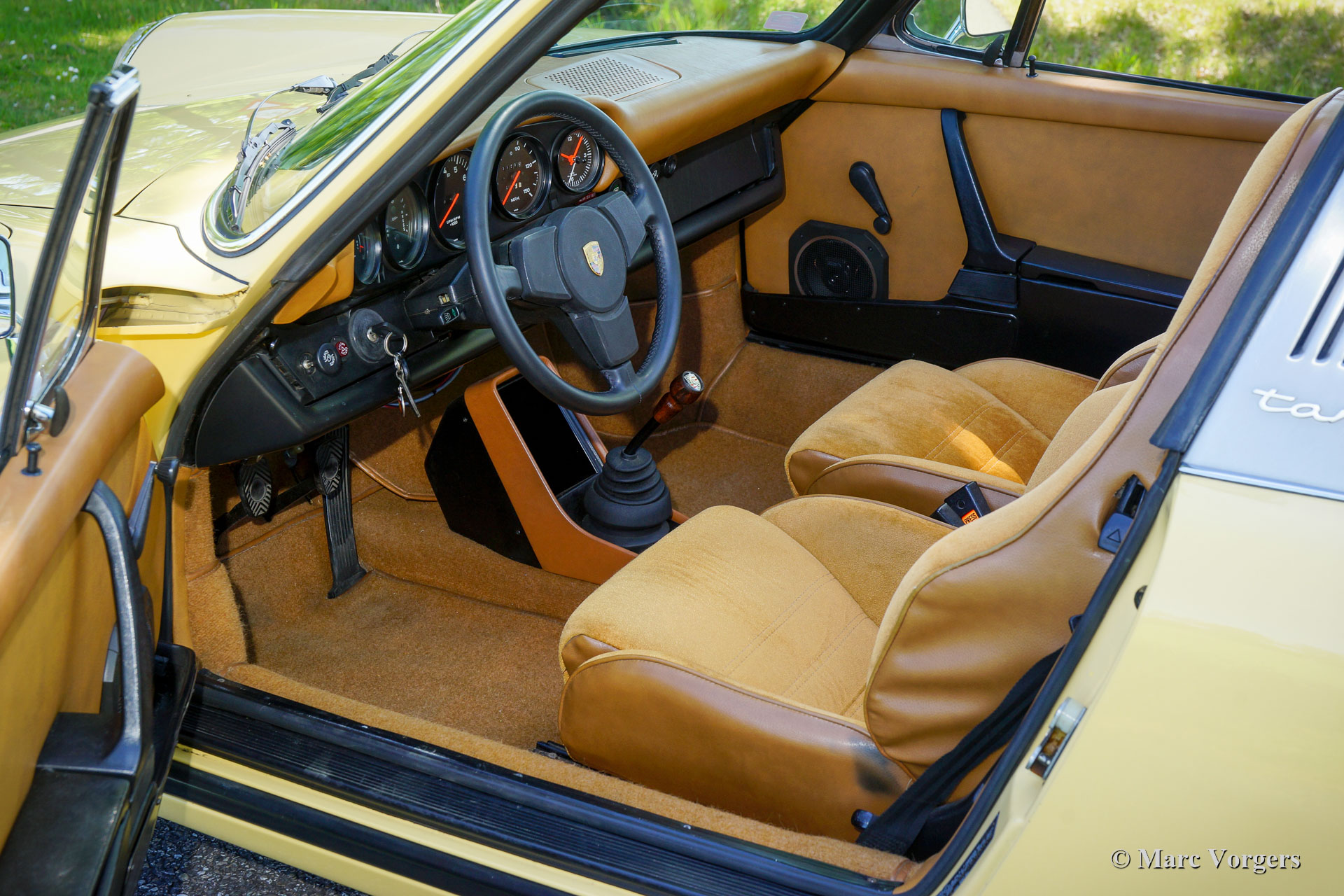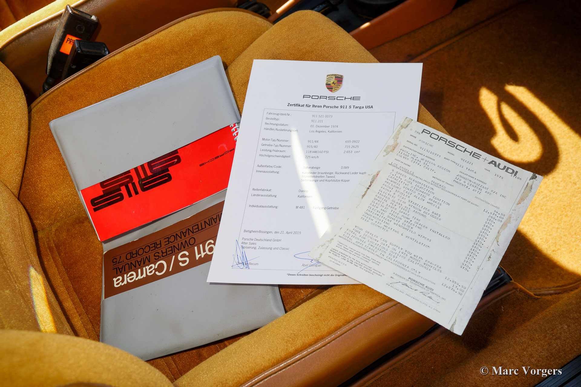 Porsche 911 2.7S Targa, Jahr 1974. Matching Numbers. Farbe Saharabeige (Farbcode D3V9) kombiniert mit hellbrauner Stoff-/Velours-Innenausstattung. Diese frühe Porsche 911 2.7S Targa der G-Serie wurde in den USA neu verkauft. Derzeit ist das Auto in Deutschland zugelassen. Dieser prächtige Porsche 911 ist in einem superoriginellen und hervorragenden Zustand! Das Auto wurde nie restauriert und die Karosserie zeigt weitgehend ihren ursprünglichen Lack. In Deutschland wurde das Auto nach europäischen Spezifikationen angepasst mit EU-Scheinwerfern und kleinere Gummistoßpuffern im EU-Stil hinten. Alle anderen Details sind werkseitig original. Die originale Werks-Aufkleber sind noch vorhanden, die Unterseite und die Radkästen sind noch ganz schön in Wagenfarbe. Das Auto hatte nie einen Unfall, die Karosserie zeigt perfekte und klare Karosserielinien und die Passform der Paneele ist makellos. Kürzlich wurde der Motor von einem deutschen Porsche-Spezialisten überholt und alles wurde auf den neuesten Stand gebracht. Alle Rechnungen sind vorhanden. Dieser wunderschöne Porsche 911 2.7S Targa fährt und handhabt sich perfekt und der Motor läuft und klingt fantastisch! Dieser Porsche 911 2.7S Targa ist ausgestattet mit grün getönten Scheiben, originalen Nebelscheinwerfern unter der vorderen Stoßstange, einem späteren Porsche-Soundsystem mit CD-Player, korrekten 15-Zoll-Fuchs-Rädern und Michelin-Reifen 205 / 60-15. Das Auto wird komplett mit allen Originalbüchern, Originalrechnung (!) und Geburtsurkunde geliefert. Ebenfalls vorhanden ist das Original-Werkzeugset in seiner Original-Vinyltasche. Dies ist eine sehr begehrenswerte frühe Porsche 911 2.7 S G-Serie in einem ausgezeichneten und super originalen Zustand!