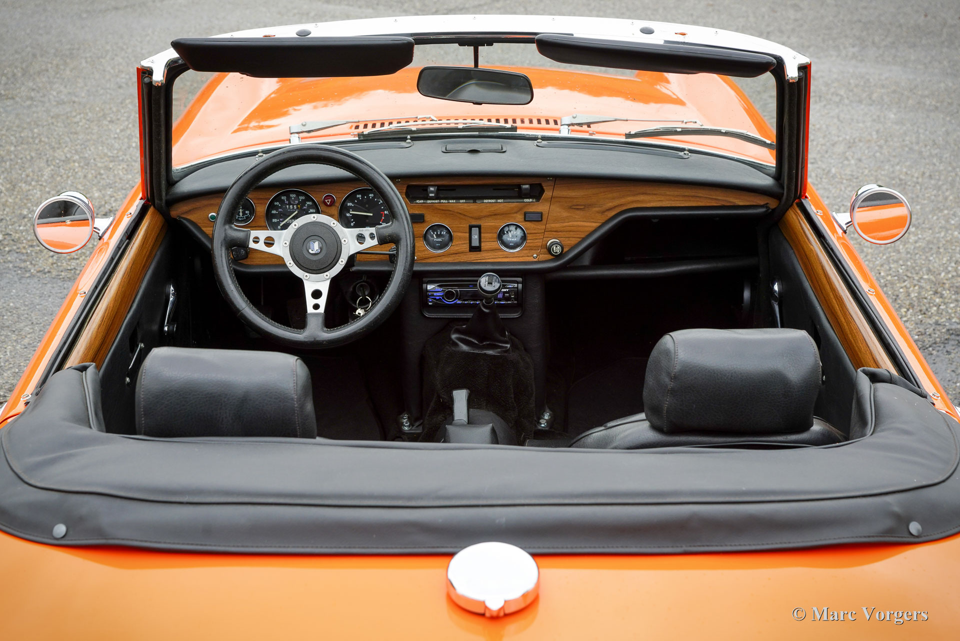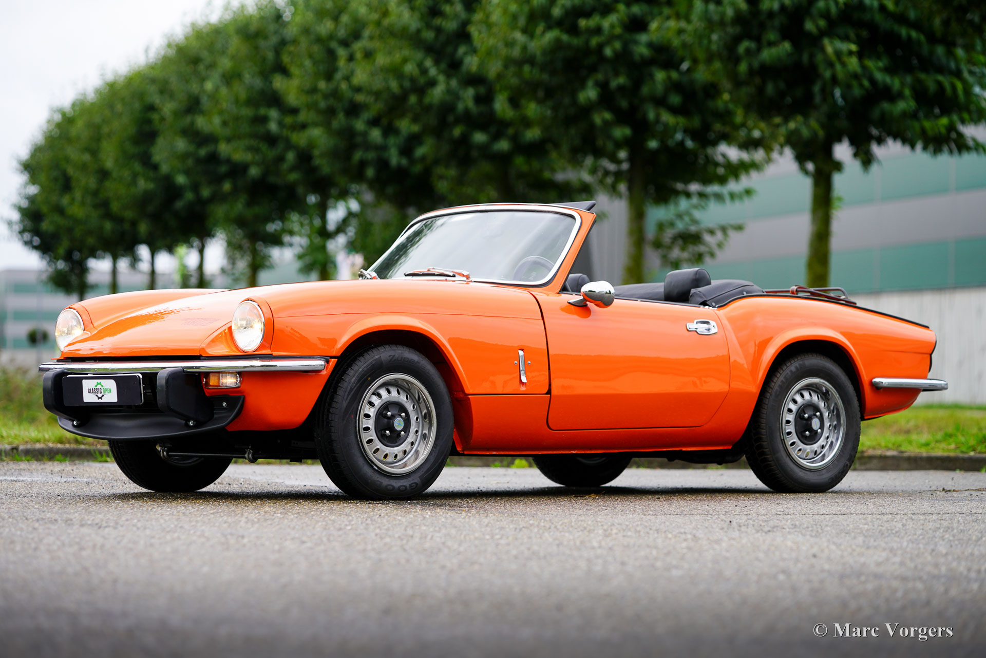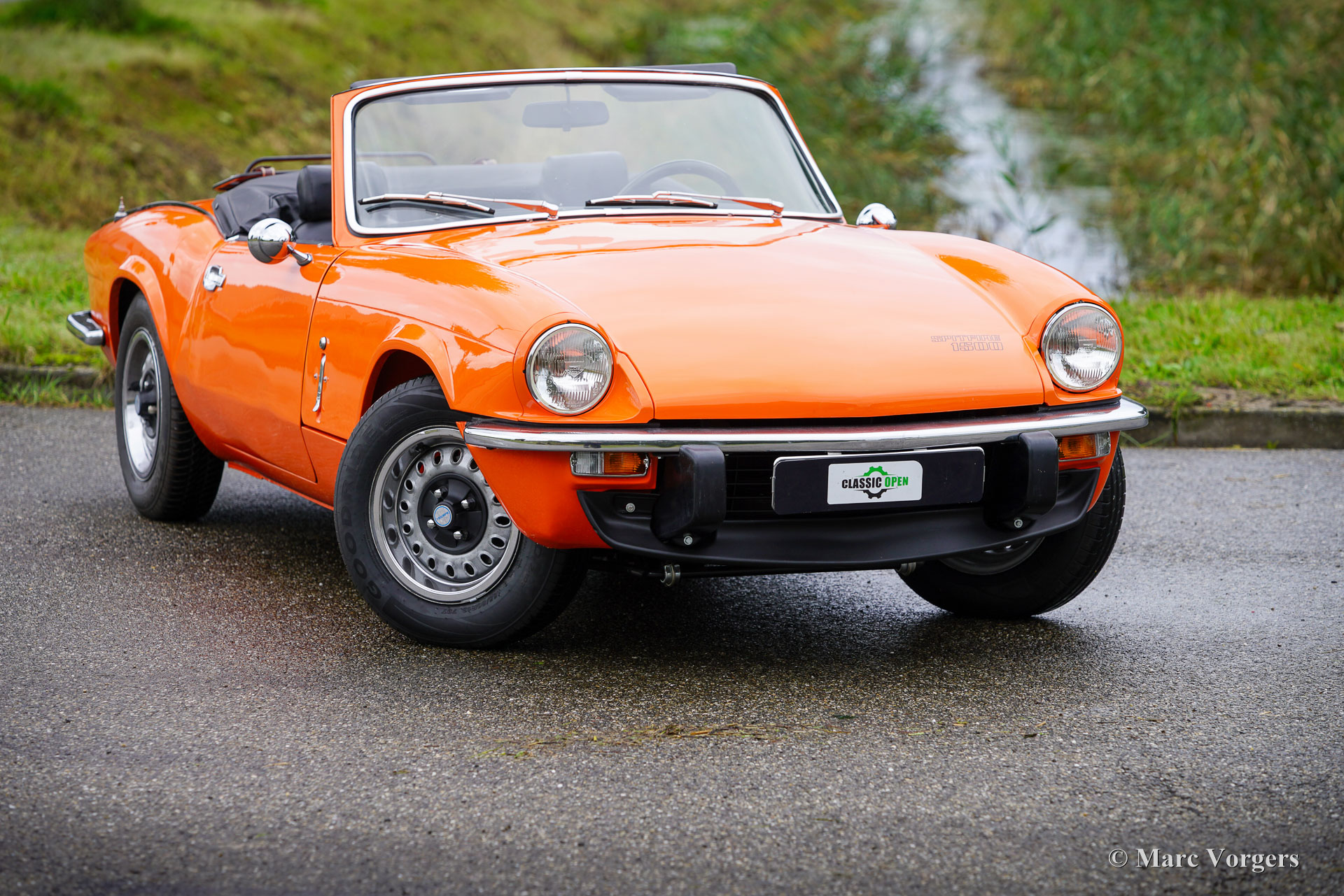 Triumph Spitfire 1500 TC, Jahr 1978. Farbe Orange kombiniert mit einer schwarzen Lederausstattung und schwarzem Teppich. Verdeck- und Verdeck Abdeckung aus schwarzem Vinyl. Diese fantastische Triumph Spitfire wurde vor Kurzem im Originalzustand restauriert. Es wurden möglichst viele Originalteile aufgearbeitet und wieder eingebaut. Die Karosserie erhielt innen und außen eine leuchtend orange Lackierung. Dieser Spitfire 1500 TC weist alle wunderbaren Originaldetails auf und das Auto ist in einem ausgezeichneten Zustand! Die Triumph Spitfire ist ein Meisterwerk des berühmten italienischen Designers Michelotti. Der Triumph Spitfire verfügt über den gleichen wunderbaren Motorhauben Stil wie der Jaguar E-Type, der nach vorne hochklappt und den kompletten Motorraum und die Vorderradaufhängung freigibt. Der Triumph Spitfire ist ein wunderbarer kompakter Sportwagen für den britischen Autoliebhaber, der ein sportliches Fahrverhalten und ein großartiges Fahrerlebnis mit offenem Verdeck bietet. Dieses wunderbare Auto verfügt über den zuverlässigen 1500-cm³-Vierzylindermotor, gepaart mit einem Vierganggetriebe mit Overdrive. Das Auto ist mit einem MotoLita-Sportlenkrad mit Lederkranz und einem schwarzen Gepäckträger ausgestattet. Dieser wundervolle Spitfire im leuchtenden Orange der 1970er Jahre ist bereit, in vollen Zügen genossen zu werden!