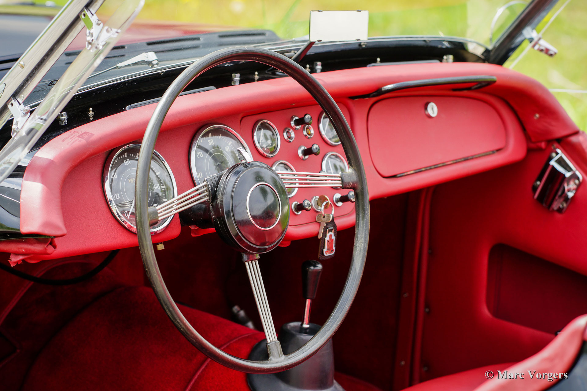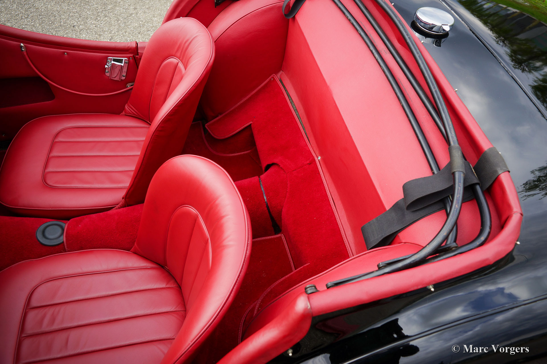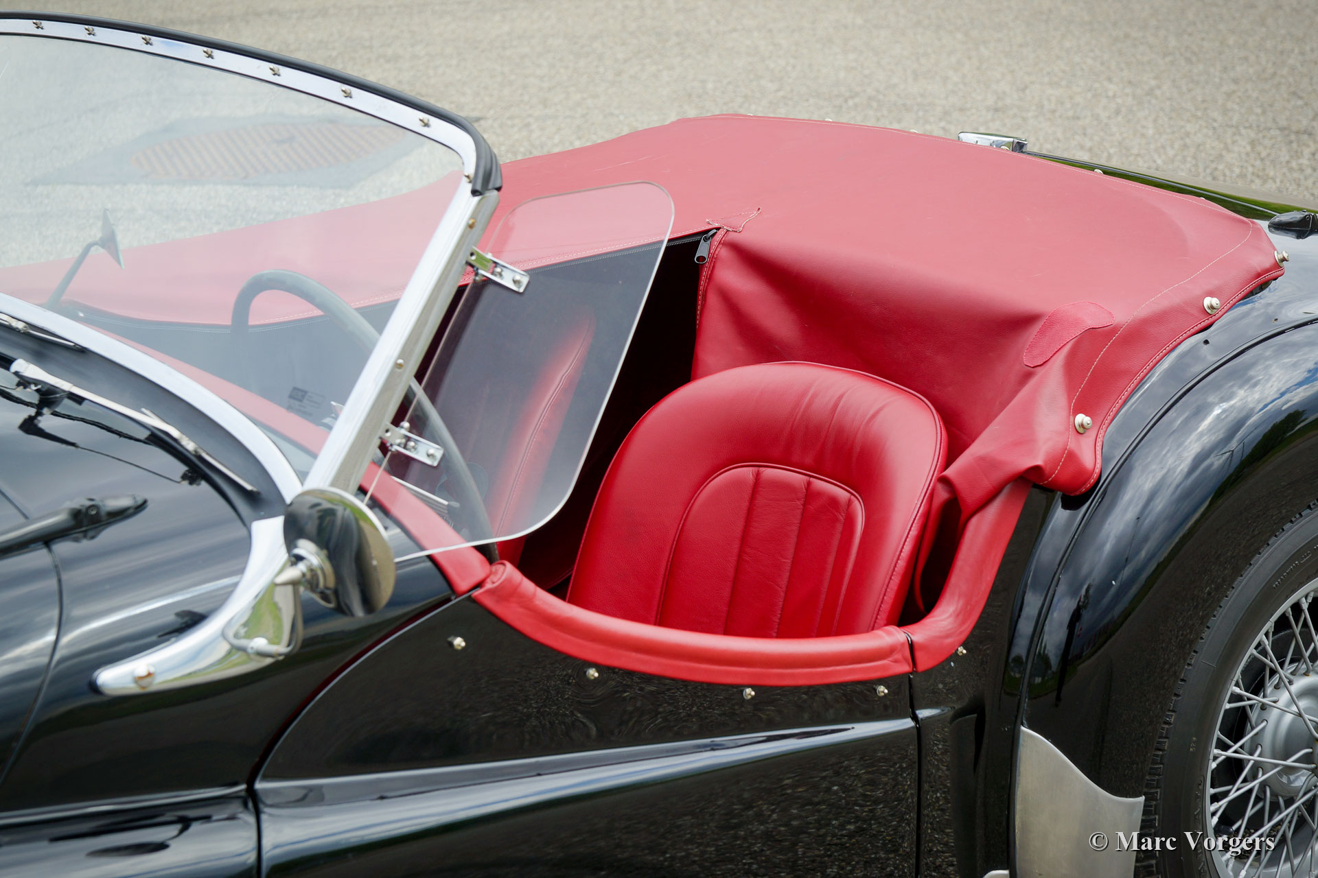 Triumph TR 2 „long door“, Jahr 1954. Farbe schwarz mit roter Lederausstattung und schwarzem Teppich. Rotes Verdeck und Seitenfenster-Rahmen, rote Persenning. Dieser seltene Triumph TR 2 „Long Door“ wurde vor etwa einem Jahrzehnt umfangreich „body off“ restauriert. 2016 haben wir diesen TR 2 an den jetzigen Besitzer verkauft. Der TR wurde an sonnigen Tagen nur spärlich gefahren, das Auto ist immer noch in einem hervorragenden Zustand! Dieses frühe TR 2 Modell zeigt alle Details der ersten Modellreihe. Äußerlich fallen Ihnen die langen Türen auf, die die Schweller abdecken, und die kleinen Lucas-Rücklichter. Unter der Oberfläche finden Sie die Kabelbetätigte Motorhaubenentriegelung mit zwei Rasten und das spezielle Thermostatgehäuse am Motor. Auch das Zylinderkopfdesign unterscheidet sich von den späteren Vierzylinder-TR’s. Bei diesem Wagen wurden die originalen Trommelbremsen an den Vorderrädern durch wirksamere Scheibenbremsen aus einem TR 3a ersetzt. Dem „long door“ Designmerkmal folgte schnell das Design mit kurze Türe, weil viele unglückliche Besitzer beim Versuch, aus dem Auto auszusteigen, die Türen gegen die Bordsteine der Straße schlugen … Dieser wunderbare Triumph TR 2 ist mit silbern lackierten Speichenrädern und Lucas P700 Scheinwerfer ausgestattet. Die Original-Trommelbremsen sind immer noch anwesend und werden mitgeliefert um, wenn gewünscht, das Auto wieder auf die werkseitigen Original-Spezifikationen zurückzubringen. Dieser wunderschön restaurierte TR 2 „Long Door“ ist ein seltener und schöner Fund für den Triumph TR Enthusiasten / Sammler!