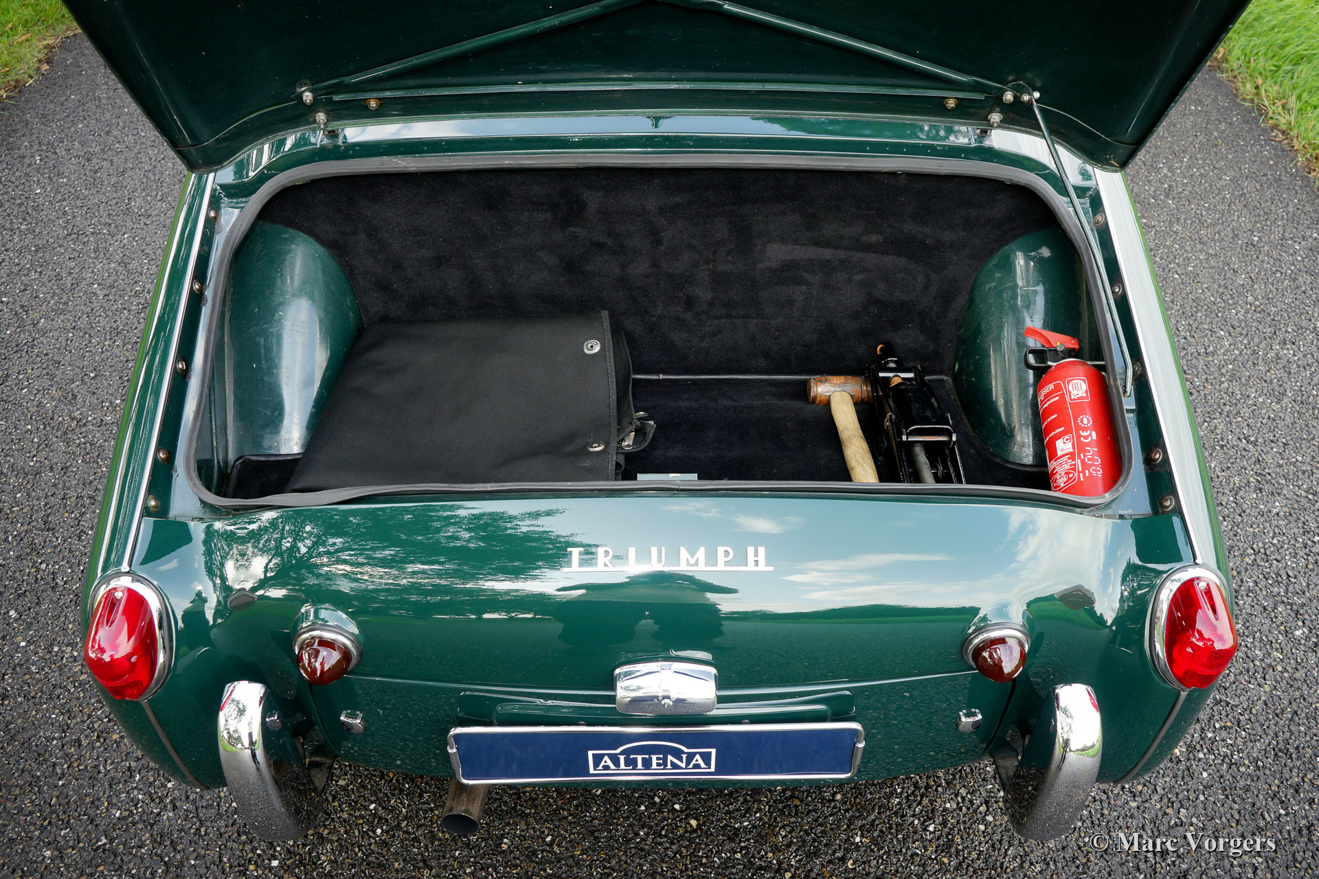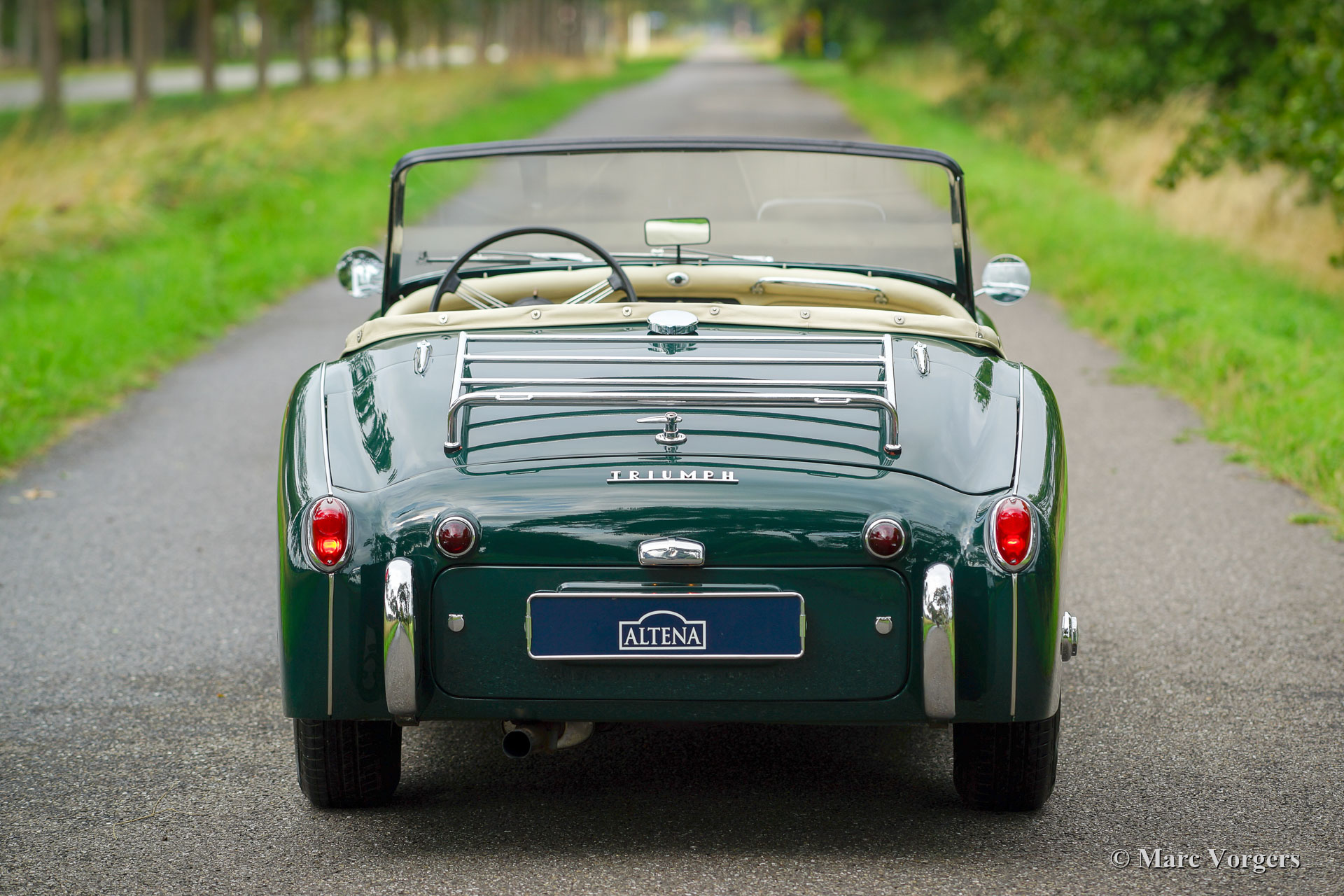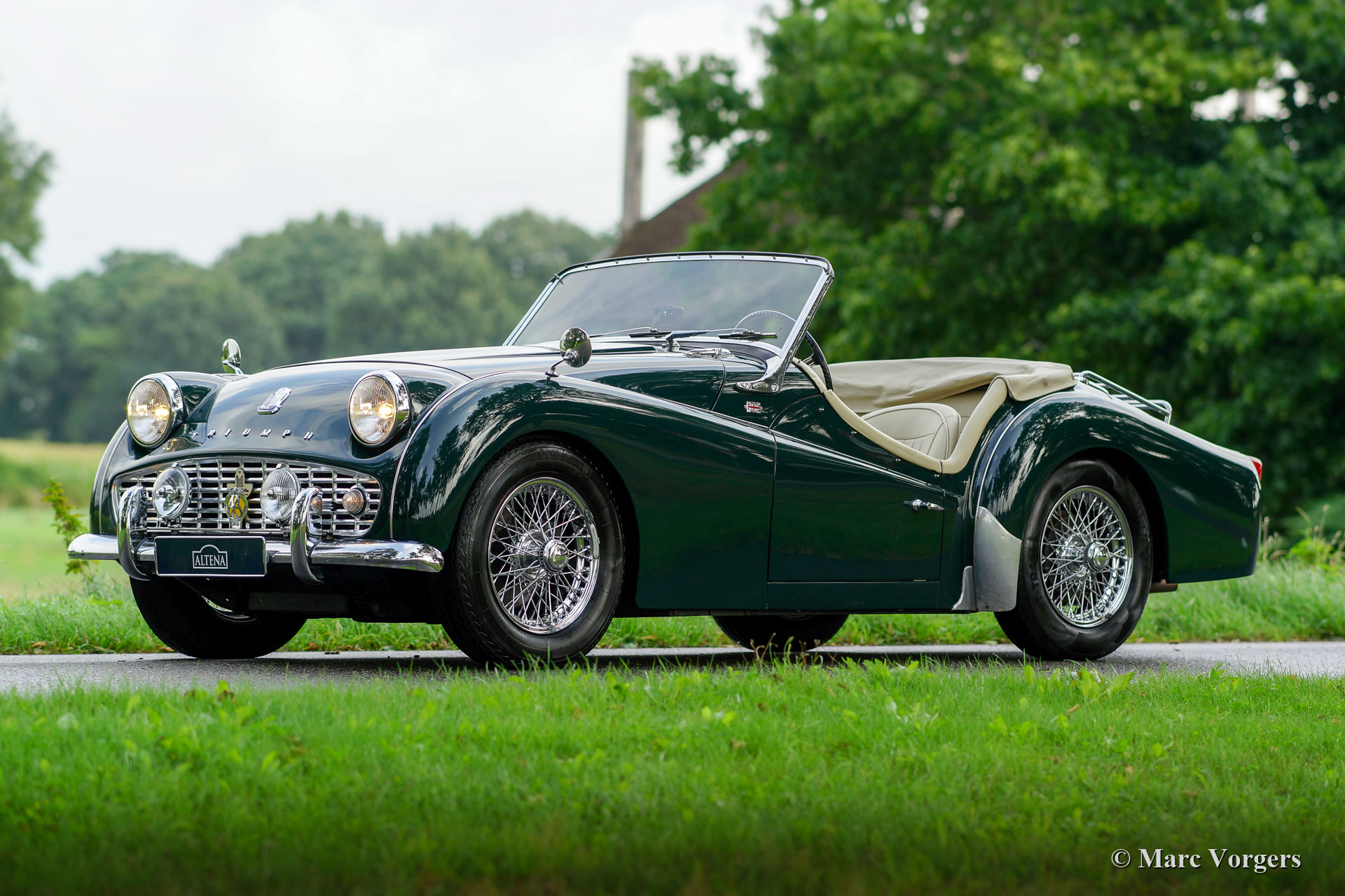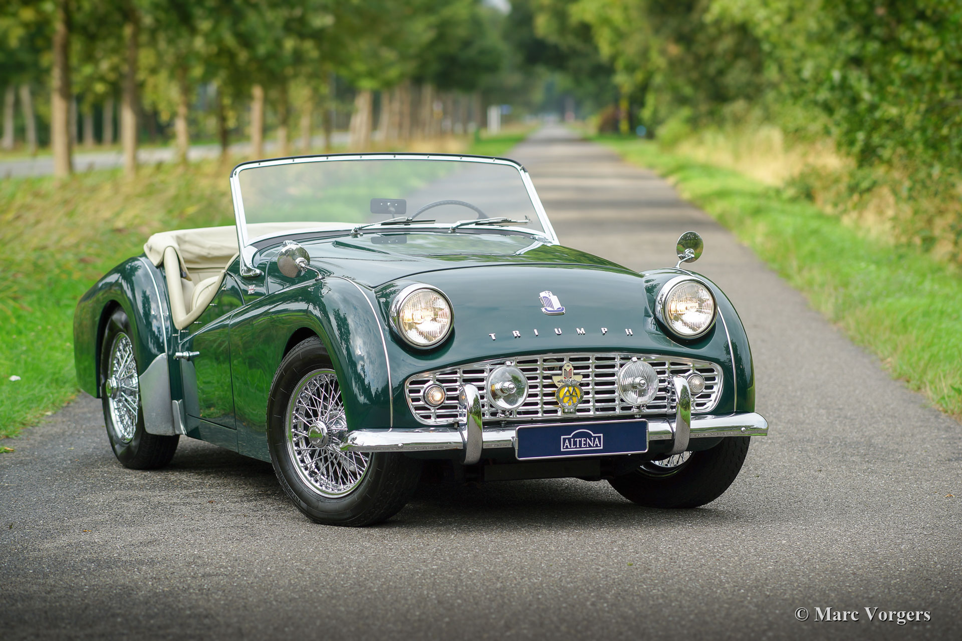 Triumph TR 3A, Jahr 1961. Fahrgestellnummer H2650G64X, Motornummer IS 7727X, Karosserienummer EB7566X. Farbe British Racing Green kombiniert mit einem hellbeigen Leder Interieur (Magnolia). Schwarzes Verdeck, schwarzer Mohair-Persenning und Seitenblenden mit schwarzen Rahmen. Diese wundervolle Triumph TR 3A wurde in den 1990er Jahren von einer niederländischen Restaurierungsfirma ausgiebig und ‘body-off‘ restauriert. Natürlich wurden auch der Motor und das Getriebe überholt und ein neuer Kabelbaum eingebaut. Das Interieur wurde erneuert und alle Chromteile neu verchromt. Diese prächtige Triumph TR 3a ist in einem hervorragenden Zustand und das Auto fährt herrlich! Das Auto ist ausgestattet mit Chromdraht-Räder, Vredestein 165 Sprint Classic Reifen, einem Chrom-Gepäckträger und zusätzlichen Lucas-Lampen an der Vorderseite (klassische Kombination aus Nebelscheinwerfer und Fernscheinwerfer). Dieser Triumph TR 3A ist bildschön, der Motorraum und die Unterseite sind auch sauber und gut detailliert! Dieser Triumph TR 3A steht bereit für neue Abenteuer in den Händen eines neuen Besitzers!