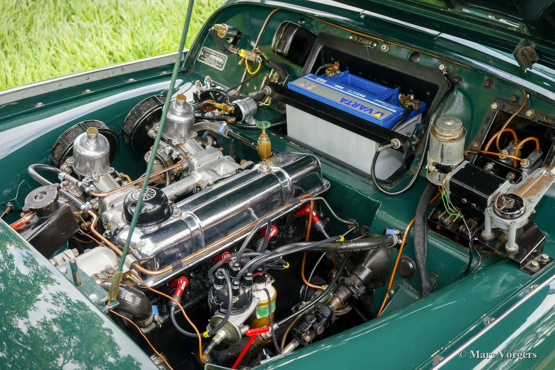 The Triumph TR 3 is a no nonsense sports car; very robust, simple and reliable, a true British sports car all over. The TR 3 was the first production car, off factory, equipped with disc brakes on the front-wheels. The engine was a Standard Vanguard based, cast-iron, long stroke, in-line four cylinder with a displacement of 1991cc. The TR 3 engine was equipped with two carburettors giving a power-output of almost 100 bhp.