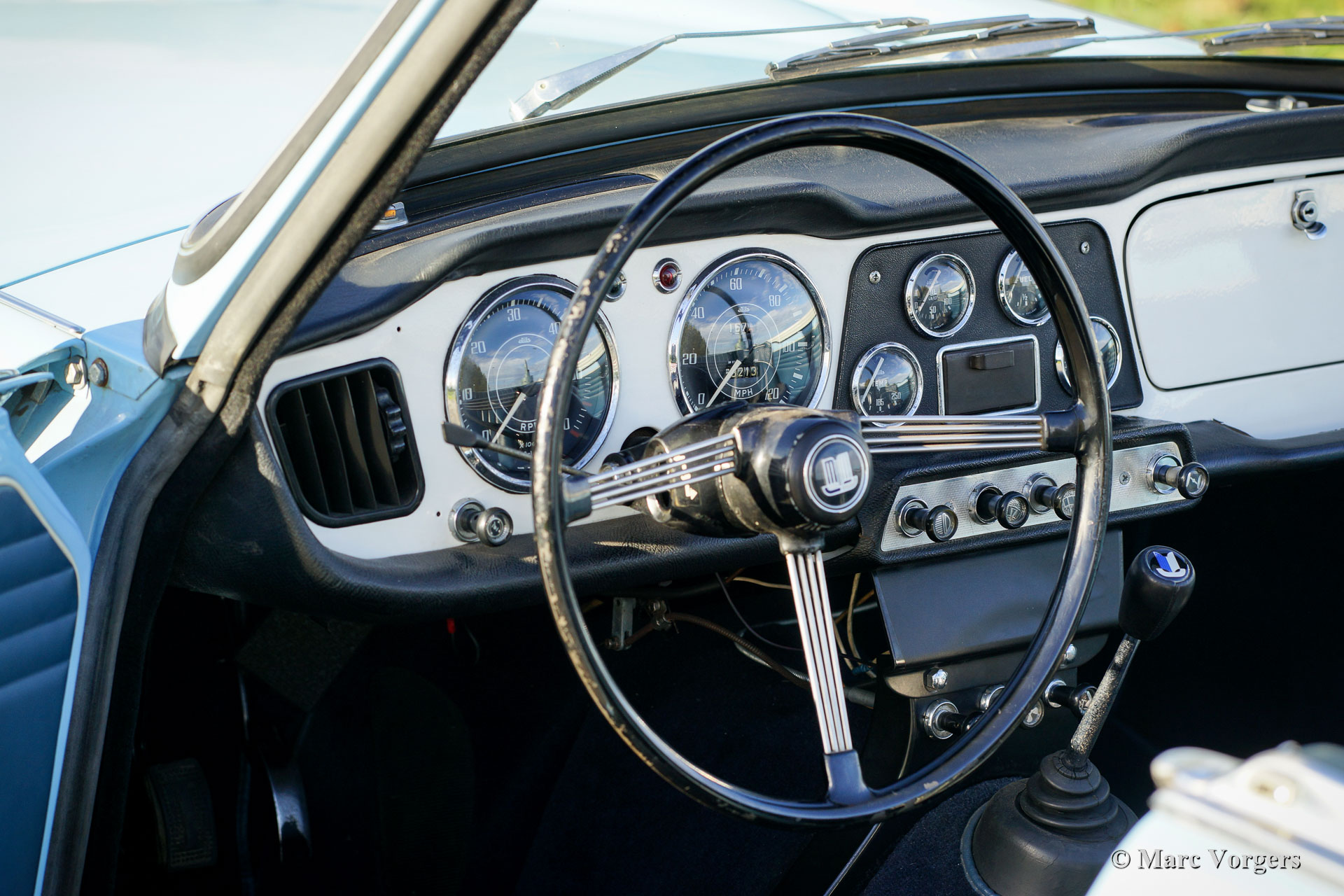 Triumph TR4, Jahr 1962. Farbe „Powder Blue“ kombiniert mit einem dunkelblauen (Shadow Blue) Lederinterieur und dunkelblauem Teppich. Schwarzes Vinyl-Verdeck. Dieser wunderschöne Triumph TR4 wurde unter Beibehaltung der ursprünglichen Details umfassend restauriert. Dies ist eine sehr frühe TR4 mit dem seltenen und sehr begehrten weißen Armaturenbrett und dem Originallenkrad. Das Auto ist in einem ausgezeichneten Zustand und das Auto fährt perfekt! Während der Restaurierung wurde der 2138 cm³ große Vierzylindermotor überholt und auf bleifreies Benzin umgestellt. Das Auto verfügt über Overdrive, silber lackierte Drahträder, elektronische Zündung und einen zusätzlichen elektrischen Kühlerlüfter. Dies ist ein sehr wünschenswerter früher Triumph TR4!