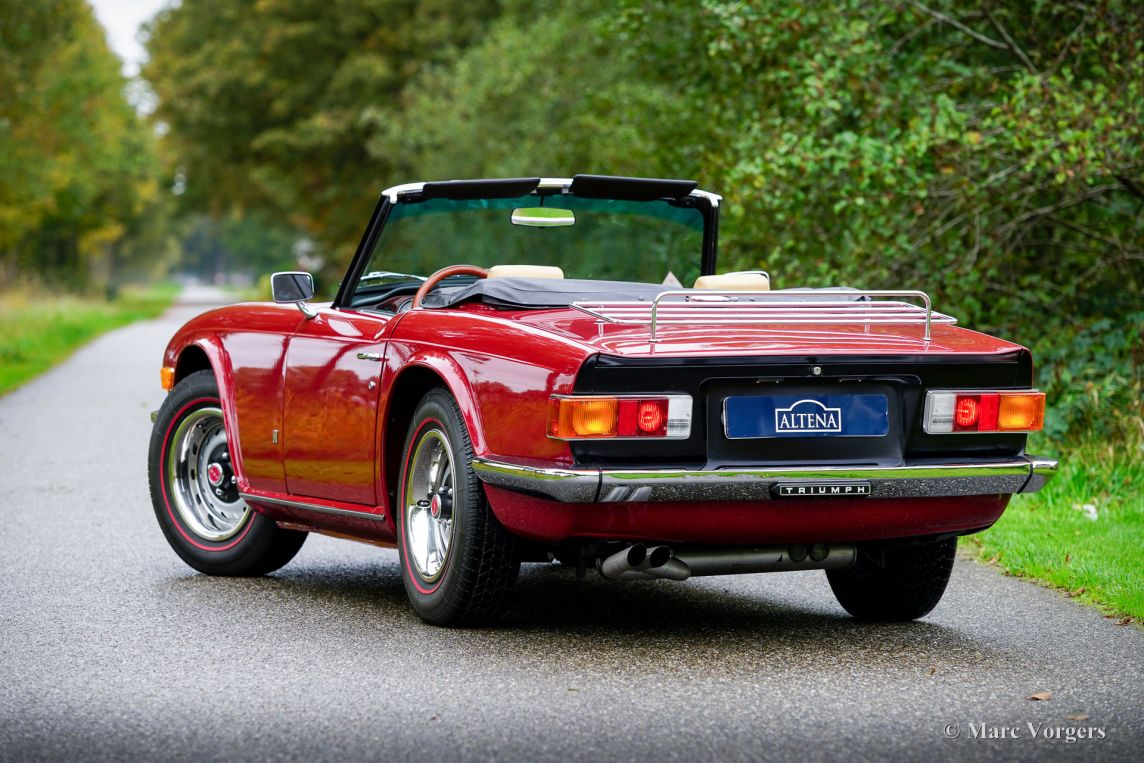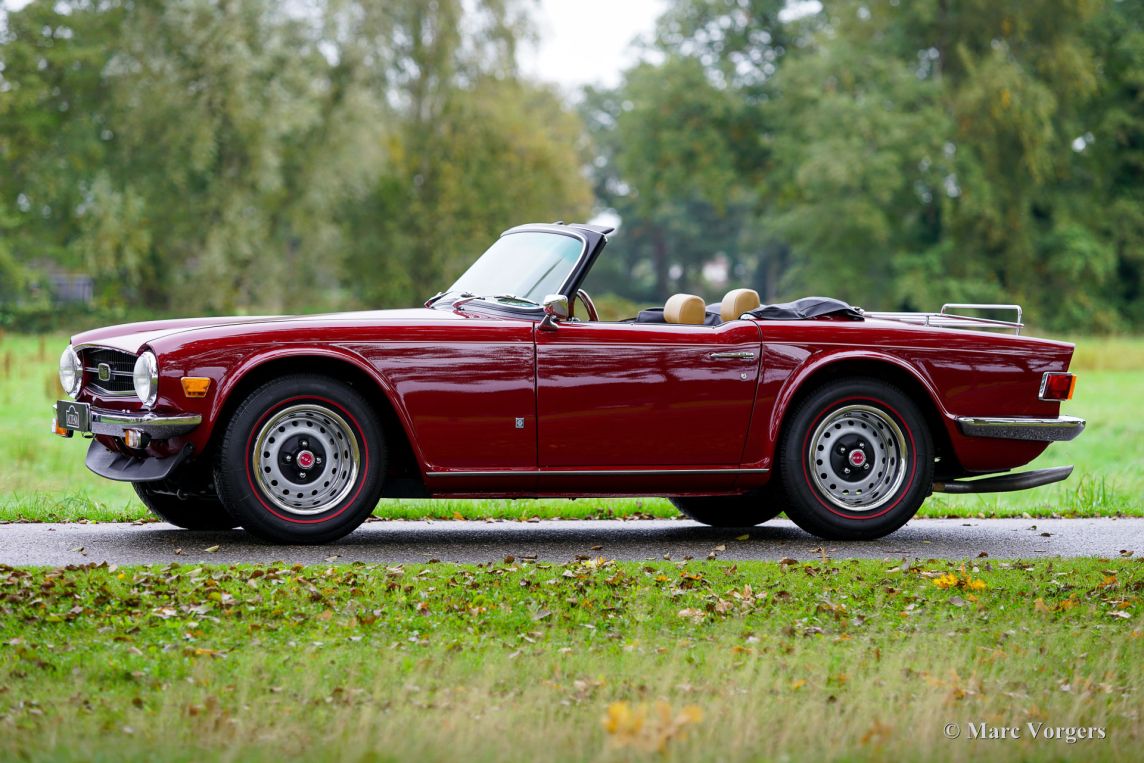 Triumph TR6, Baujahr (November) 1974 (Erstzulassung 1975). Fahrgestellnummer CF29243U, Motornummer CF28269UE, ‚matching numbers‘, ein Heritage-Dokument liegt zur Bestätigung vor. Karosserie in der wunderschönen Farbe Karminrot, kombiniert mit beiger (tan) Kunstlederausstattung und hellbeigem (Magnolia) Teppich. Dieser feine TR6 ist an seiner höheren Frontstoßstange mit den darunter angebrachten Blinkern sofort als Auto des Modelljahres 1975 zu erkennen. Die zweifarbigen orange-weißen Blinker Gläser sind spezifisch für dieses Modelljahr. Dieser TR6 wurde neu in Halifax, Kanada, verkauft. Im Zeitraum 2008 – 2012 wurde das Auto in Kanada restauriert, Rechnungen in Höhe von bis zu 25.000 € sind in der Verlaufsdatei vorhanden. Im Jahr 2020 wurde das Auto in die Niederlande verschifft, wo es 2023 für den Straßenverkehr zugelassen wurde. Der niederländische Besitzer perfektionierte das Auto bis ins kleinste Detail, und in unserer Werkstatt wurden die Hinterachsen, die Vergaser und die Kupplung überholt bzw. erneuert. Dieser wundervolle Triumph TR6 ist in ausgezeichnetem Zustand (sieht aus wie neu!) und ist absolut auf dem neuesten Stand. Dieser TR6 präsentiert sich in einer wunderschönen Farbkombination. Die karminrote Karosseriefarbe, die hellbraunen Sitze und der Magnolia-Teppich harmonieren wunderbar mit dem fantastischen Armaturenbrett aus hochglänzendem Walnussholz! Der Reihensechszylindermotor atmet noch immer durch die originalen Stromberg-Vergaser, das originale Luftfiltergehäuse und die originale (natürlich erneuerte) Stahlauspuffanlage; der Auspuffsound dieses Autos ist absolut zeitgemäß! Dieser TR6 verfügt über eine Kipphebelabdeckung aus Aluminium, ein Sportlenkrad mit Holzkranz, einen Gepäckträger aus Edelstahl, Scheibenwischer aus Edelstahl und ein Paar türmontierte Chrom Rückspiegel. Dieser hochwertige Triumph TR6 ist bereit, in vollen Zügen genossen zu werden!