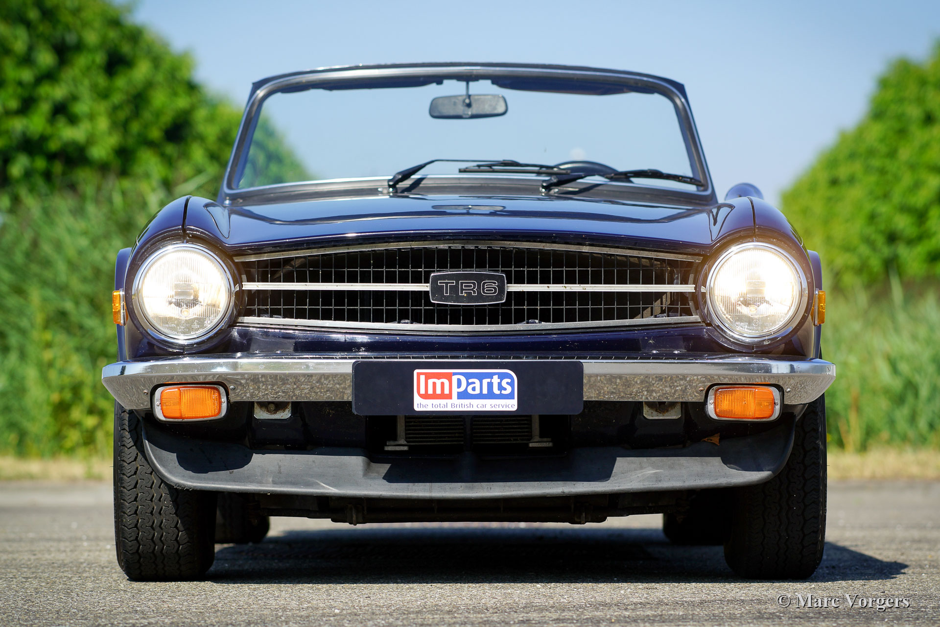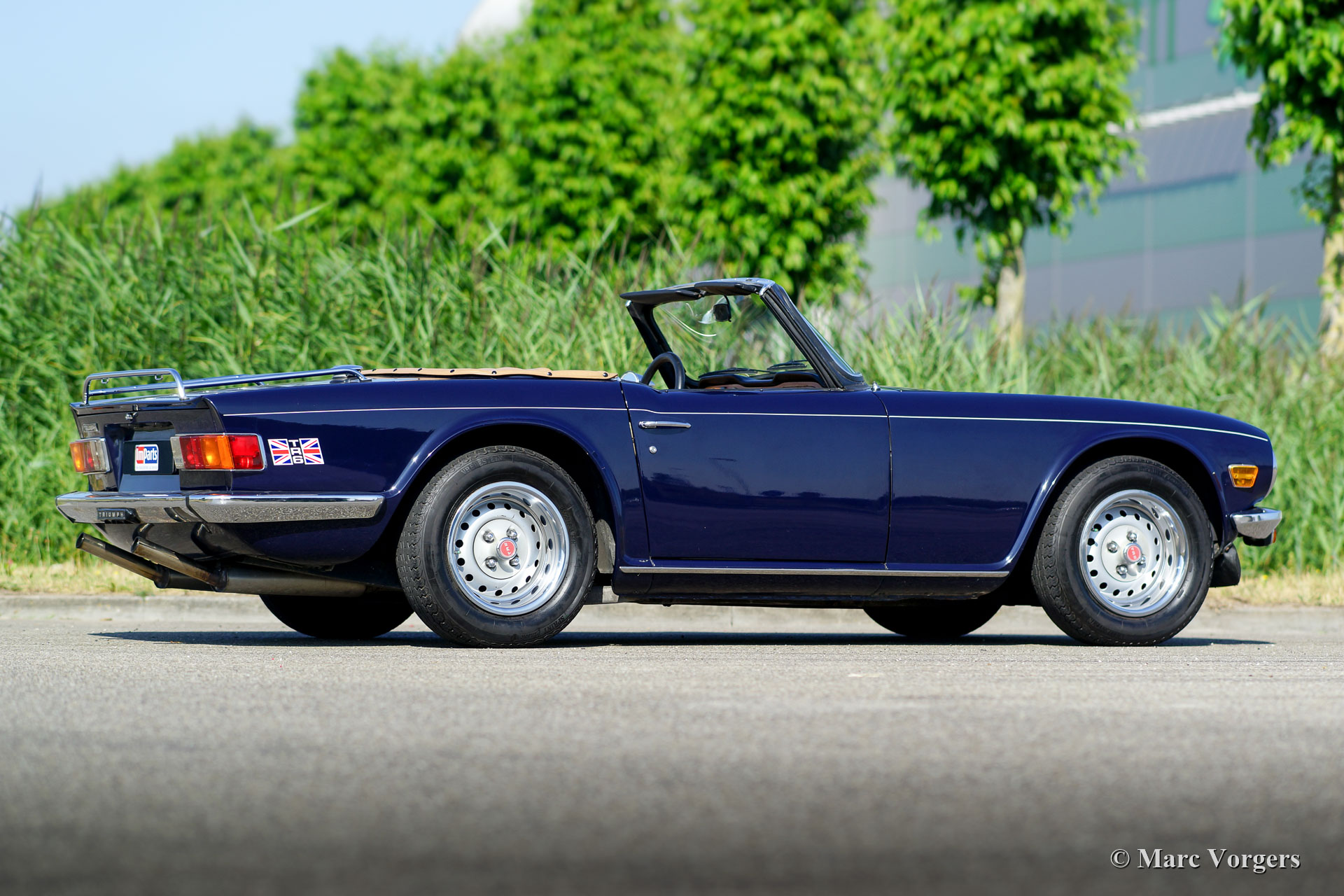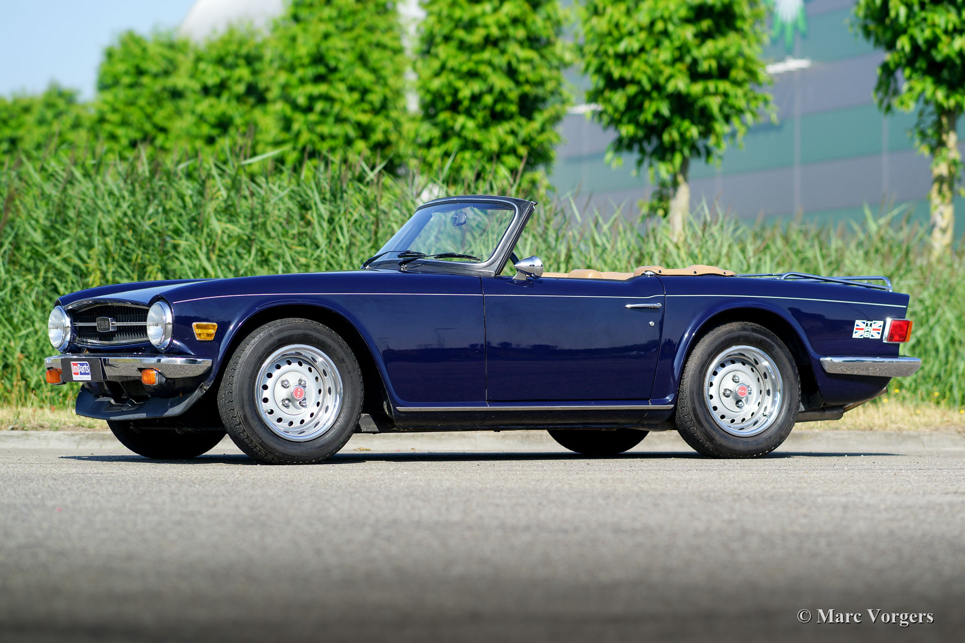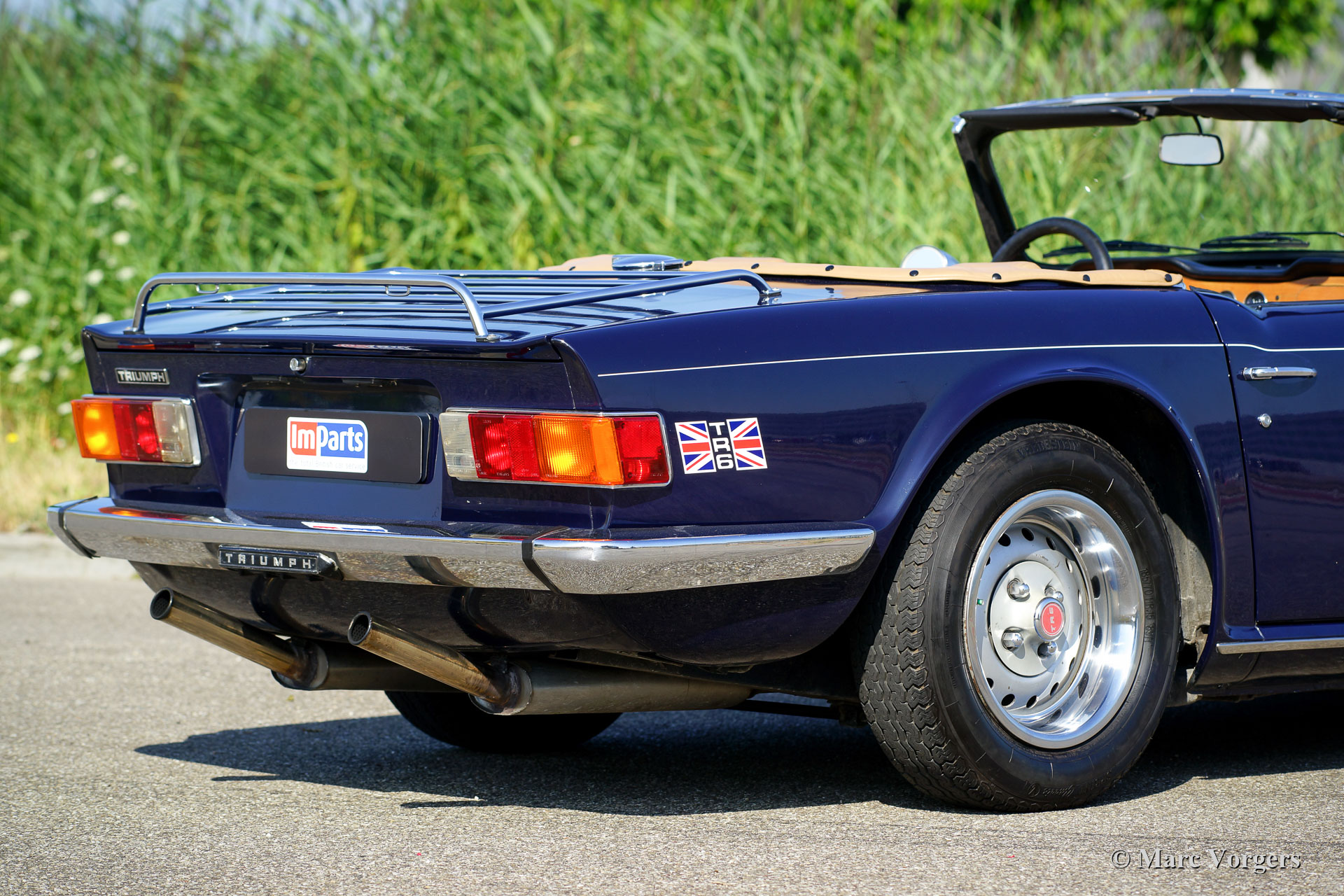 Triumph TR6, Jahr 1976. Farbe dunkel blau ‚Midnight Blue‘ kombiniert mit einer beigen Lederausstattung und schwarzem Teppich. Schwarzes Mohair-Verdeck und eine beige V erdeck-Abdeckung. Dieser fantastische Triumph TR6 wurde in der Vergangenheit umfangreich restauriert, das Auto ist in einem sehr guten Zustand und das Auto fährt herrlich! Das Holz-Armaturenbrett mit den vielen Anzeiger und Chromeinfassungen ist eines der schönsten Sportwagen-Armaturenbretter, die Sie jemals sehen werden. Sie fühlen sich wirklich wie der Pilot eines ‚Kampfflugzeugs‘ in einem Triumph TR6! Der 2,5-Liter-Reihensechszylinder-Motor klingt fantastisch und ist mit zwei neuen S.U. Vergaser ausgestattet. Weiter verfügt dieses Auto über: einen leistungsstärkeren Bremskraftverstärker, elektronische 123 Zündung, einen Ölkühler, einen automatischen elektrischen Kühler, einen Hauptschalter, einen zusätzlichen Stabilisator an die Hinterräder, eine doppelte Sport-Auspuffanlage aus Edelstahl, ein Chrom-Gepäckträger und eine schwarze Tonneau-Abdeckung. Der Triumph TR6 ist der letzte der echten britischen Sportwagen!