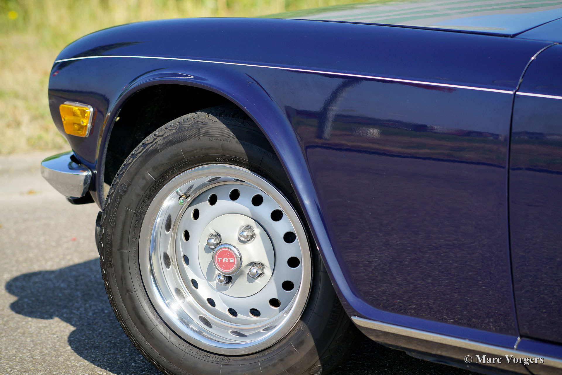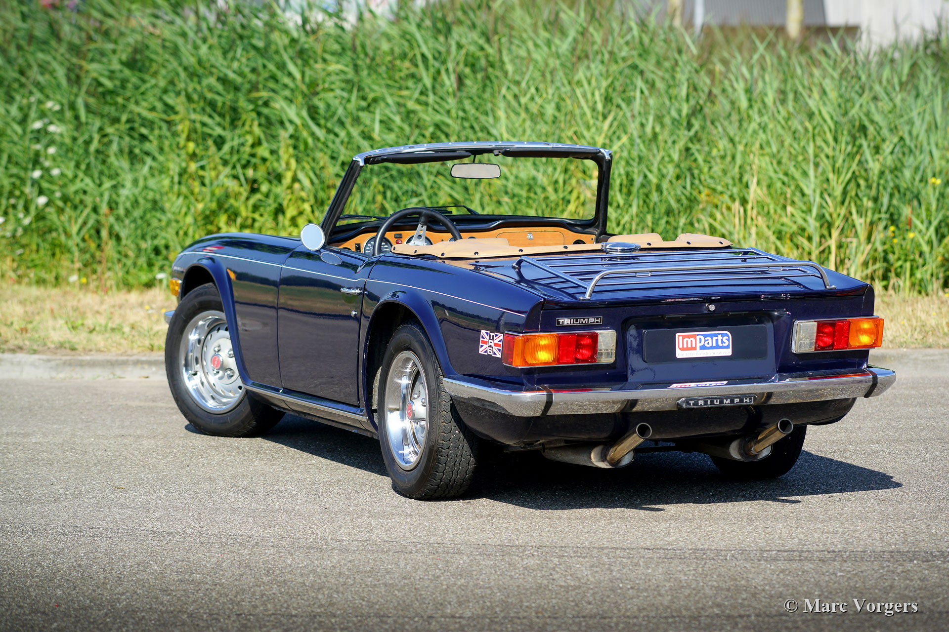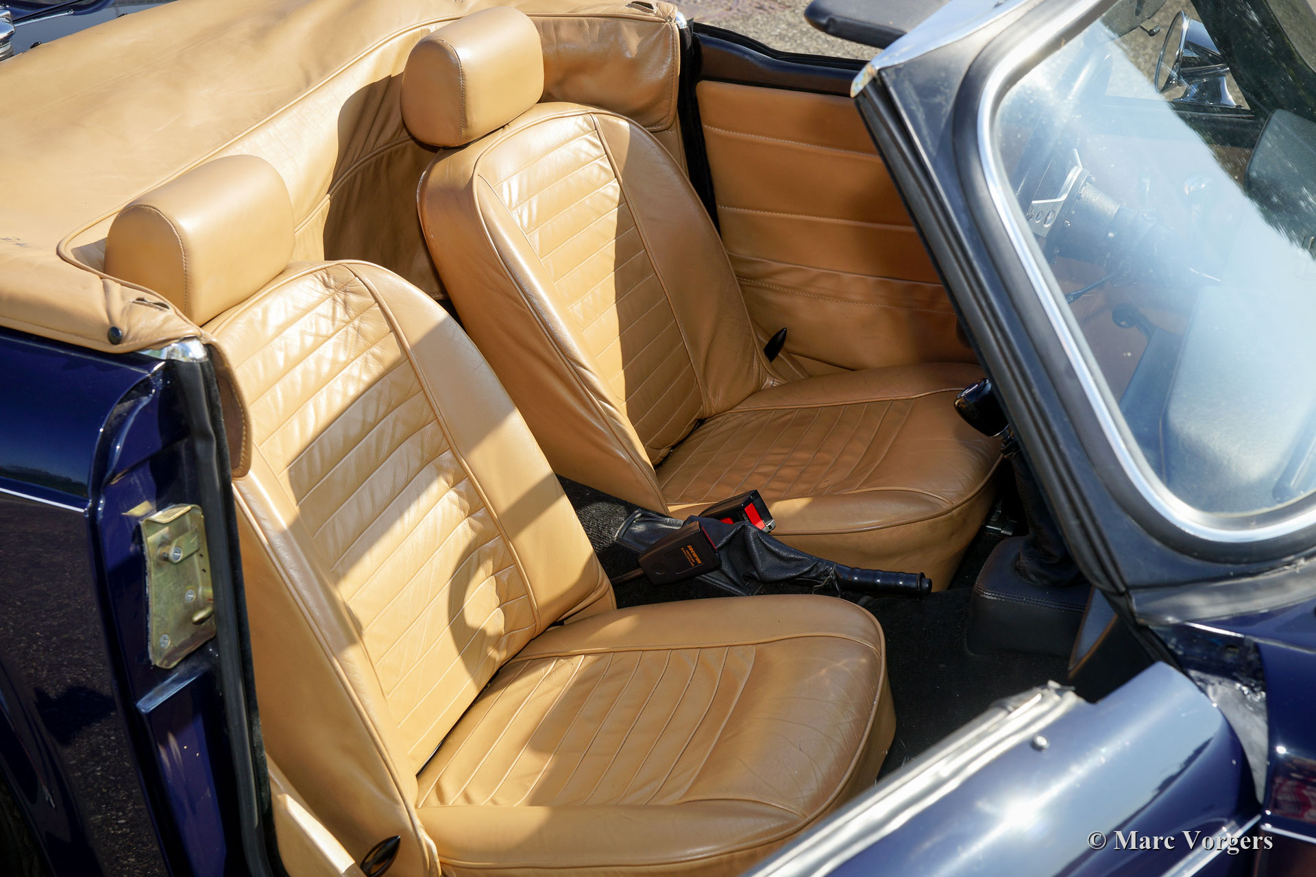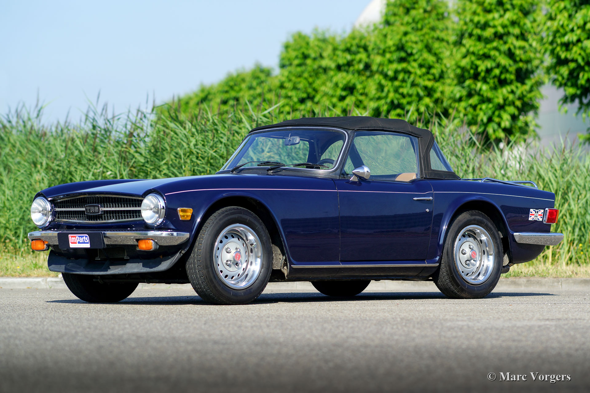 Triumph TR6, Jahr 1976. Farbe dunkel blau ‚Midnight Blue‘ kombiniert mit einer beigen Lederausstattung und schwarzem Teppich. Schwarzes Mohair-Verdeck und eine beige V erdeck-Abdeckung. Dieser fantastische Triumph TR6 wurde in der Vergangenheit umfangreich restauriert, das Auto ist in einem sehr guten Zustand und das Auto fährt herrlich! Das Holz-Armaturenbrett mit den vielen Anzeiger und Chromeinfassungen ist eines der schönsten Sportwagen-Armaturenbretter, die Sie jemals sehen werden. Sie fühlen sich wirklich wie der Pilot eines ‚Kampfflugzeugs‘ in einem Triumph TR6! Der 2,5-Liter-Reihensechszylinder-Motor klingt fantastisch und ist mit zwei neuen S.U. Vergaser ausgestattet. Weiter verfügt dieses Auto über: einen leistungsstärkeren Bremskraftverstärker, elektronische 123 Zündung, einen Ölkühler, einen automatischen elektrischen Kühler, einen Hauptschalter, einen zusätzlichen Stabilisator an die Hinterräder, eine doppelte Sport-Auspuffanlage aus Edelstahl, ein Chrom-Gepäckträger und eine schwarze Tonneau-Abdeckung. Der Triumph TR6 ist der letzte der echten britischen Sportwagen!