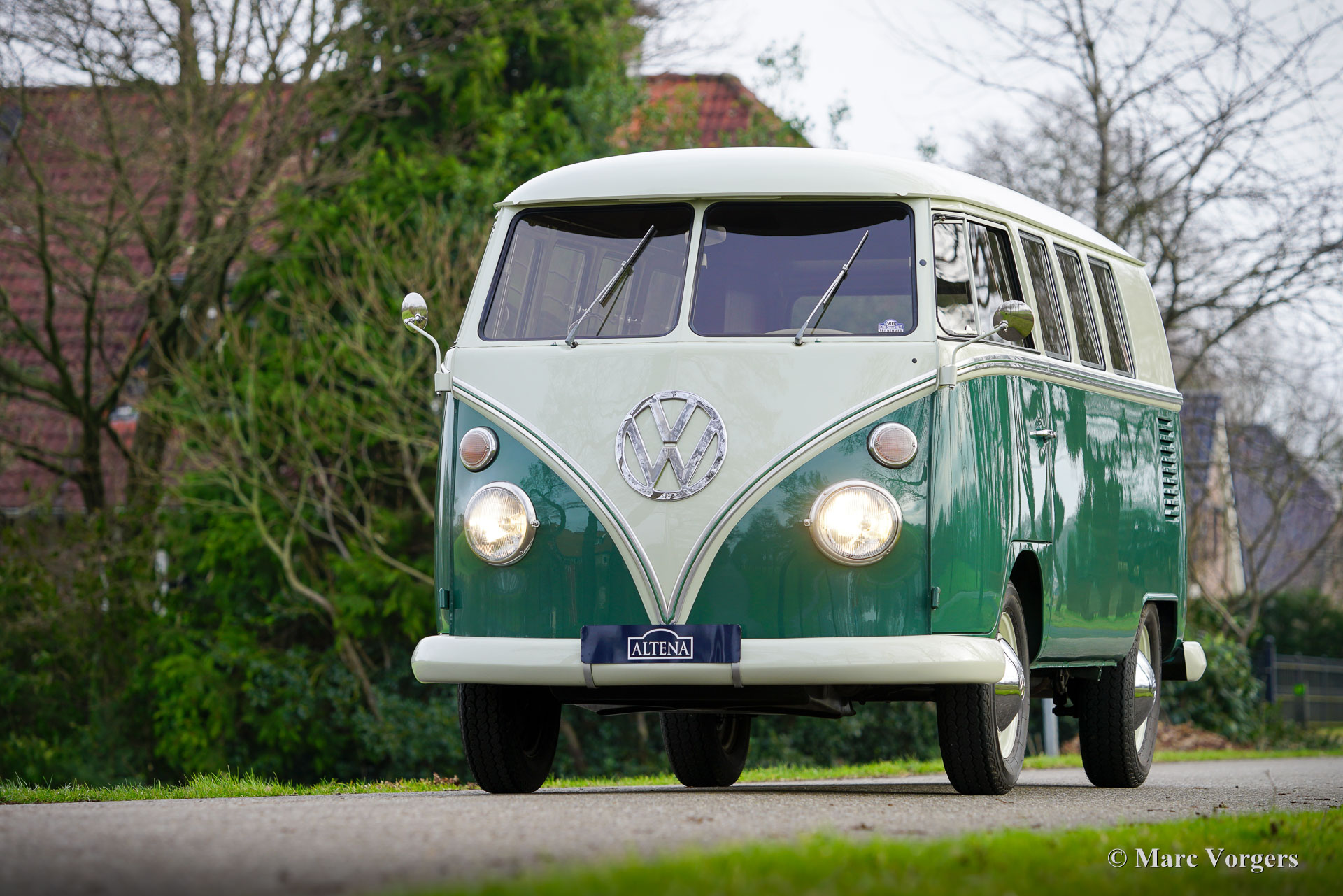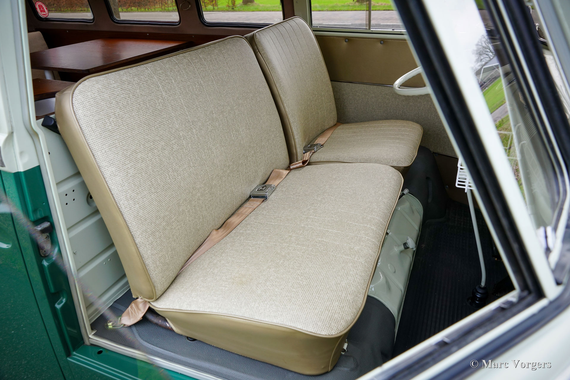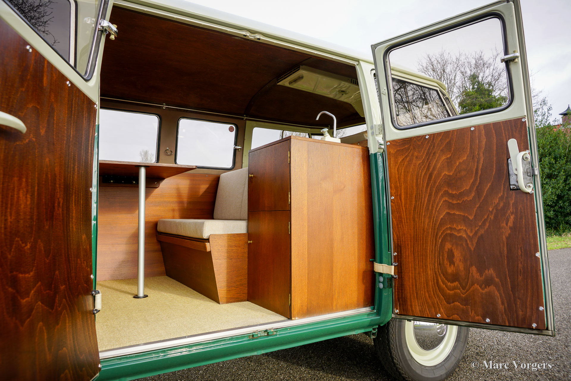 Volkswagen Typ 2 T1 „Sundial“ Camper, Jahr 1964. Farbe: Cremeweiß über Grün. Cremeweiße Räder, Armaturenbrett und Lenkrad. Beige mit hellbeiger Vinyl-Innenpolsterung. Dieser wunderschöne VW-Typ 2 T1 Transporter wurde im Volkswagenwerk Hannover gebaut. Der Kastenwagen T1 wurde neu in die USA geliefert und dort von der Firma Sundial zum Campingfahrzeug umgebaut. Im Jahr 2001 wurde der VW-Camper nach Irland verkauft, 2013 fand das Auto einen neuen Besitzer in Deutschland. In Deutschland wurde das Auto im Zeitraum 2018-2019 von einem Fachbetrieb umfassend und auf sehr hohem Niveau restauriert. Im Streben nach Perfektion wurden Kosten und Mühen nicht gescheut. Die Karosserie wurde wunderbar restauriert, der Innenraum komplett erneuert und die mechanischen Komponenten überholt. Bei der Restaurierung wurde der ursprüngliche 30-PS-Motor durch eine stärkere 80-PS-Variante ersetzt. Natürlich wurden technische Upgrades eingebaut, um dem zusätzlichen Leistungs- und Geschwindigkeitspotenzial gerecht zu werden. Das Lenkgetriebe wurde verbessert und für zusätzliche Bremskraft und Sicherheit wurden Scheibenbremsen an den Vorderrädern angebracht (ein sehr teurer Umbau). Dieser VW-Typ 2 T1 fährt und handhabt sich viel besser als ein völlig originales Exemplar und bietet deswegen viel mehr Fahrspaß! Dieser Volkswagen Typ 2 T1 Camper hat das Aussehen, den Pep und die notwendigen Sicherheitsverbesserungen. Einige von Ihnen könnten durch die Bezeichnung Typ 2 T1 verwirrt sein; Der VW Käfer war das erste Volkswagen-Modell, der Typ 1. Der Transporter oder Microbus war das zweite Modell, der Typ 2. Das erste Transporter-Modell war der T1, der zwischen 1950 und 1967 hergestellt wurde. Dieses einzigartige Fahrzeug verfügt über eine umfangreiche Geschichtsdatei; Eine einmalige Gelegenheit, einen hervorragend restaurierten/aussehenden/fahrenden Volkswagen Typ 2 T1 Camper zu kaufen!