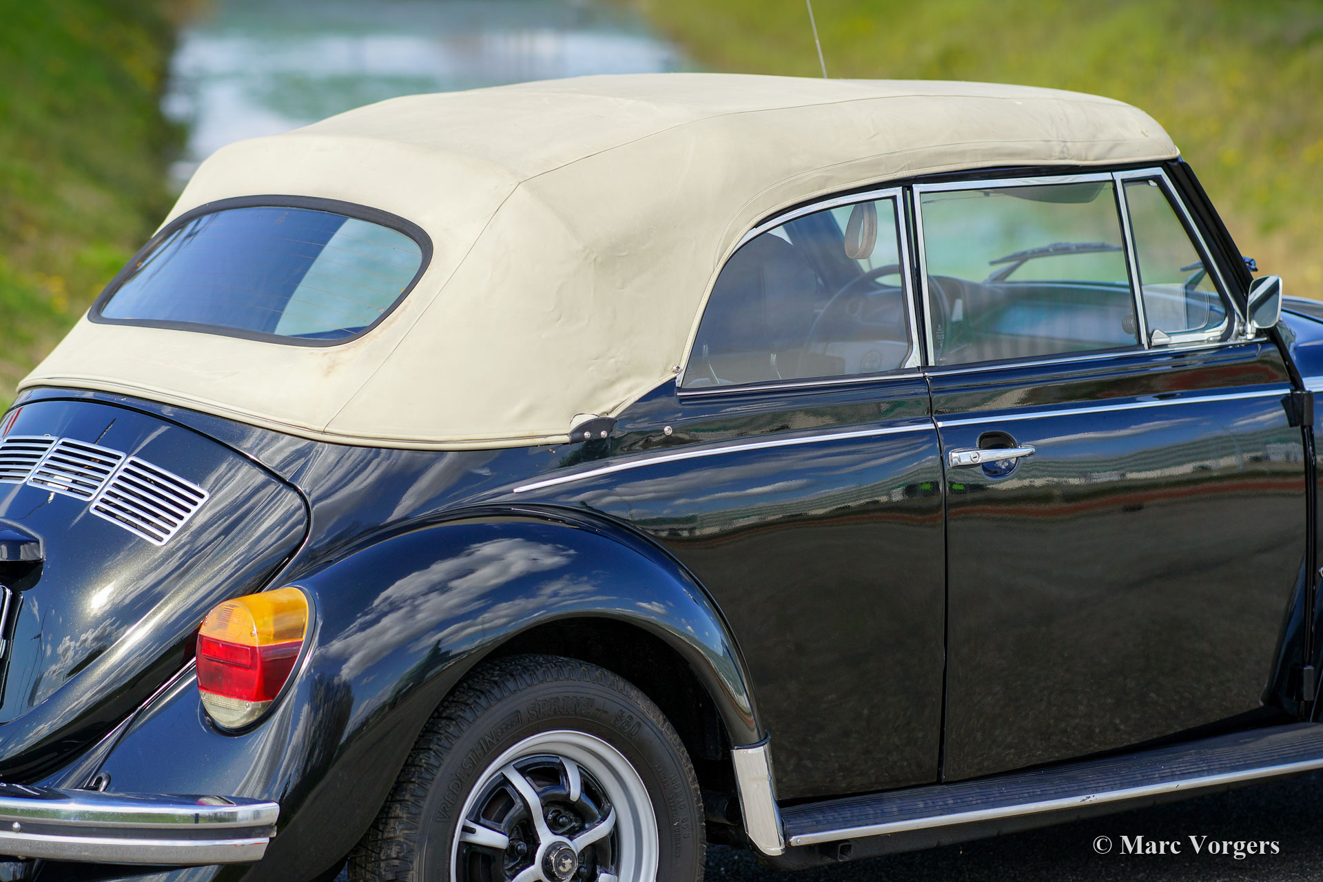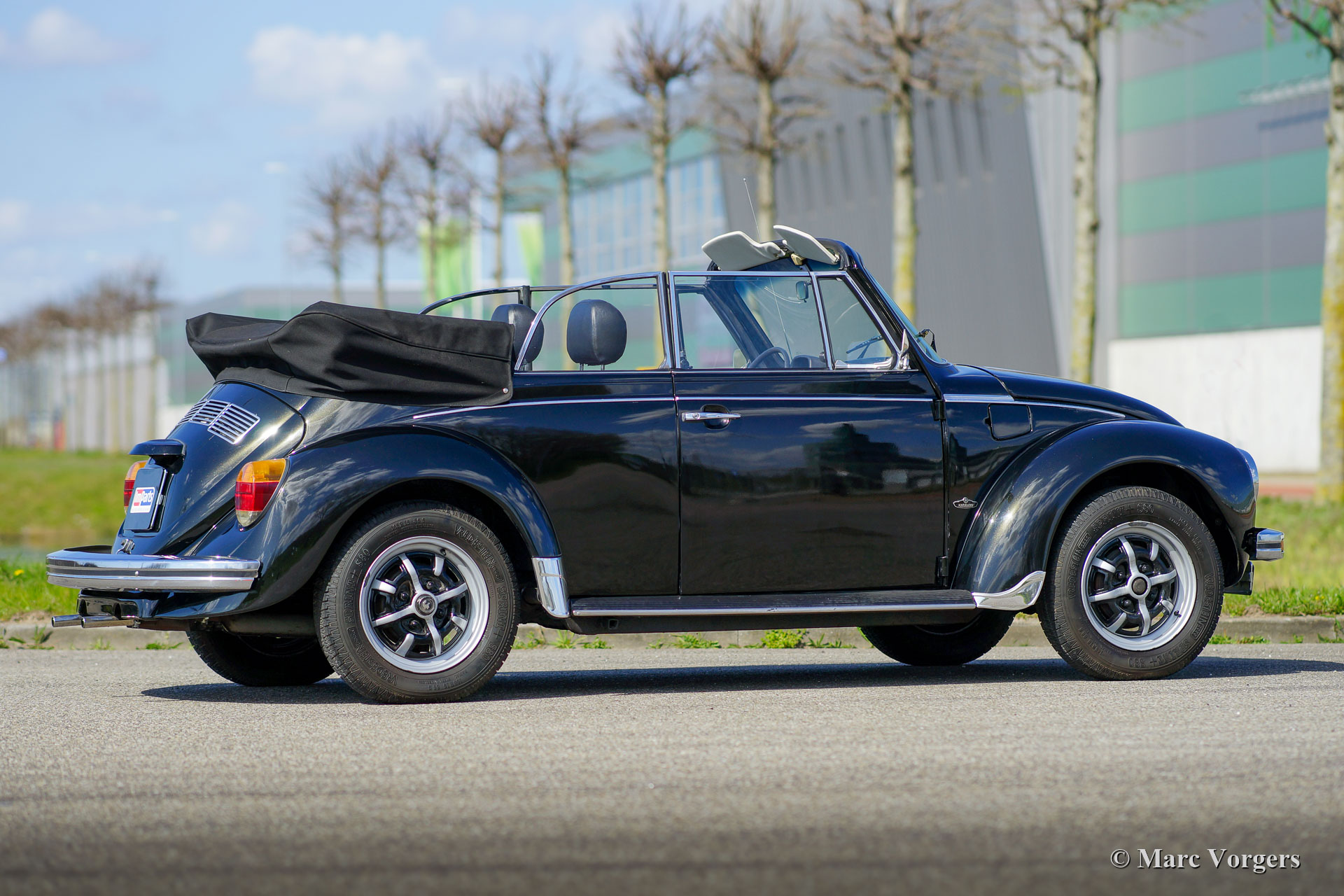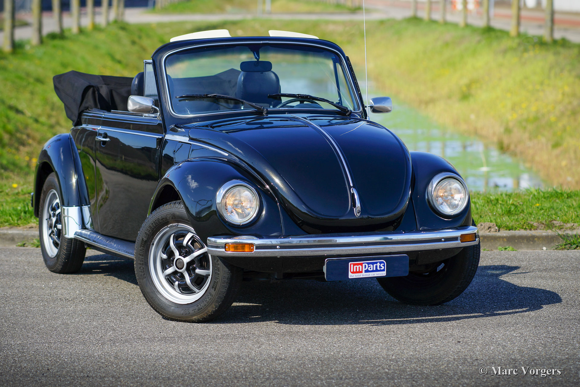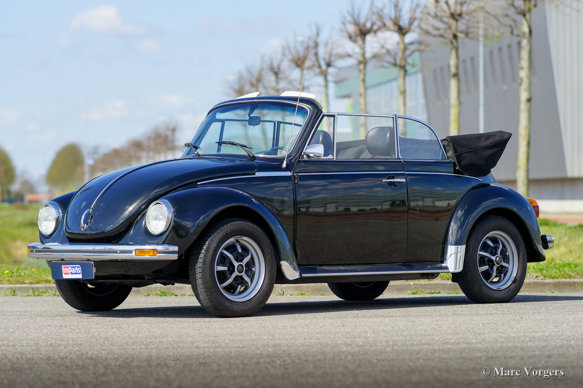 Volkswagen Käfer 1303 Cabrio, Jahr 1978. Farbe schwarz metallic kombiniert mit einem schwarzen Kunstleder-Interieur, einem schwarzen Teppich, einer beigen Verdeck und einer schwarzen Verdeck-Abdeckung. Dieses wundervolle VW Käfer 1303 Cabrio ist in einem sehr guten bis hervorragenden Zustand und das Auto fährt perfekt. Das Auto wurde kürzlich neu lackiert, was perfekt gemacht wurde. Das ursprüngliche Interieur befindet sich in einem ausgezeichneten Zustand mit nur geringfügigen Gebrauchsspuren. Im Kofferraum und im Motorraum sieht alles schön und gepflegt aus. Der luftgekühlte Vierzylinder-Boxermotor mit 1600 ccm läuft und klingt perfekt, und das Auto fährt, schaltet und bremst sehr gut. Der VW Käfer ist eine Ikone, und das Cabrio ist das Superlative Modell. Das VW Käfer Cabrio ist ein großartiges Auto, um Wochenendfahrten mit bis zu 4-5 Personen zu verbringen und sonnige Urlaubsreisen zu genießen! Dies ist ein wunderbares Exemplar für den wahren Enthusiasten.