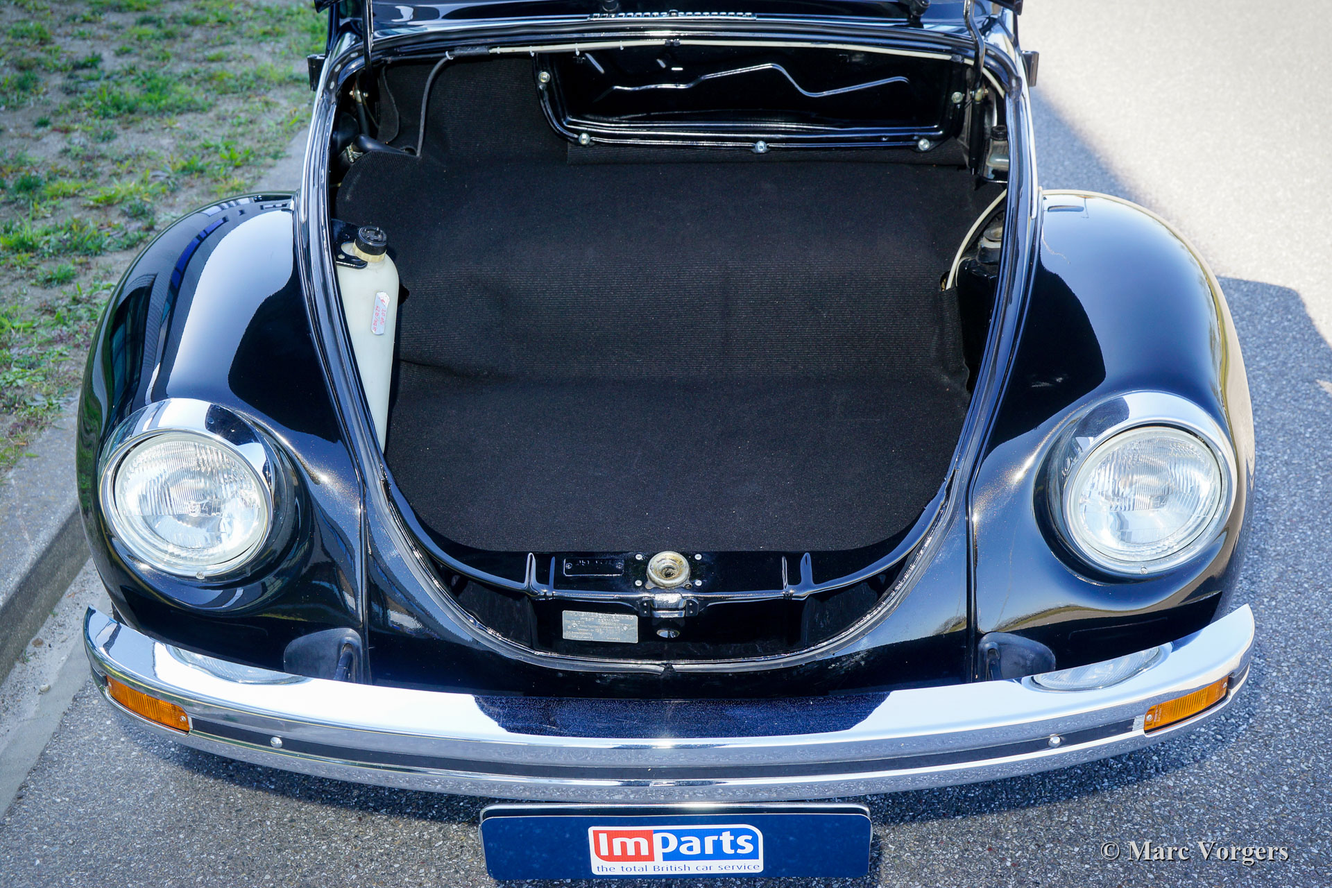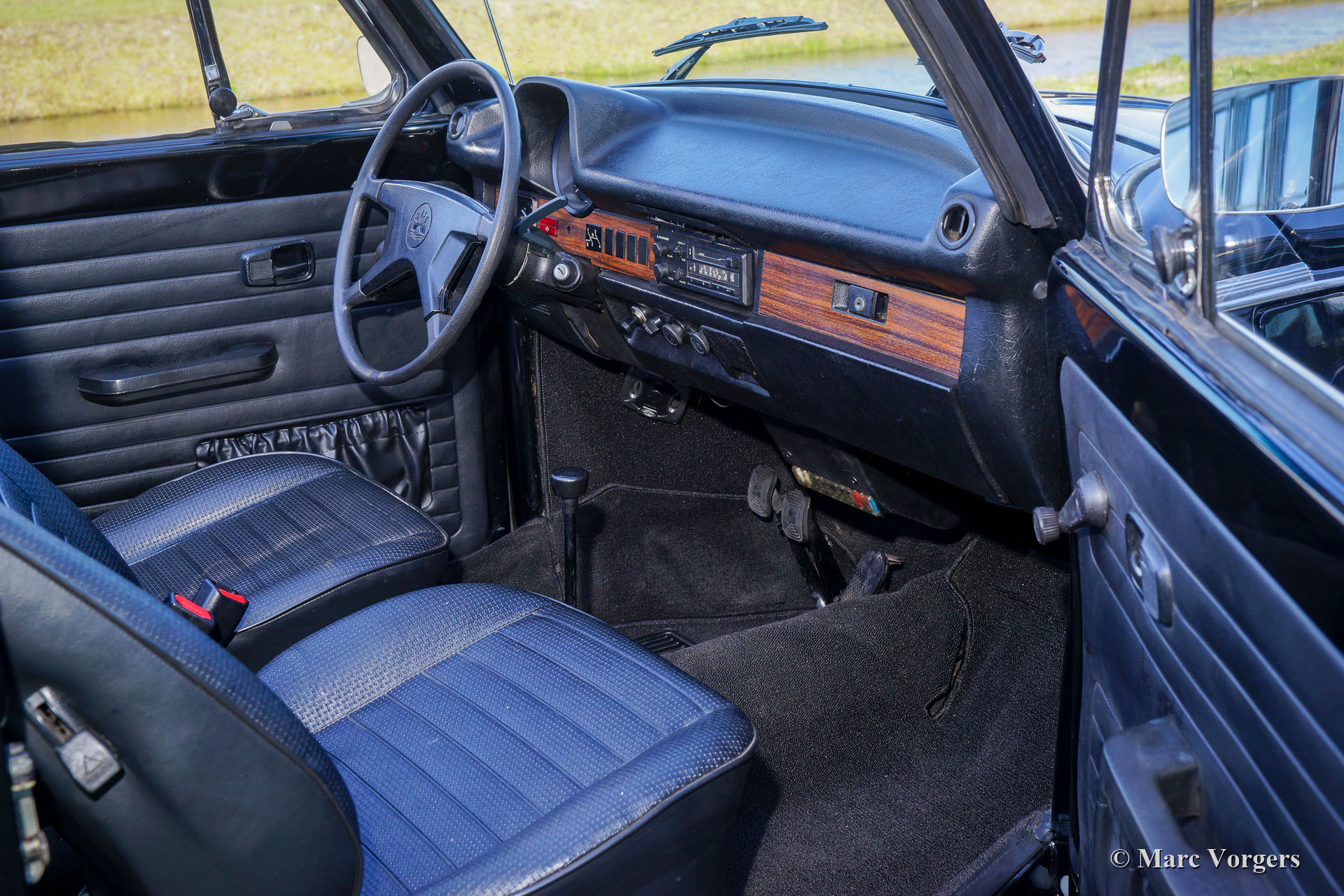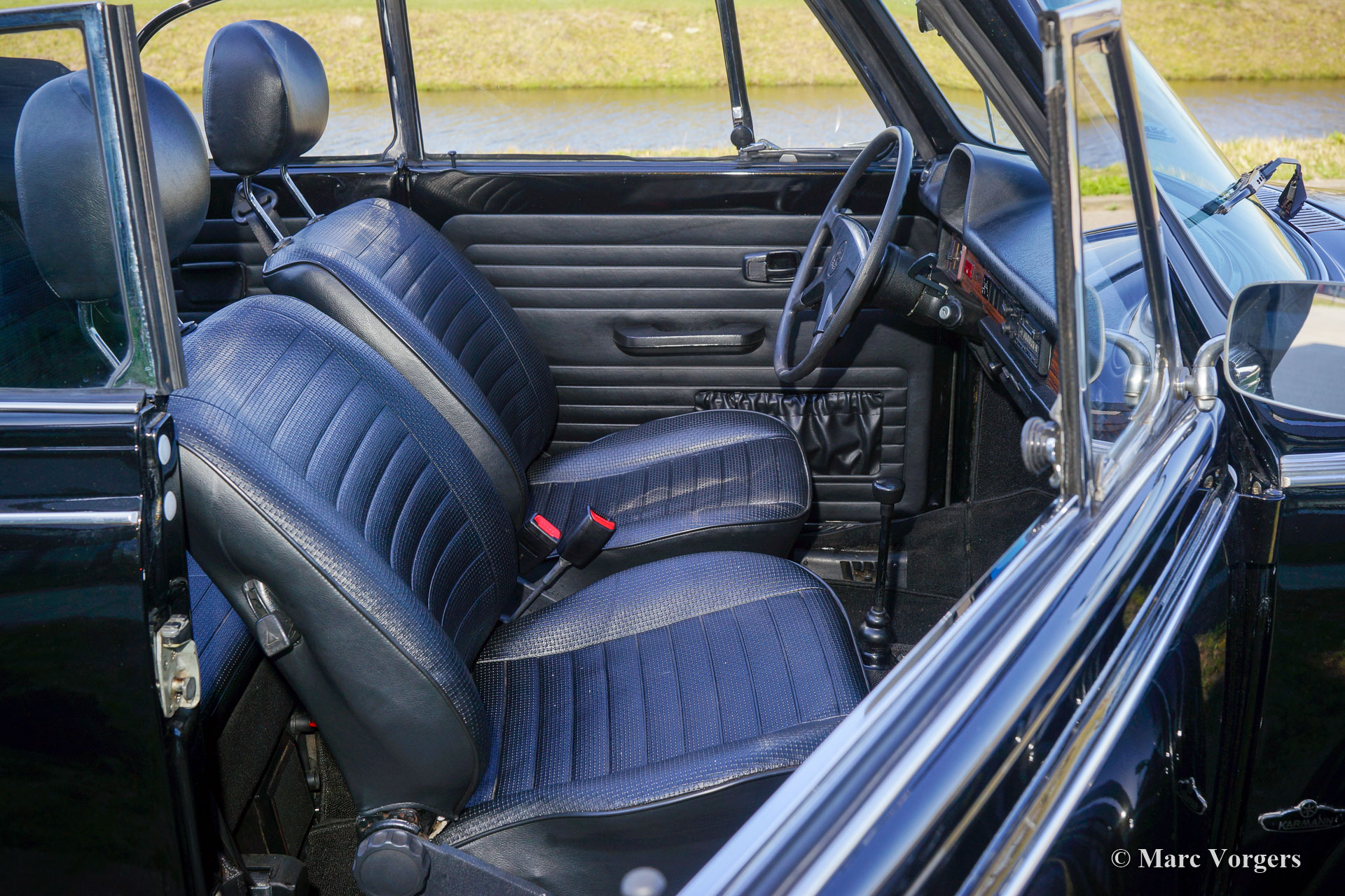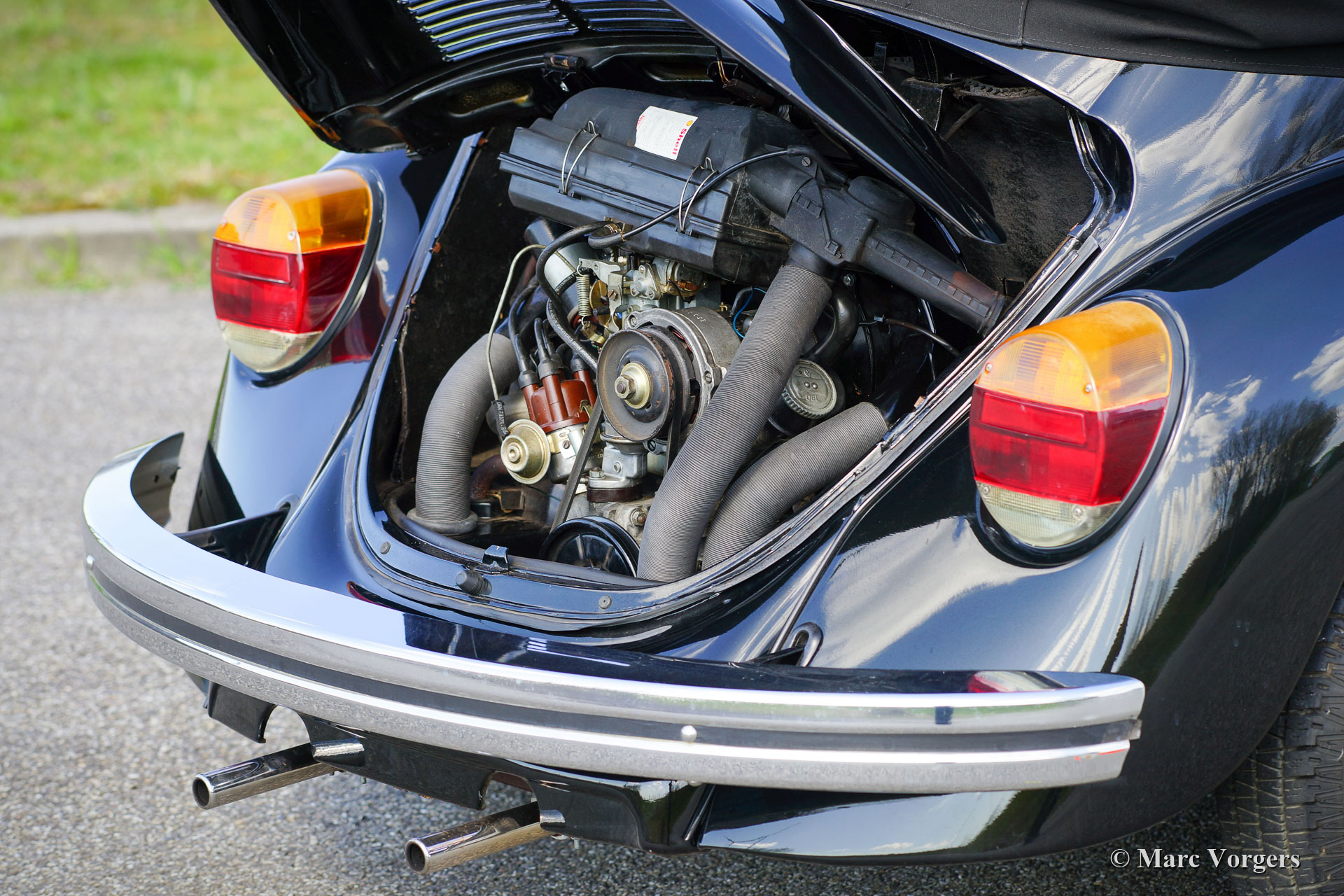 Volkswagen Käfer 1303 Cabrio, Jahr 1978. Farbe schwarz metallic kombiniert mit einem schwarzen Kunstleder-Interieur, einem schwarzen Teppich, einer beigen Verdeck und einer schwarzen Verdeck-Abdeckung. Dieses wundervolle VW Käfer 1303 Cabrio ist in einem sehr guten bis hervorragenden Zustand und das Auto fährt perfekt. Das Auto wurde kürzlich neu lackiert, was perfekt gemacht wurde. Das ursprüngliche Interieur befindet sich in einem ausgezeichneten Zustand mit nur geringfügigen Gebrauchsspuren. Im Kofferraum und im Motorraum sieht alles schön und gepflegt aus. Der luftgekühlte Vierzylinder-Boxermotor mit 1600 ccm läuft und klingt perfekt, und das Auto fährt, schaltet und bremst sehr gut. Der VW Käfer ist eine Ikone, und das Cabrio ist das Superlative Modell. Das VW Käfer Cabrio ist ein großartiges Auto, um Wochenendfahrten mit bis zu 4-5 Personen zu verbringen und sonnige Urlaubsreisen zu genießen! Dies ist ein wunderbares Exemplar für den wahren Enthusiasten.