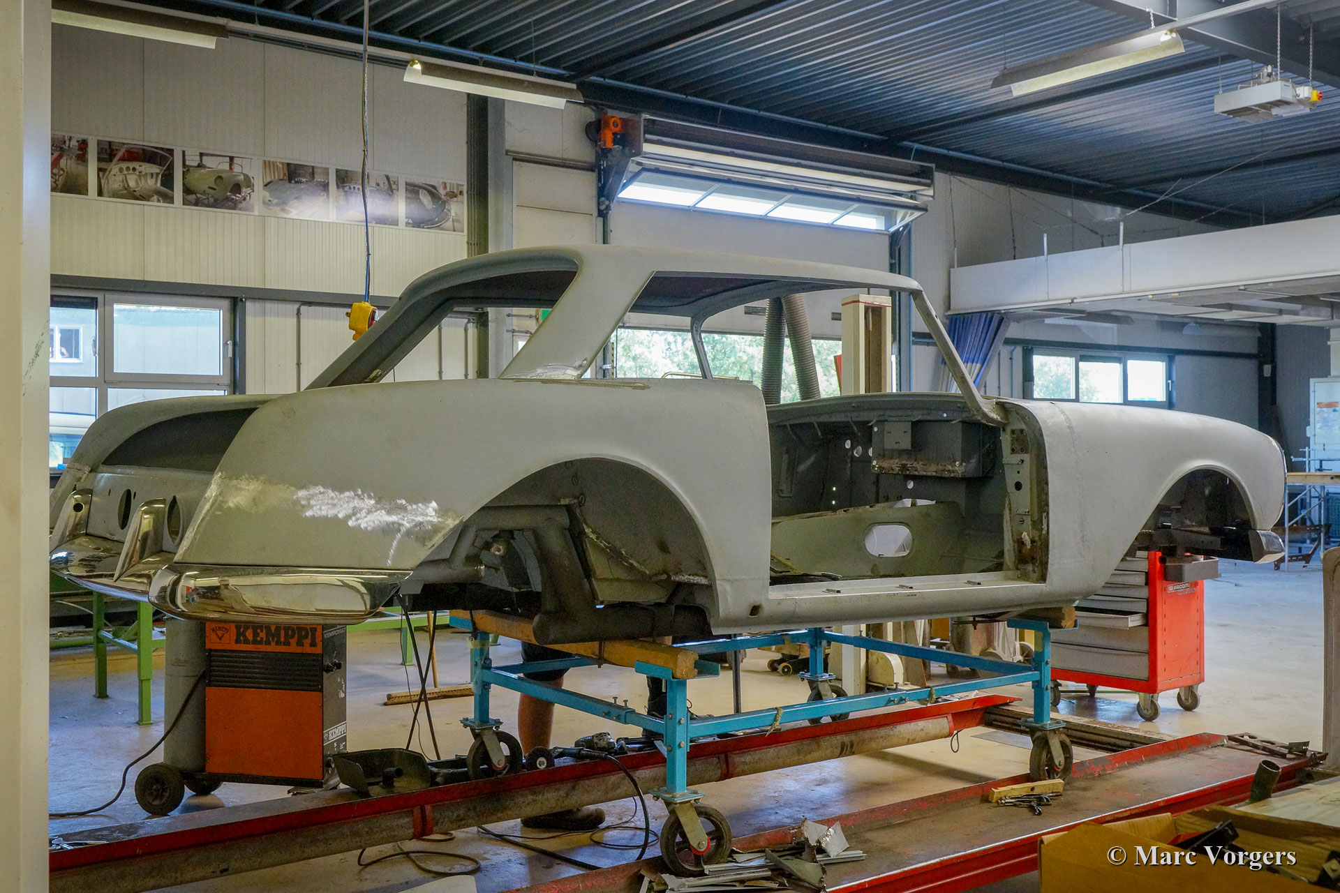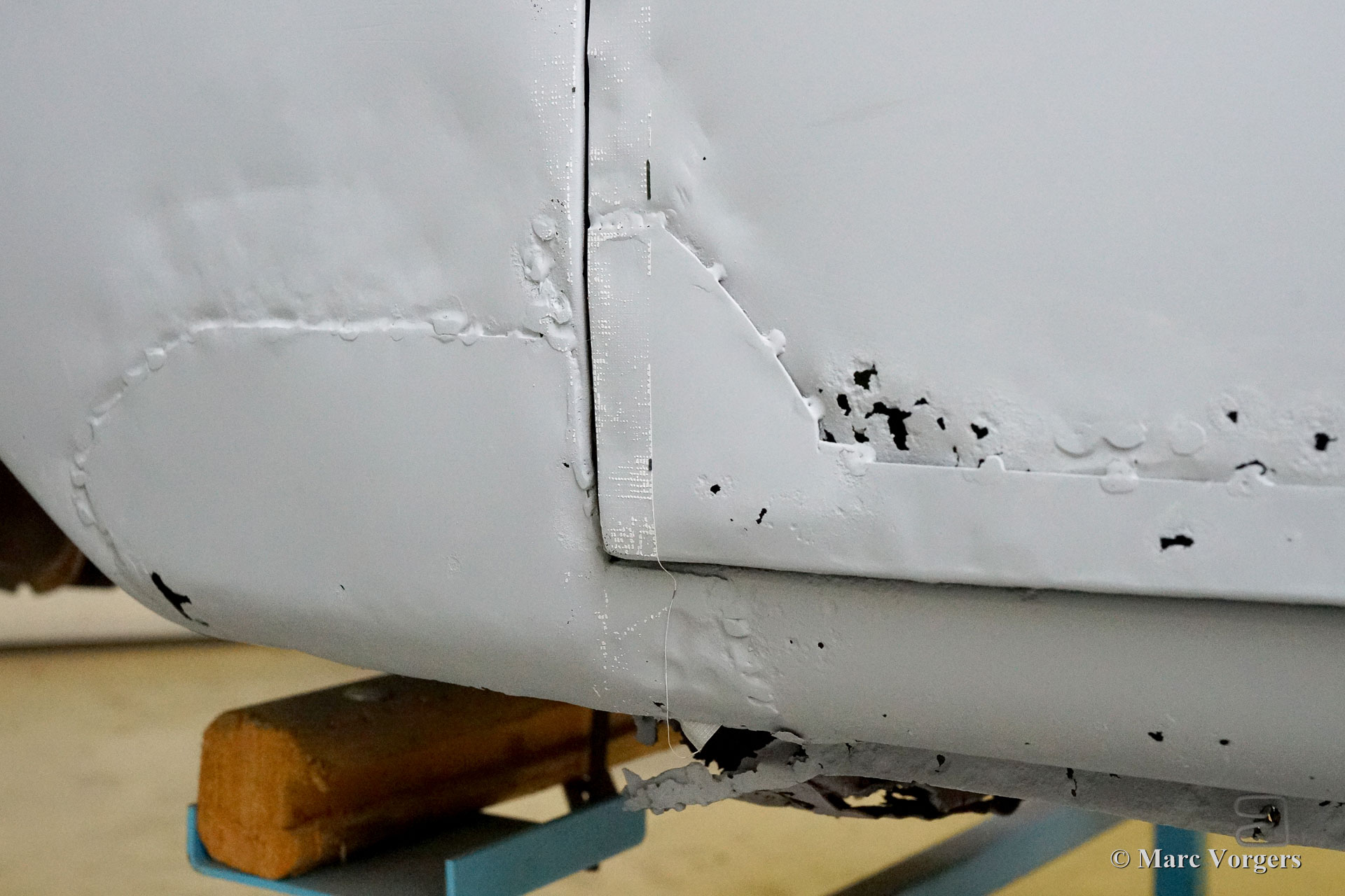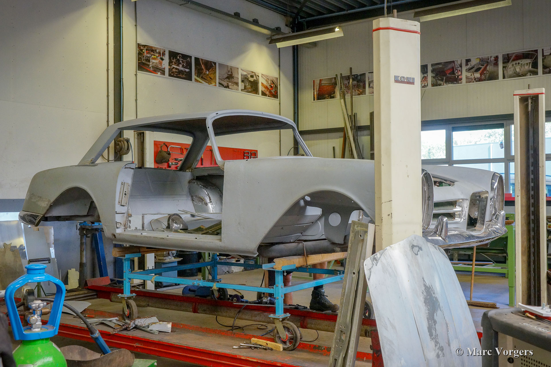 Dieser Facel Vega Facel 3 aus dem Jahr 1963 erhält in unseren Werkstätten eine vollständige Restaurierung der Karosserie. Anderswo wurde das Auto demontiert, und einige Blecharbeiten wurden ausgeführt. Wie Sie auf den Bildern sehen können (Auto in grauer Grundierung), ist die früher ausgeführte Arbeit von sehr schlechter Qualität ... Wir haben mit der Blechrestaurierung der Karosserie begonnen. Wie Sie auf den Fotos sehen können, ist die Karosserie in einem ziemlich schlechten Zustand. Korrosion hat die meisten unteren Ecken und Kanten weggefressen. Viele Teile des Bodens müssen ebenfalls erneuert werden, dies ist nicht die einfachste Aufgabe, da der Körper des Facel 3 an das Stahlrohrchassis geschweißt ist.