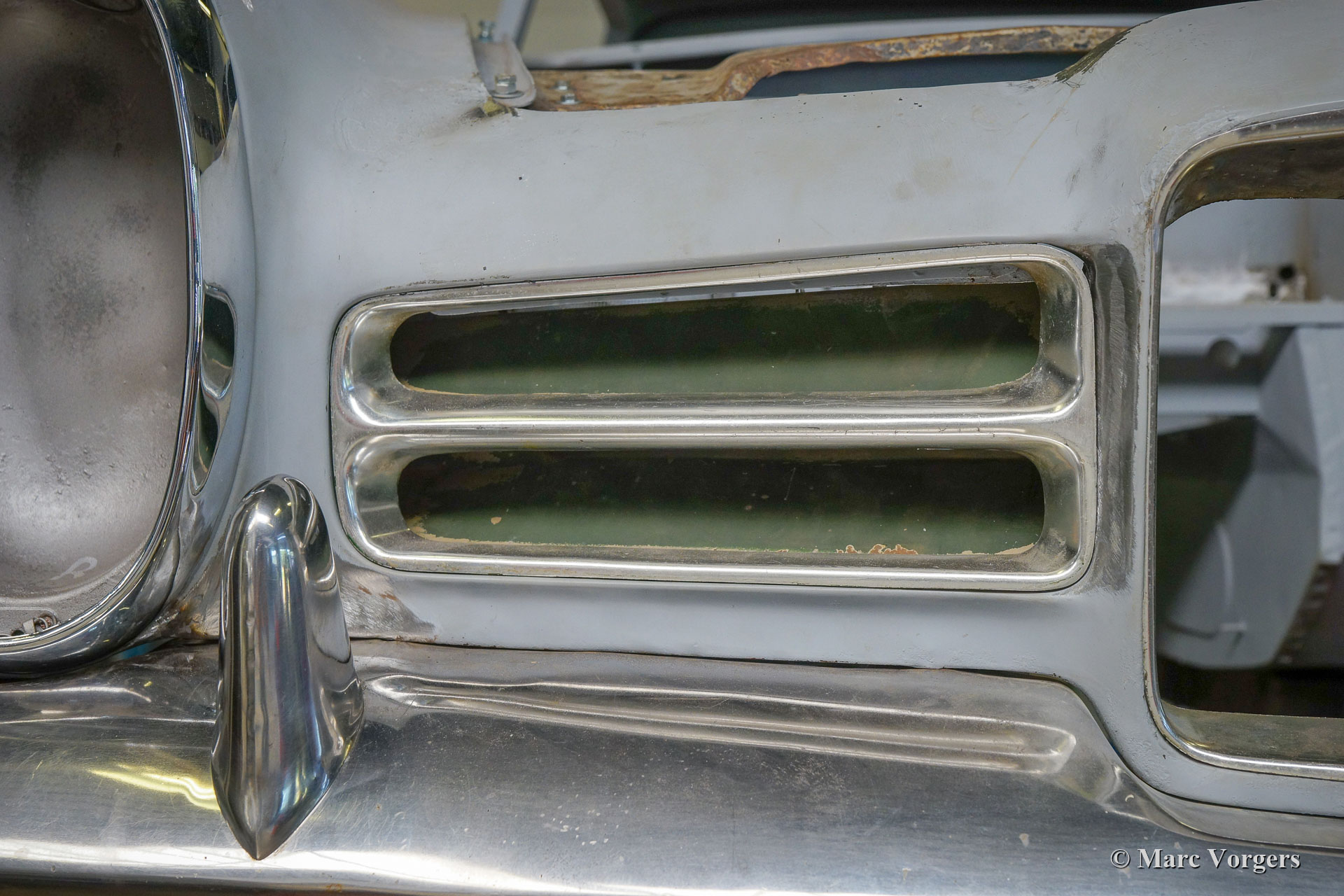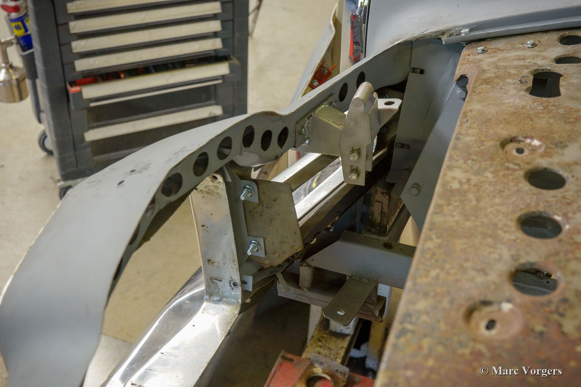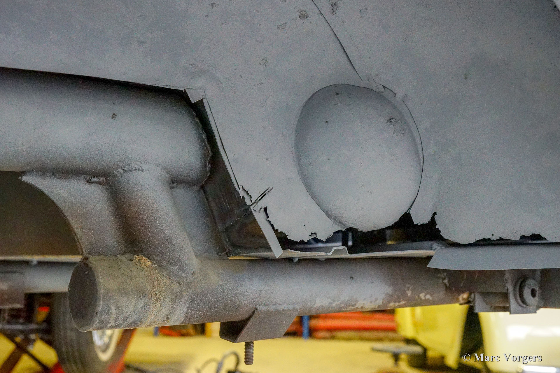 Dieser Facel Vega Facel 3 aus dem Jahr 1963 erhält in unseren Werkstätten eine vollständige Restaurierung der Karosserie. Anderswo wurde das Auto demontiert, und einige Blecharbeiten wurden ausgeführt. Wie Sie auf den Bildern sehen können (Auto in grauer Grundierung), ist die früher ausgeführte Arbeit von sehr schlechter Qualität ... Wir haben mit der Blechrestaurierung der Karosserie begonnen. Wie Sie auf den Fotos sehen können, ist die Karosserie in einem ziemlich schlechten Zustand. Korrosion hat die meisten unteren Ecken und Kanten weggefressen. Viele Teile des Bodens müssen ebenfalls erneuert werden, dies ist nicht die einfachste Aufgabe, da der Körper des Facel 3 an das Stahlrohrchassis geschweißt ist.