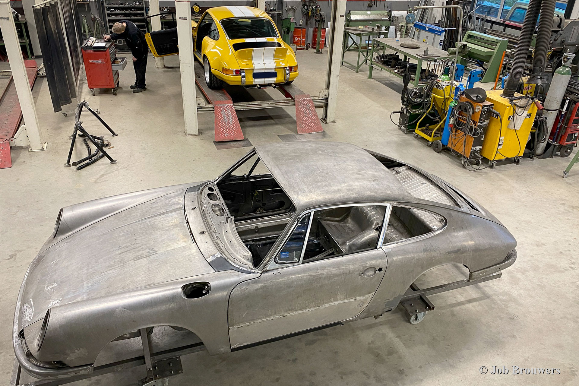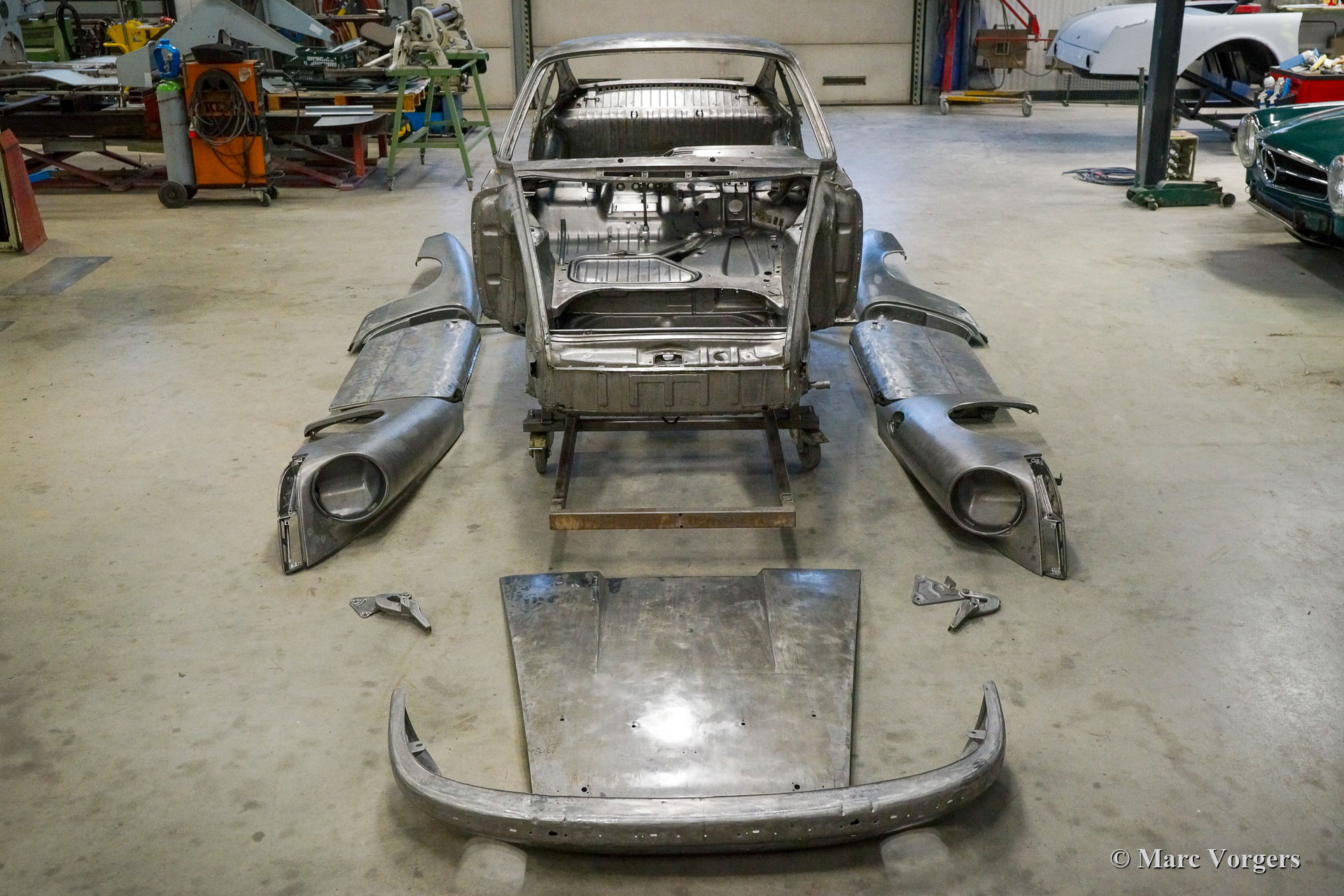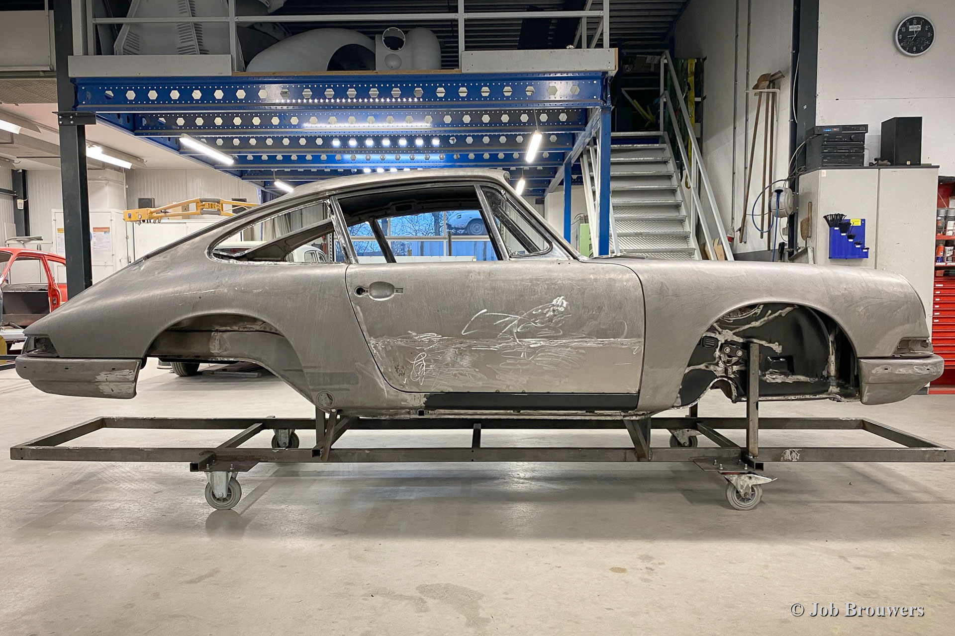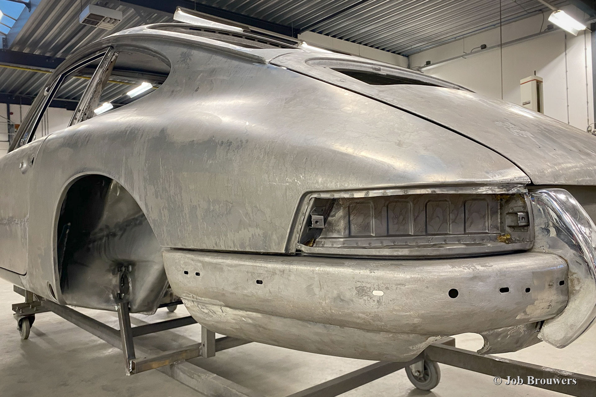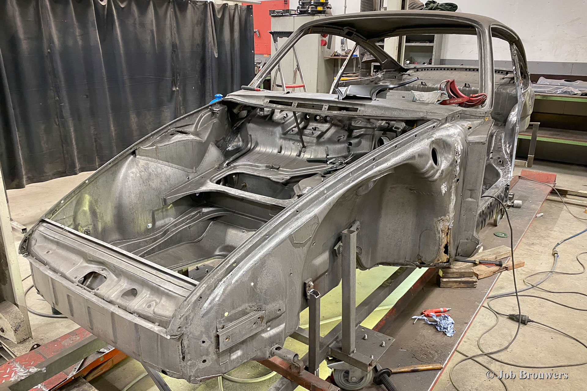 Dieser 1968er Porsche 911 2 Liter Short Wheelbase (SWB) erhielt eine komplette Körper Restaurierung bei Classic Job. Als der Besitzer das Auto kaufte, sah es ziemlich gut aus, da es in der Vergangenheit „restauriert“ wurde. Bald stellte sich heraus, dass die Qualität der Karosserie nicht so war, wie sie sein sollte, und das Auto wurde zu Classic Job gebracht, um alles in Ordnung zu bringen. Es wurde festgestellt, dass die Bodenplatten „verdoppelt“ waren, sodass der Eigentümer beschloss, das Auto ordnungsgemäß restaurieren zu lassen. Das Auto wurde abgestreift, und die Karosserie wurde abgeschickt, um alle Farben und Beschichtungen in einem speziellen Bad abziehen zu lassen. Auf den Fotos sehen Sie jetzt die „nackte“ Karosserie und all die schlecht ausgeführten Blecharbeiten, die daran vorgenommen wurden, und den restlichen Rost. An der Karosserie müssten viele Blecharbeiten durchgeführt werden.