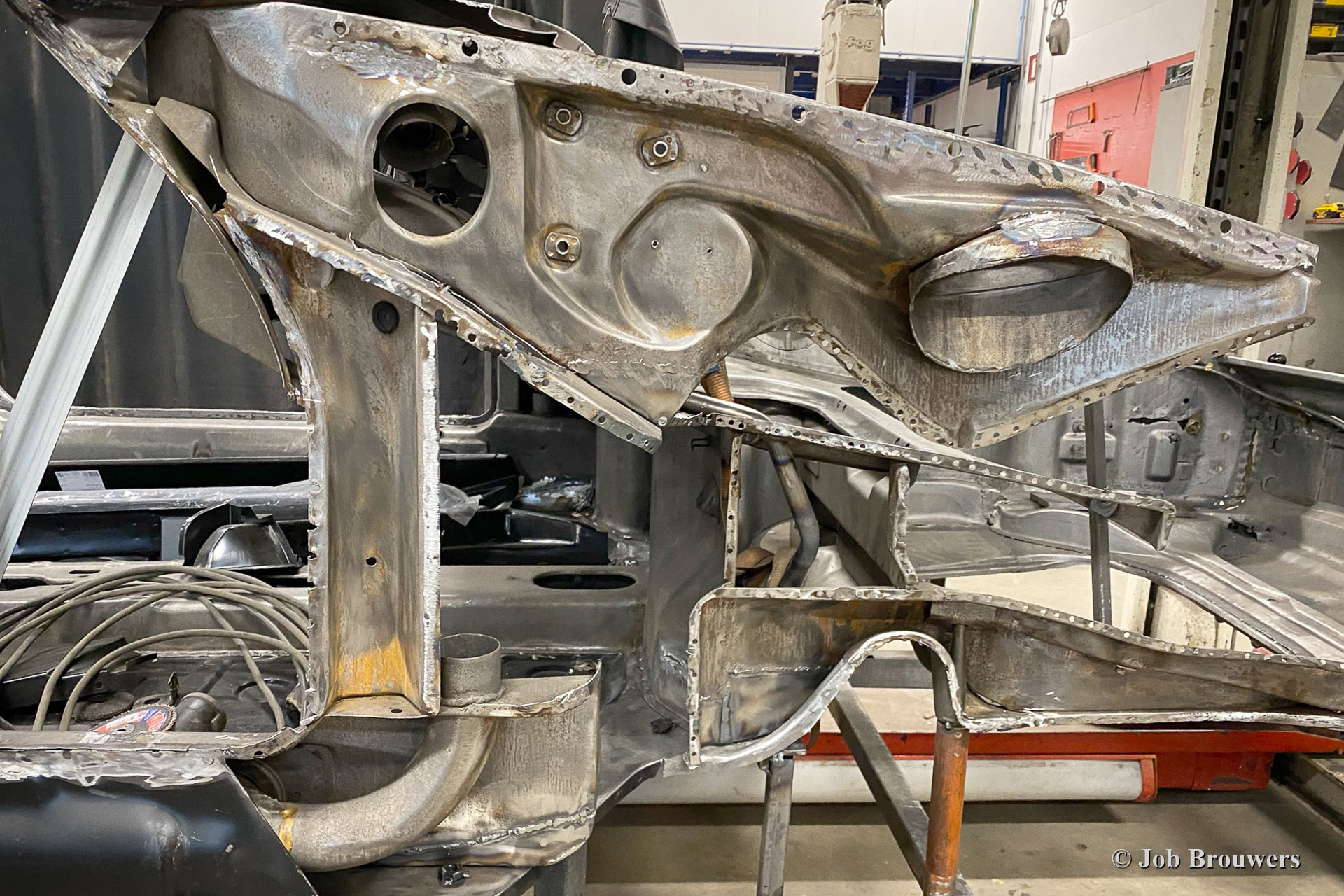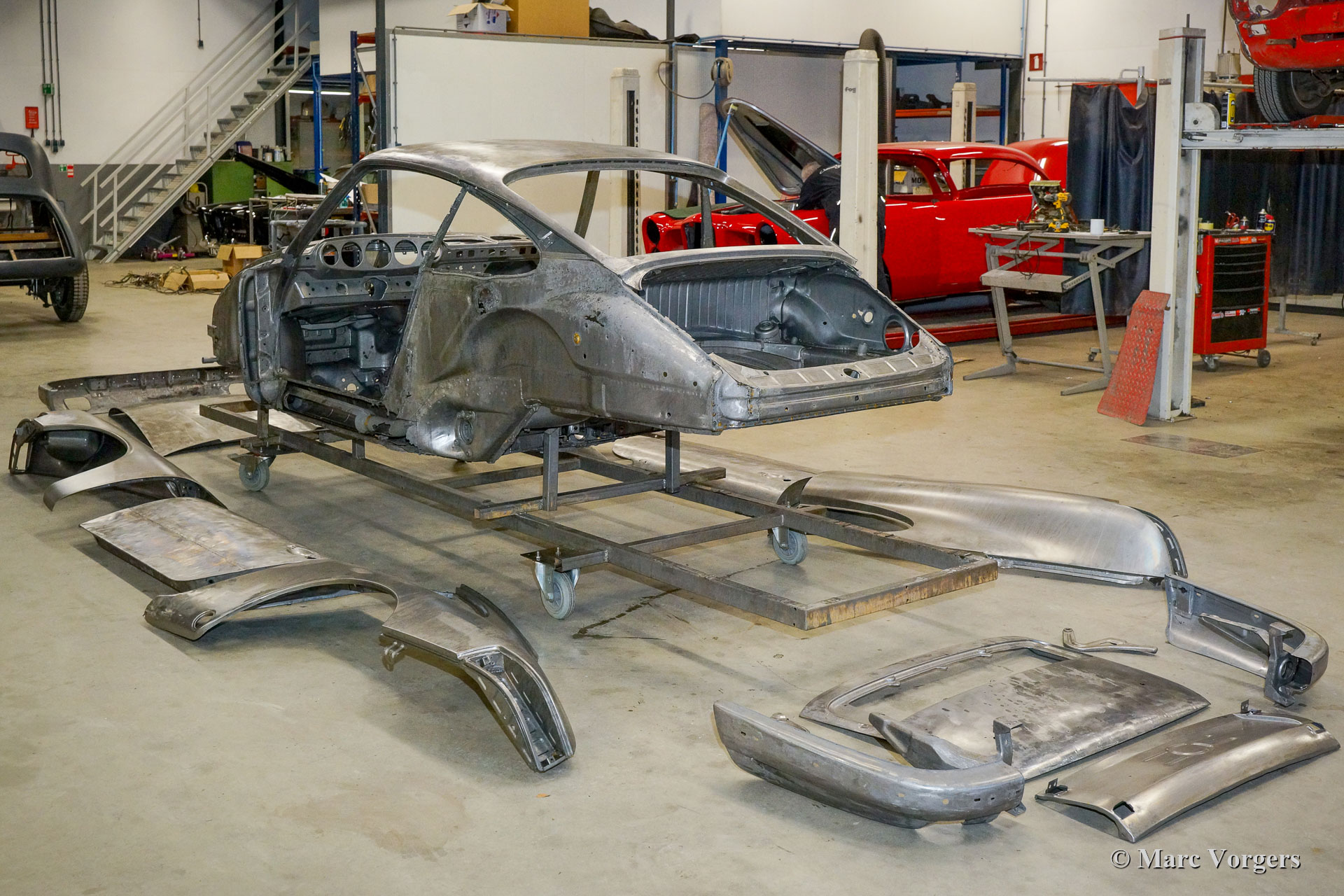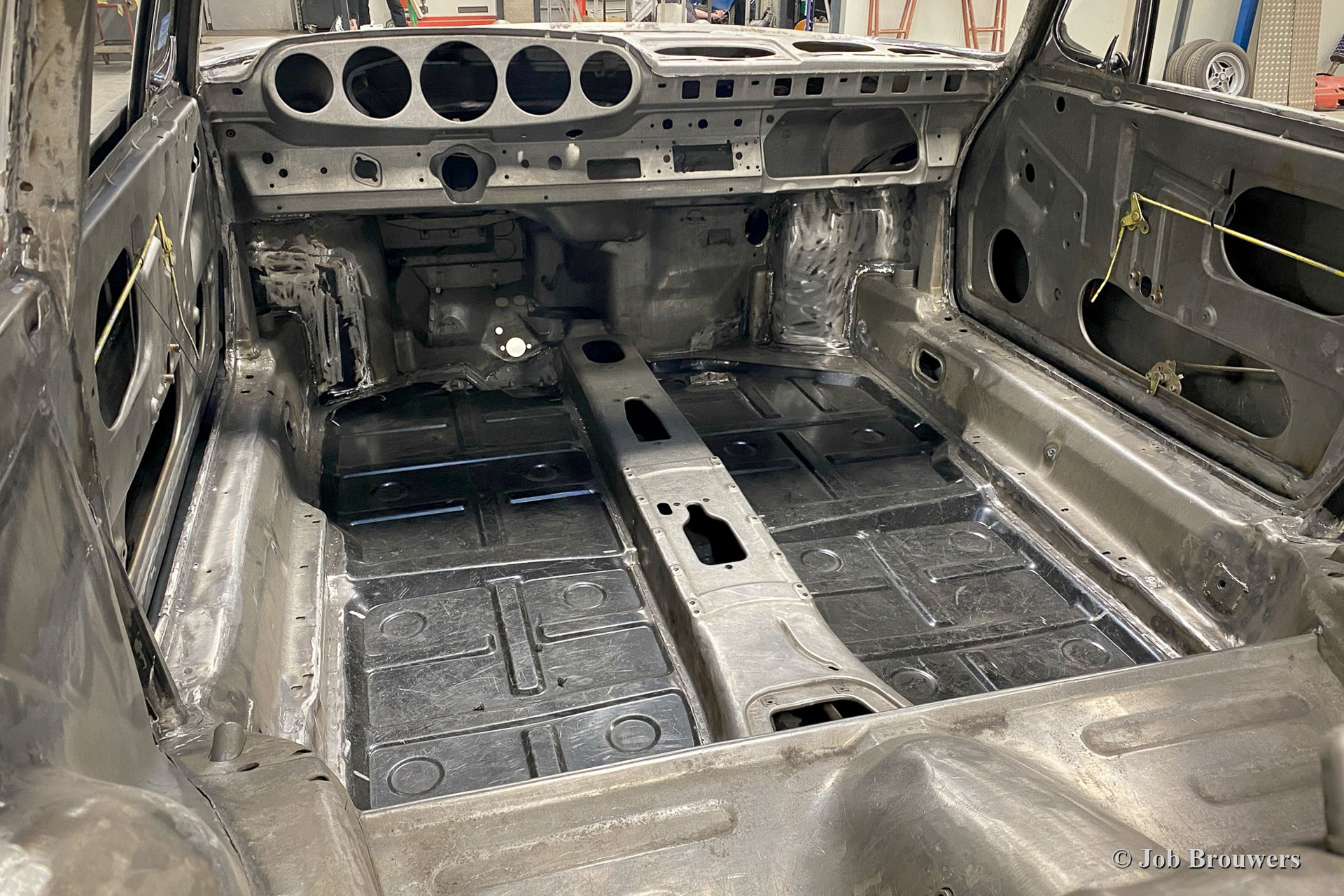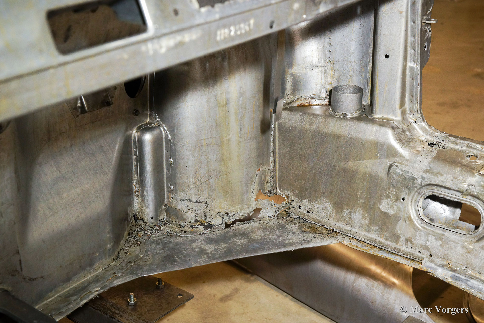 Dieser 1968er Porsche 911 2 Liter Short Wheelbase (SWB) erhielt eine komplette Körper Restaurierung bei Classic Job. Als der Besitzer das Auto kaufte, sah es ziemlich gut aus, da es in der Vergangenheit „restauriert“ wurde. Bald stellte sich heraus, dass die Qualität der Karosserie nicht so war, wie sie sein sollte, und das Auto wurde zu Classic Job gebracht, um alles in Ordnung zu bringen. Es wurde festgestellt, dass die Bodenplatten „verdoppelt“ waren, sodass der Eigentümer beschloss, das Auto ordnungsgemäß restaurieren zu lassen. Das Auto wurde abgestreift, und die Karosserie wurde abgeschickt, um alle Farben und Beschichtungen in einem speziellen Bad abziehen zu lassen. Auf den Fotos sehen Sie jetzt die „nackte“ Karosserie und all die schlecht ausgeführten Blecharbeiten, die daran vorgenommen wurden, und den restlichen Rost. An der Karosserie müssten viele Blecharbeiten durchgeführt werden.
