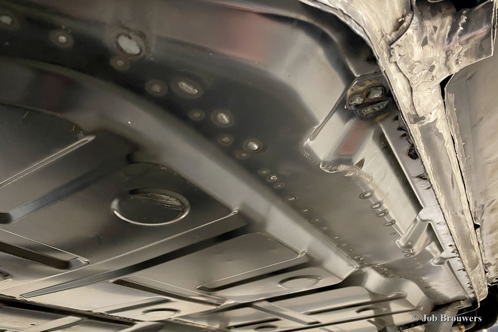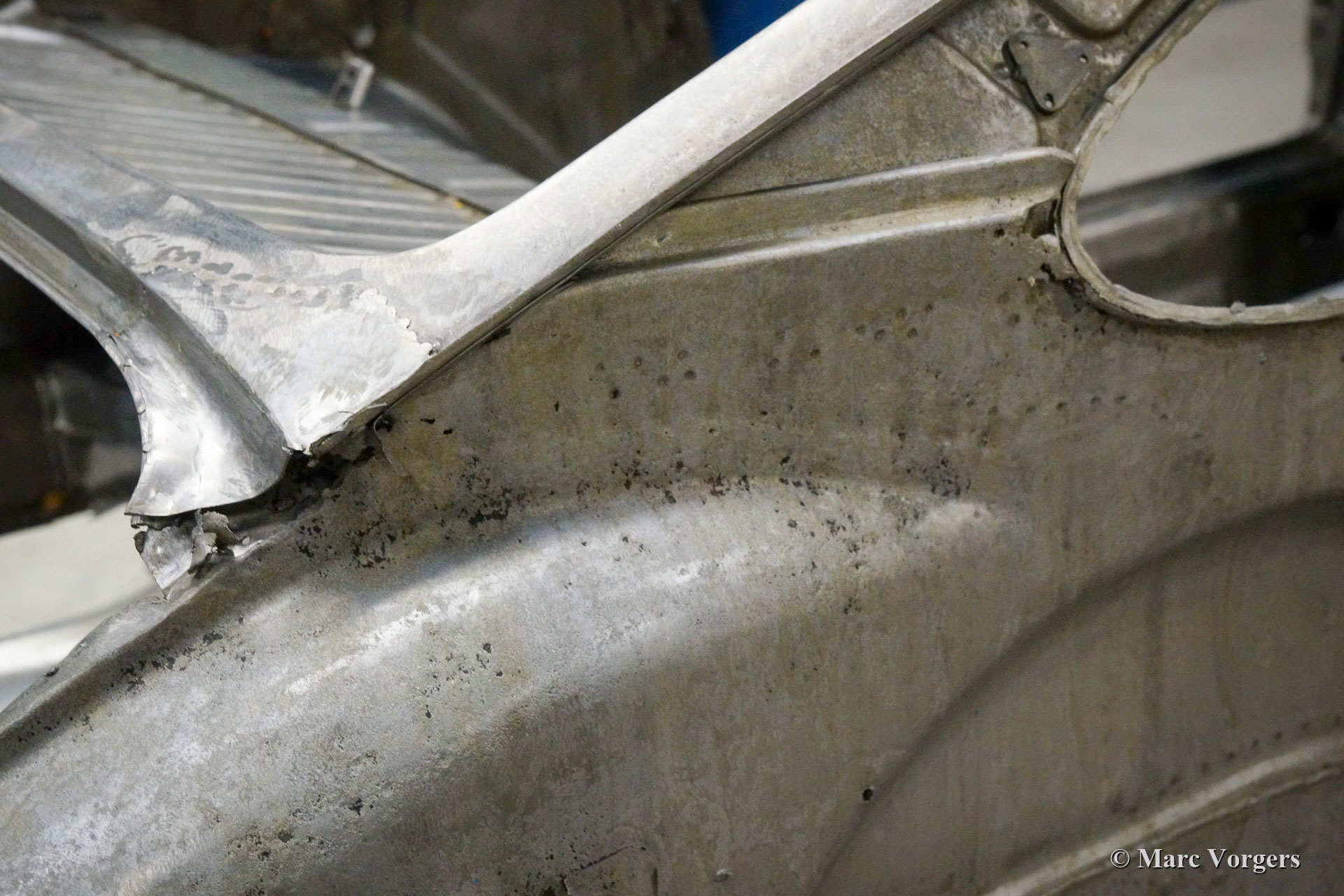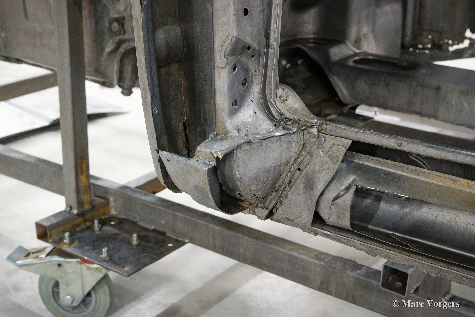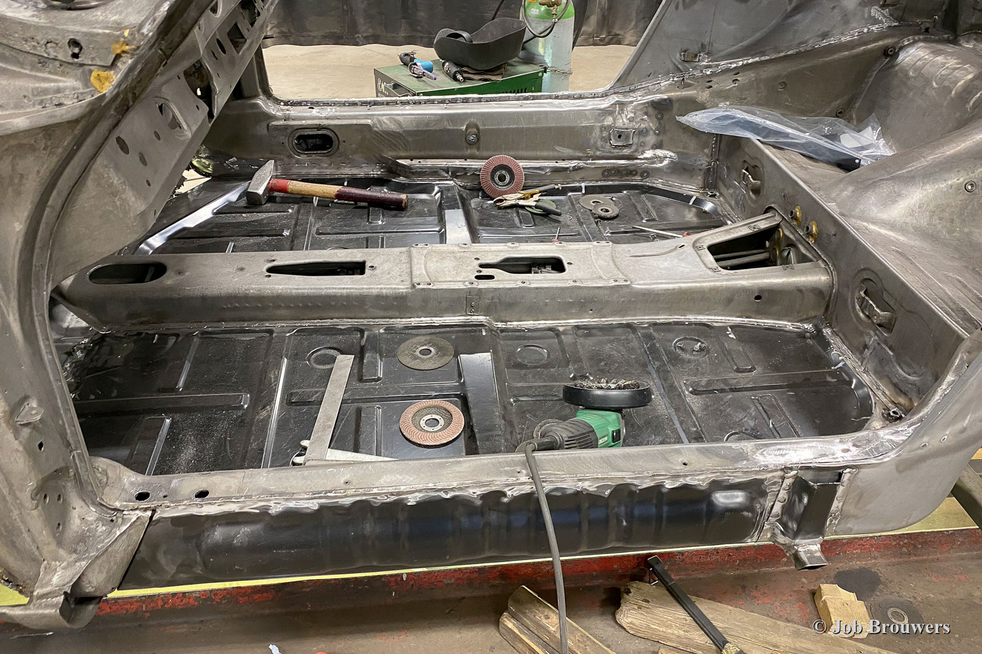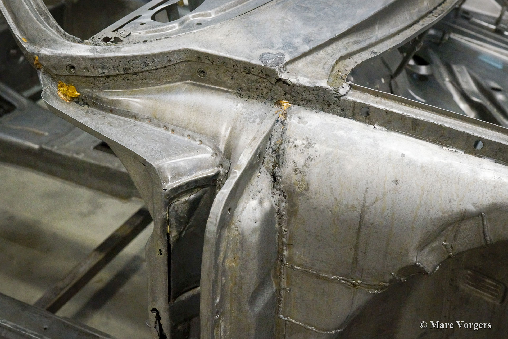 Dieser 1968er Porsche 911 2 Liter Short Wheelbase (SWB) erhielt eine komplette Körper Restaurierung bei Classic Job. Als der Besitzer das Auto kaufte, sah es ziemlich gut aus, da es in der Vergangenheit „restauriert“ wurde. Bald stellte sich heraus, dass die Qualität der Karosserie nicht so war, wie sie sein sollte, und das Auto wurde zu Classic Job gebracht, um alles in Ordnung zu bringen. Es wurde festgestellt, dass die Bodenplatten „verdoppelt“ waren, sodass der Eigentümer beschloss, das Auto ordnungsgemäß restaurieren zu lassen. Das Auto wurde abgestreift, und die Karosserie wurde abgeschickt, um alle Farben und Beschichtungen in einem speziellen Bad abziehen zu lassen. Auf den Fotos sehen Sie jetzt die „nackte“ Karosserie und all die schlecht ausgeführten Blecharbeiten, die daran vorgenommen wurden, und den restlichen Rost. An der Karosserie müssten viele Blecharbeiten durchgeführt werden.